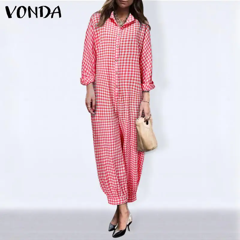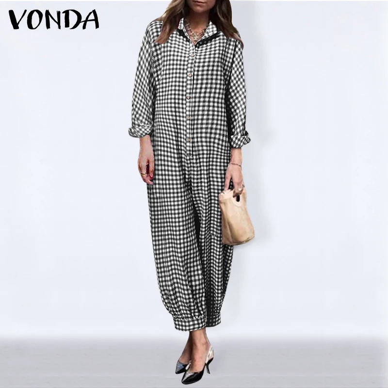 Женский комбинезон в клетку VONDA, винтажный повседневный комбинезон с длинным рукавом и отложным воротником, свободный офисный комбинезон, 2021