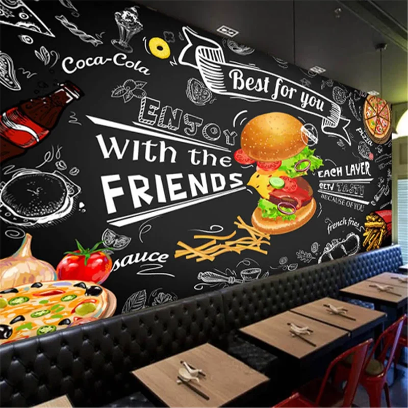 Пользовательские Западная Фастфуд гамбургеры Ресторан черный фон настенная бумага 3D снэк-бар гамбургер пицца настенная бумага 3D