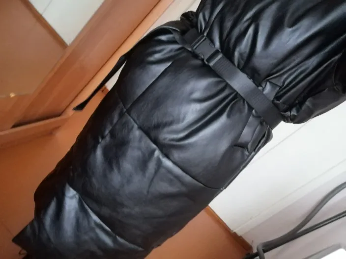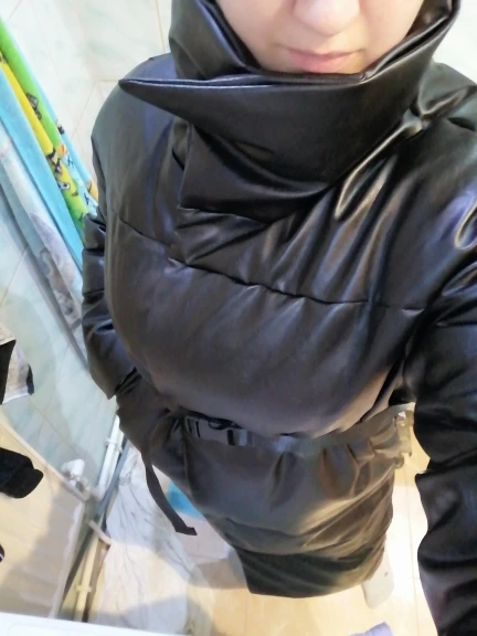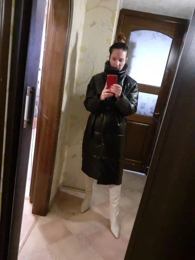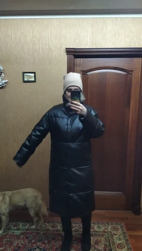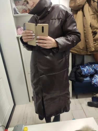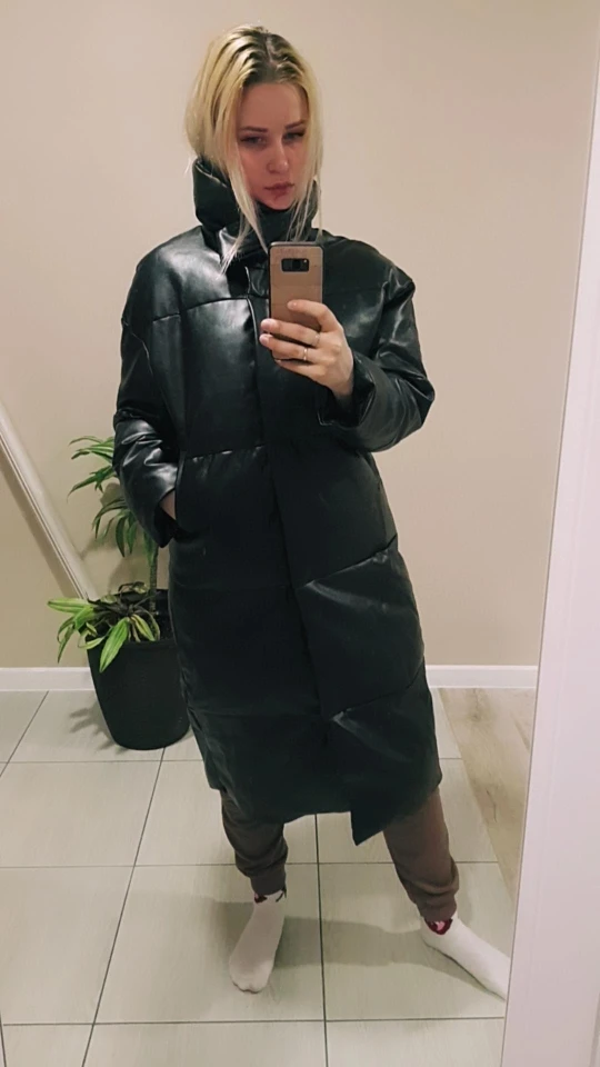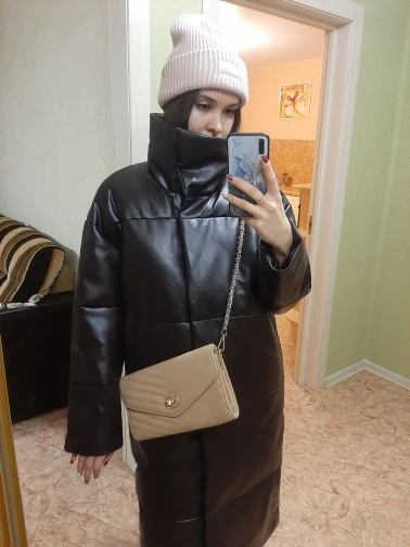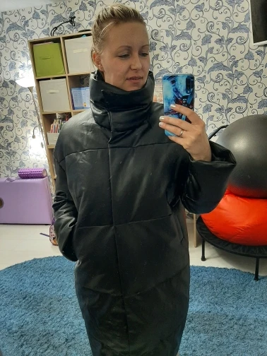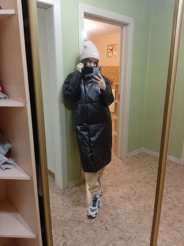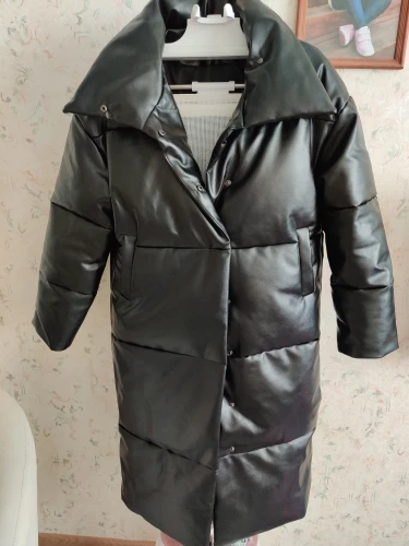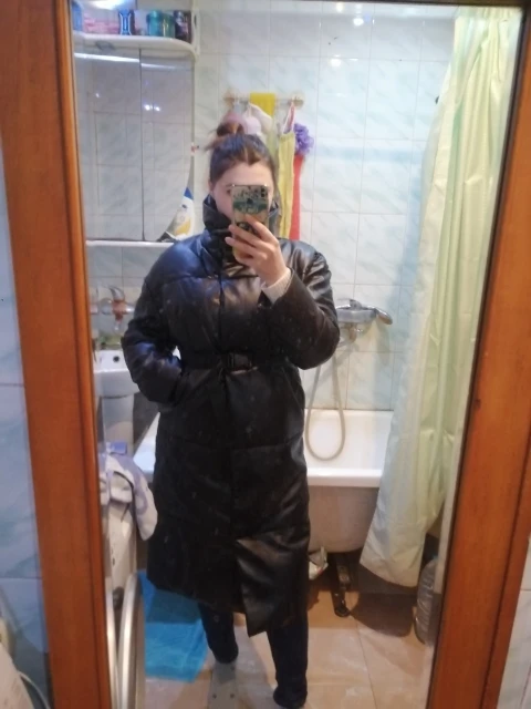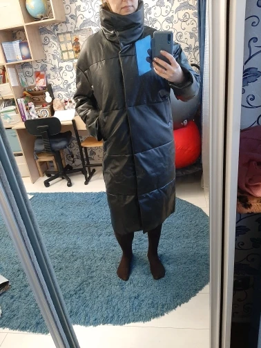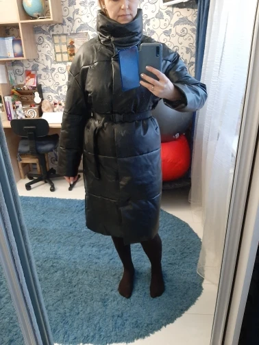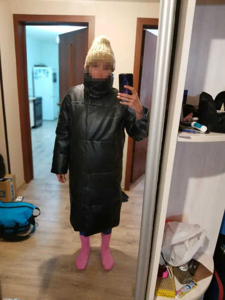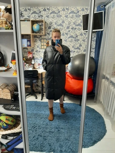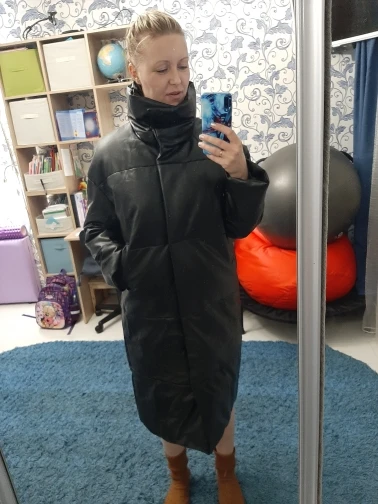 Пуховик рассчитан на еврозиму, т.е. до -10° - -15°. Об этом продавец говорит сразу. Набит равномерно, в воротнике есть наполнитель и он стоит, не падает. Если плотно обмотать шею объемным шарфом, платком, то воротник застегнуть туго, но вообще застёгивать воротник у данного фасона дело вкуса. Мне не очень удобно, когда он застегнут. Фасон пуховика сделан в стиле оверсайз. Обратите внимание, что шов у рукава ниже плеча. Длина рукавов оптимальная. У меня рост 164 см. Длина пуховика ниже колена. Застёгивается пуховик на клёпки, молнии нет. Кнопки держат достаточно хорошо, на ходу пуховик не расстегивается. Яркого запаха кожзама у изделия нет. Присутствует лишь небольшой аромат, который не будет заметен через пару дней. Кожзам достаточно мягкий, при указанных температурах не становится грубым. Мои параметры: 86/60/90. Продавец сразу передал заказ на отправку как была проведена оплата.