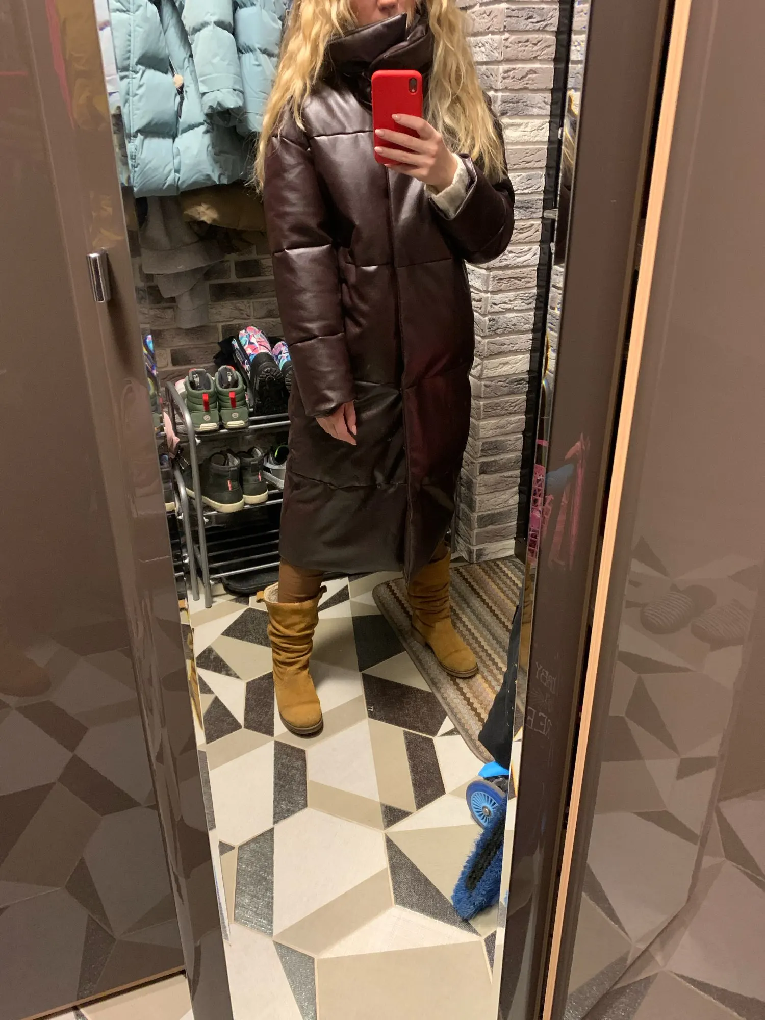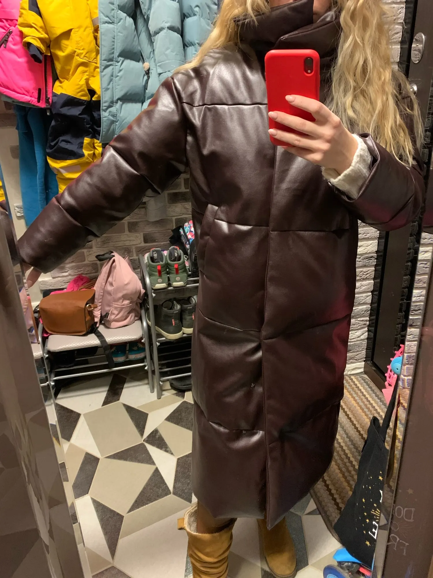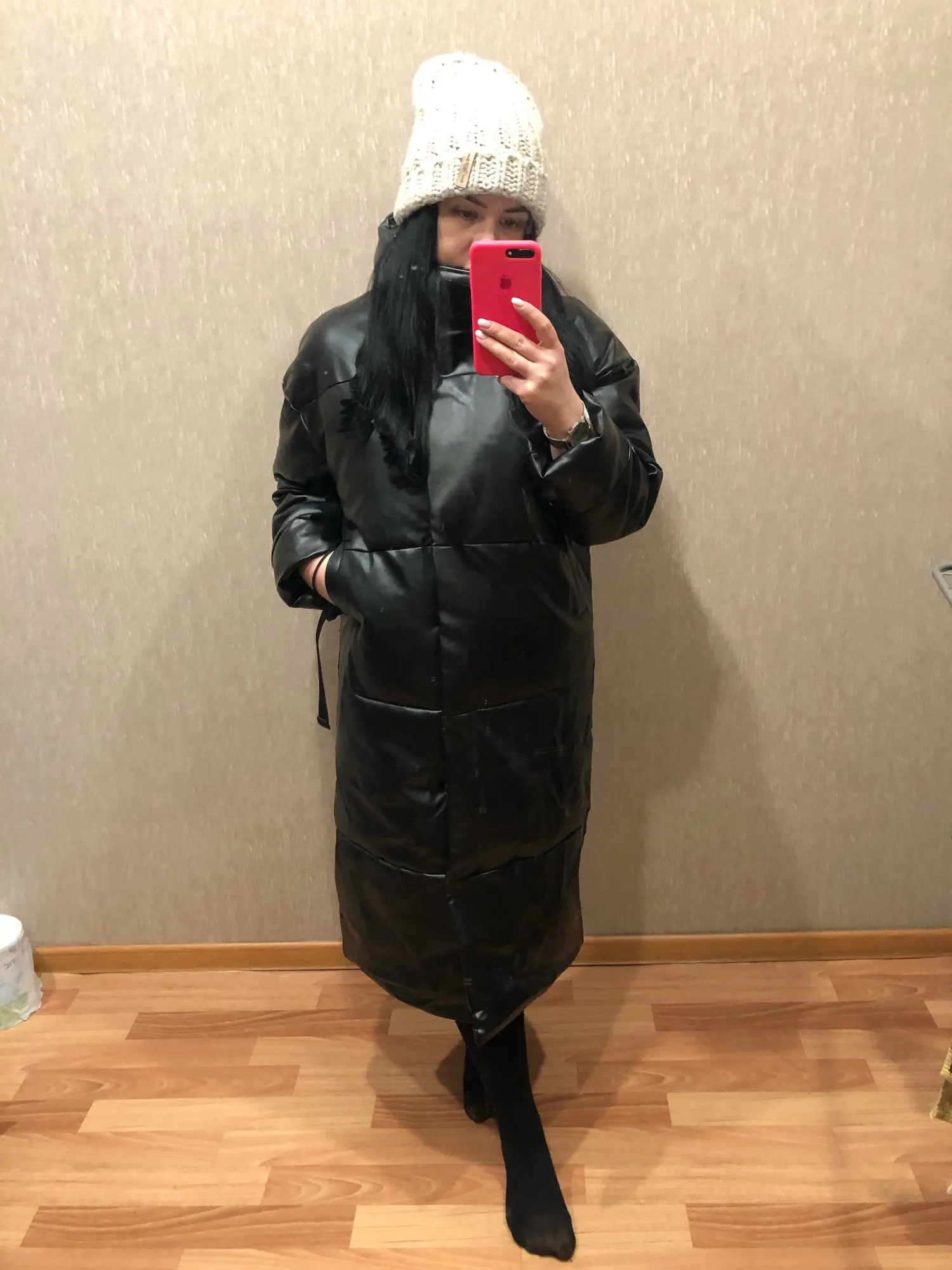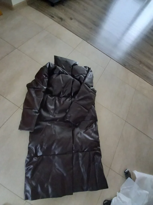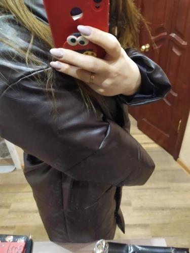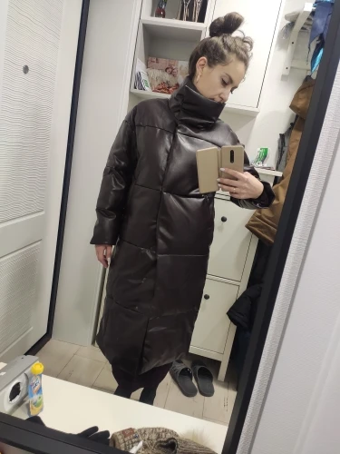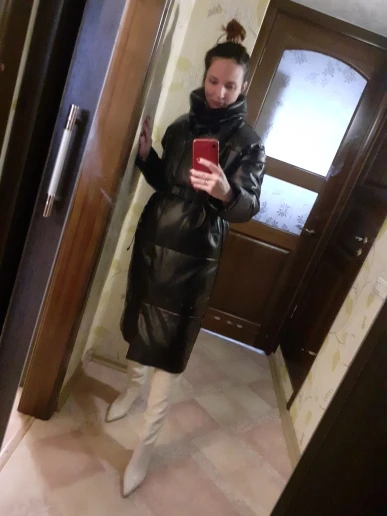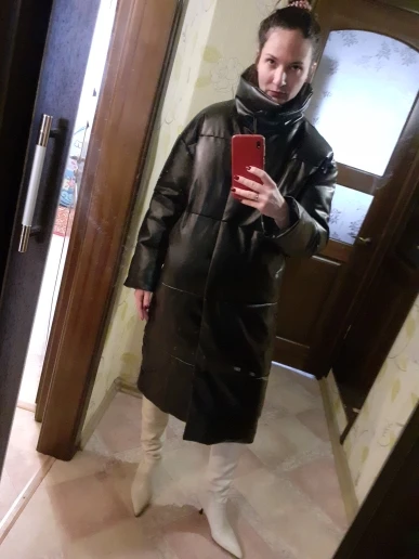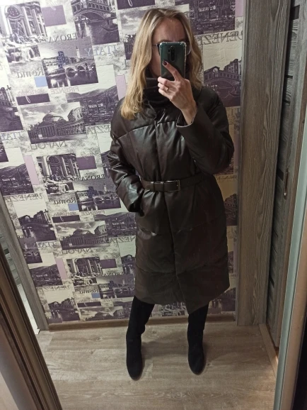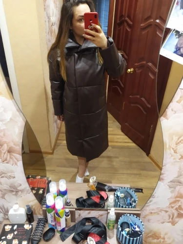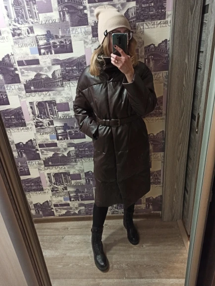 Кож зам плотный, цвет винный очень красивый. Наполнитель в рукавах не равномерно распределён, возможно ещё не расправился после транспортировки. Запах очень незначительный присутствует. На мои параметры 90/76/106 не впритык, но и объемный свитер не поддеть, в бёдрах будет узко, водолазкой и джинсами ок. Рост 157, длина отличная ниже колена см на 10 (см фото), рукава длины немного 2 см можно убрать. Качество пошива отличное, рекомендую за такую цену!! С продавцом не общалась, но заказ выслал очень оперативно - на следующий день.