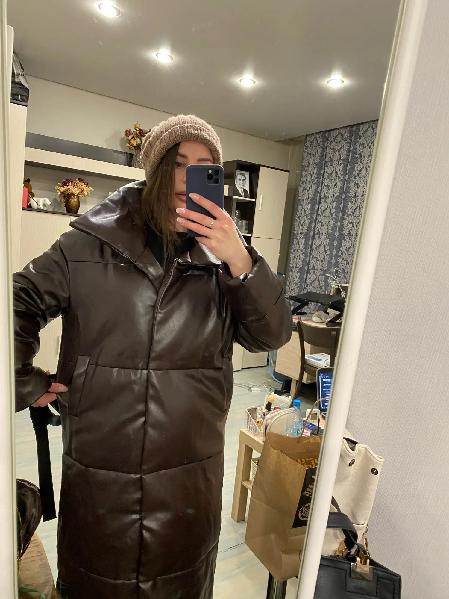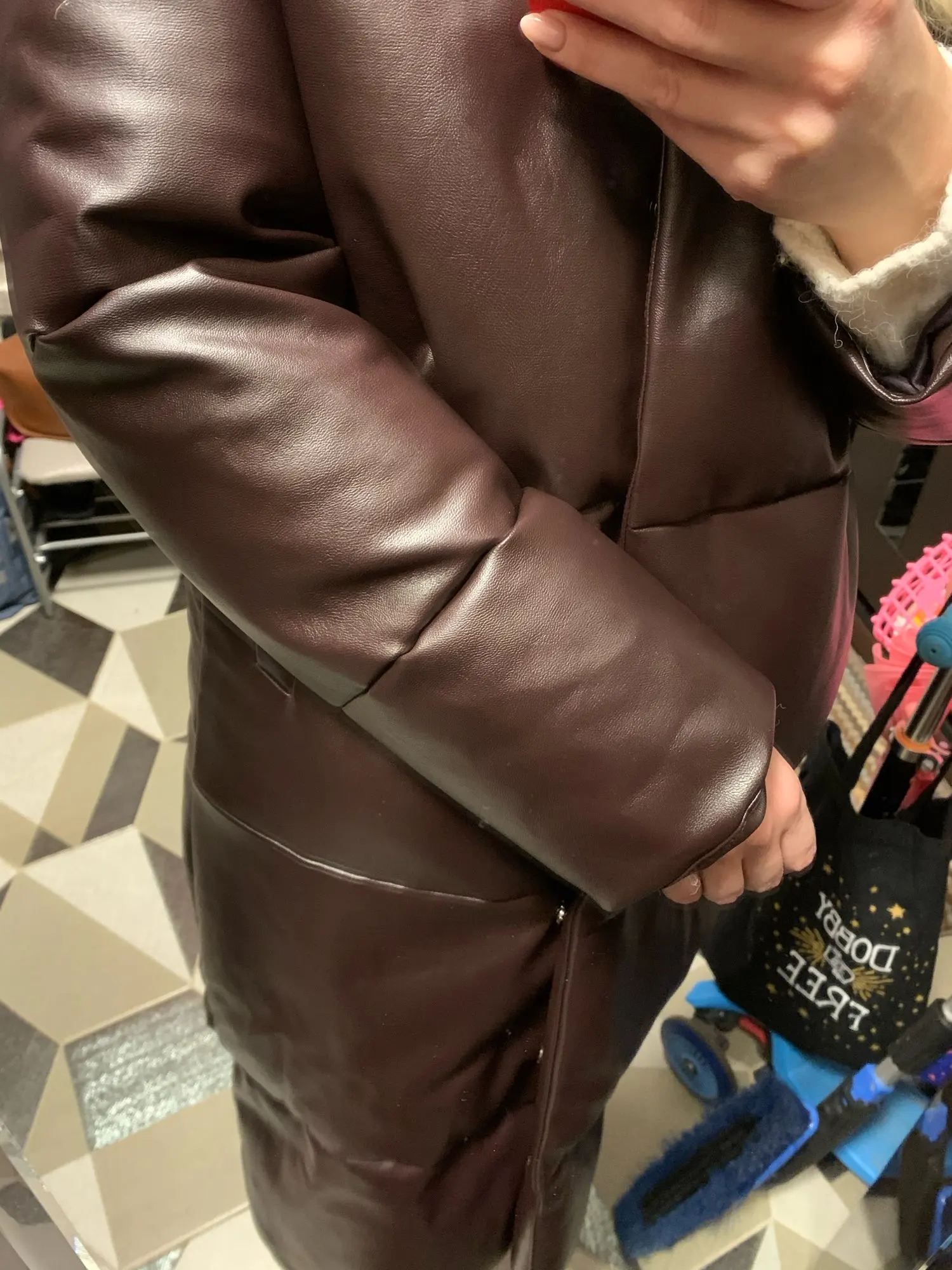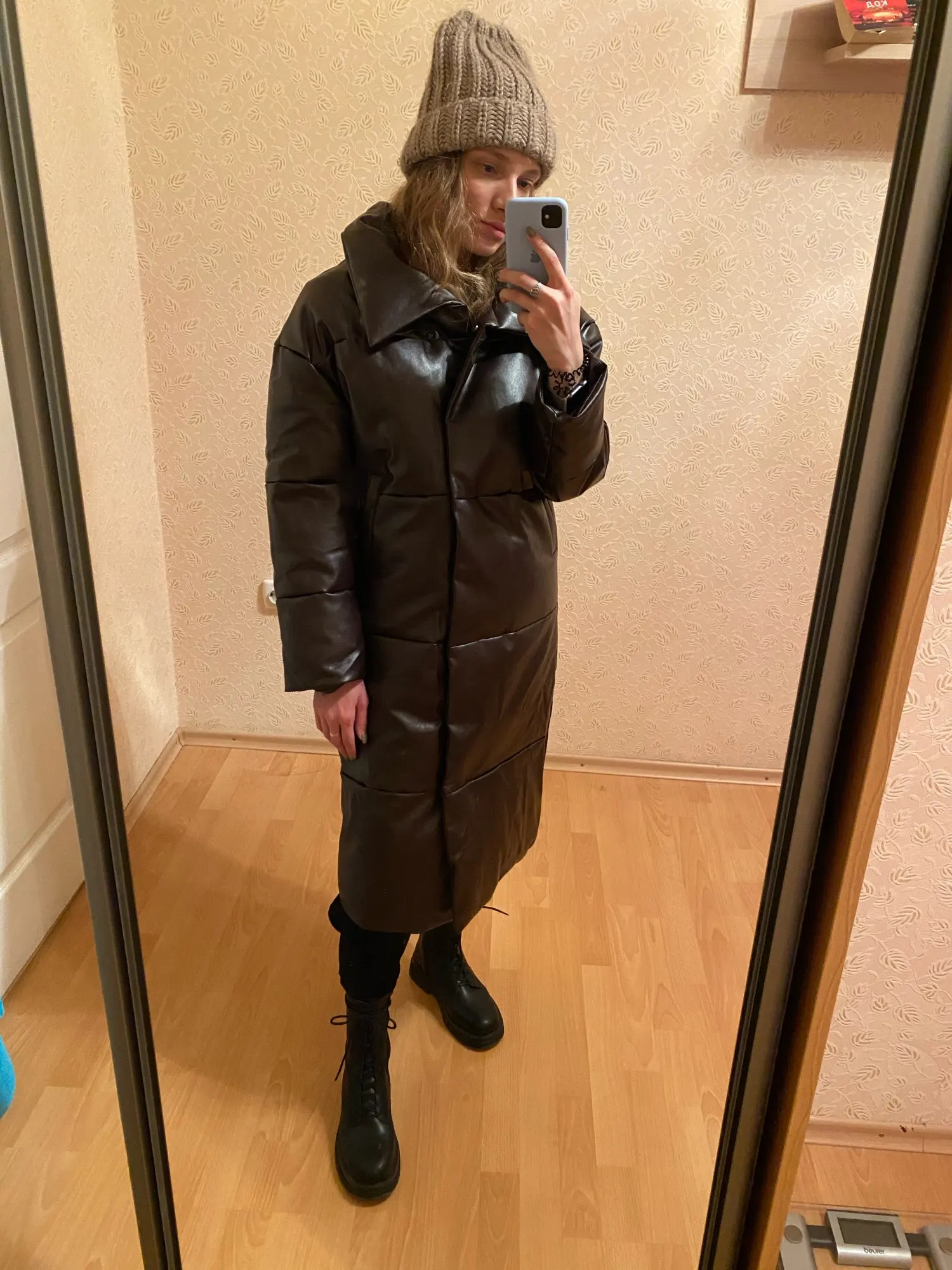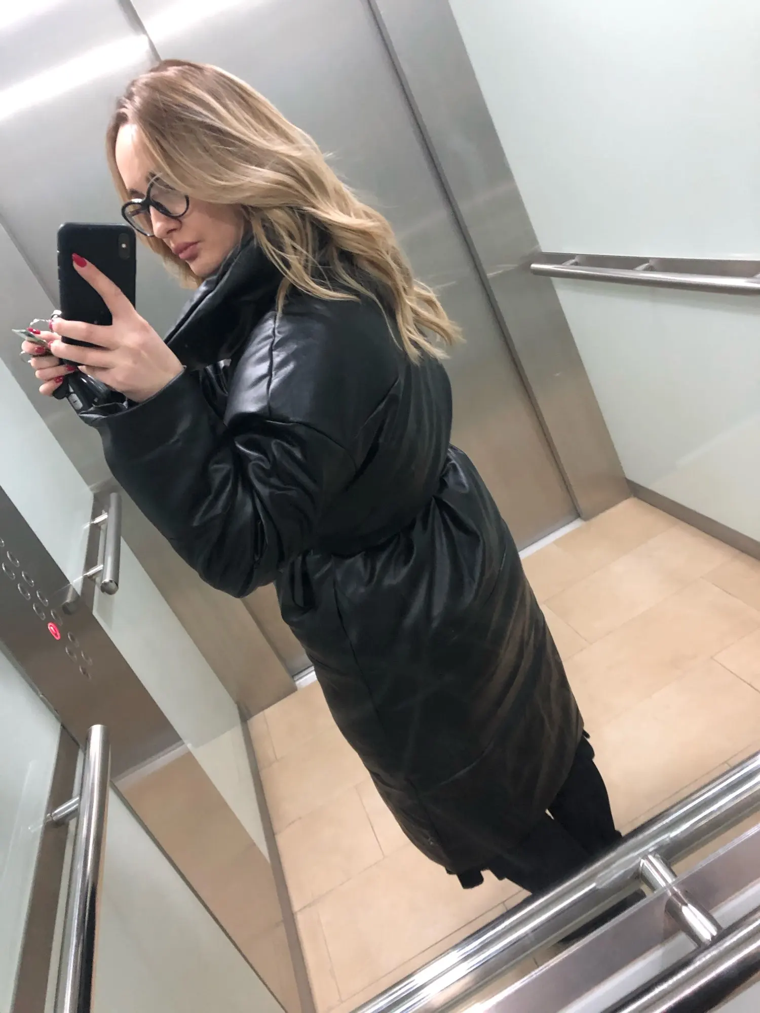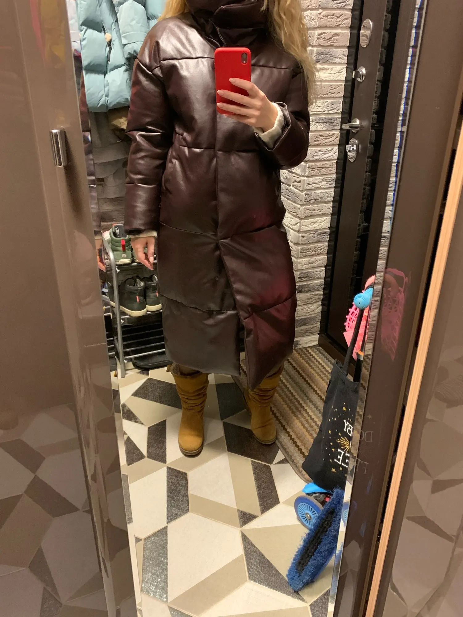 Кож зам плотный, цвет винный очень красивый. Наполнитель в рукавах не равномерно распределён, возможно ещё не расправился после транспортировки. Запах очень незначительный присутствует. На мои параметры 90/76/106 не впритык, но и объемный свитер не поддеть, в бёдрах будет узко, водолазкой и джинсами ок. Рост 157, длина отличная ниже колена см на 10 (см фото), рукава длины немного 2 см можно убрать. Качество пошива отличное, рекомендую за такую цену!! С продавцом не общалась, но заказ выслал очень оперативно - на следующий день.