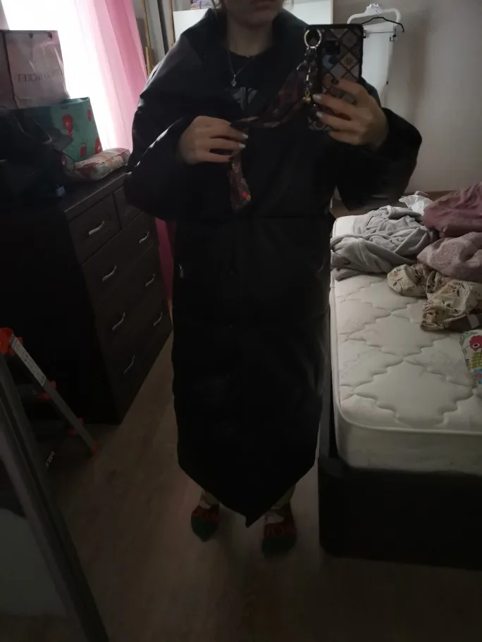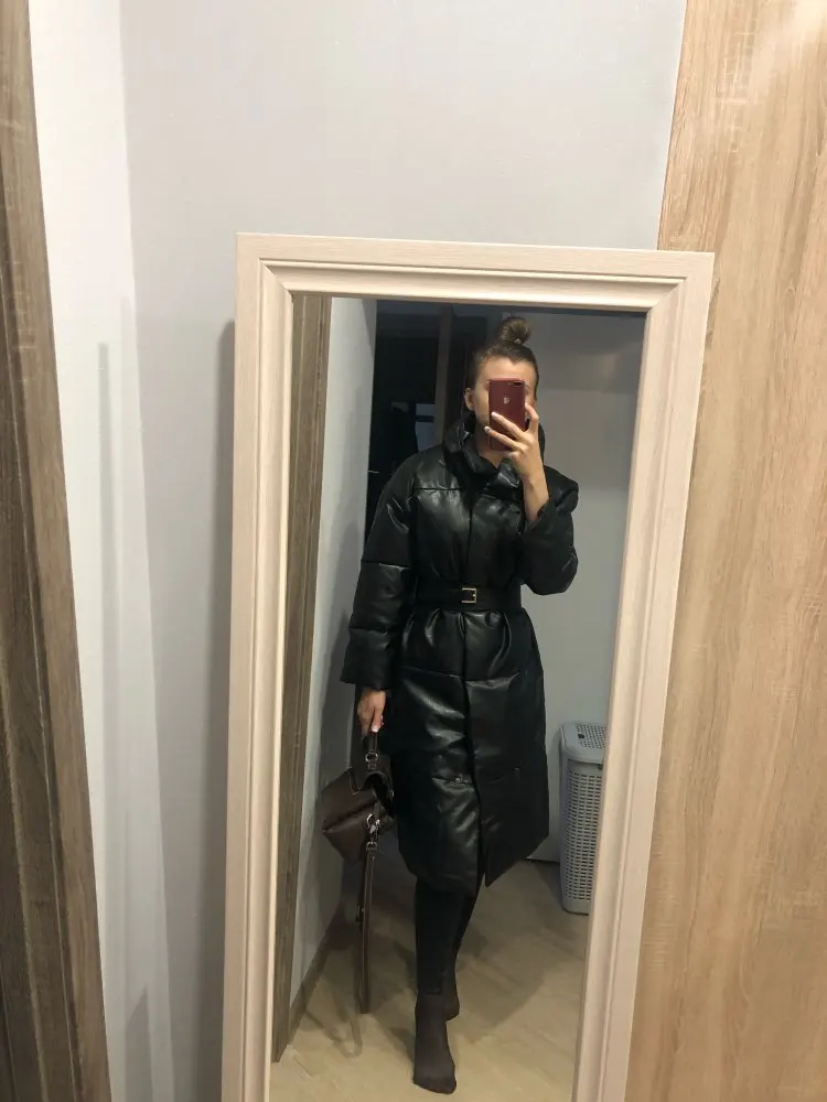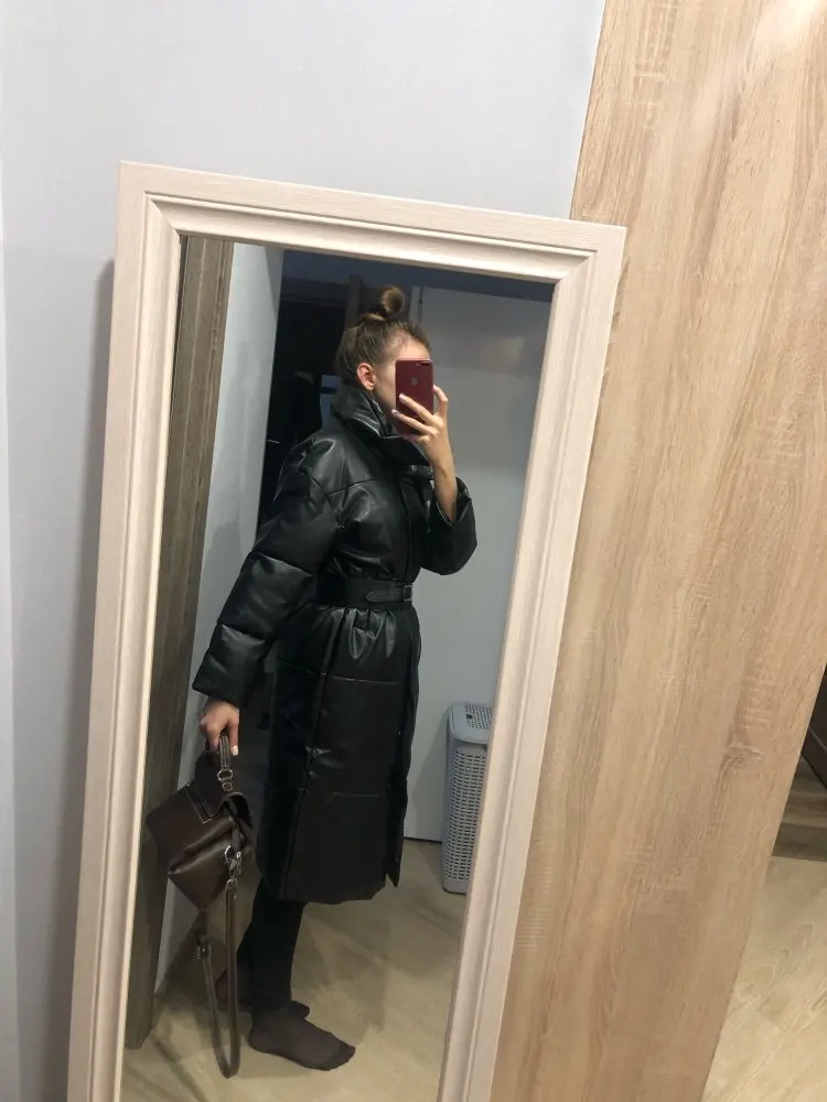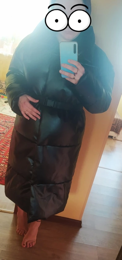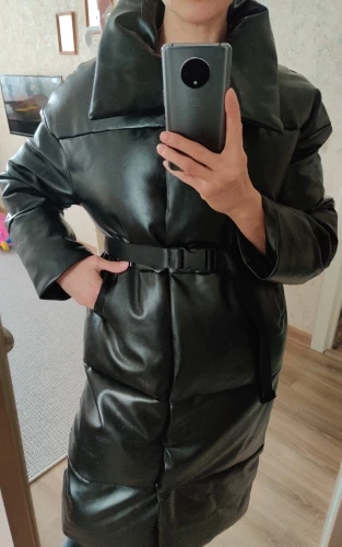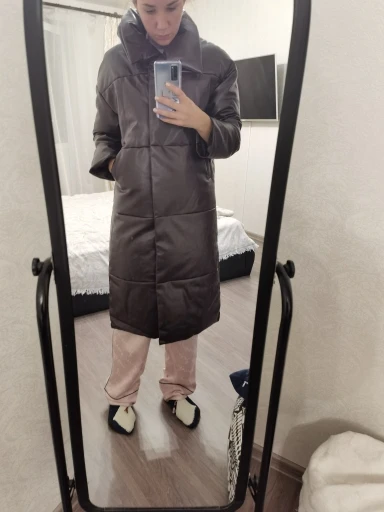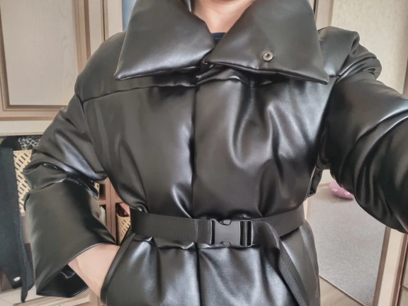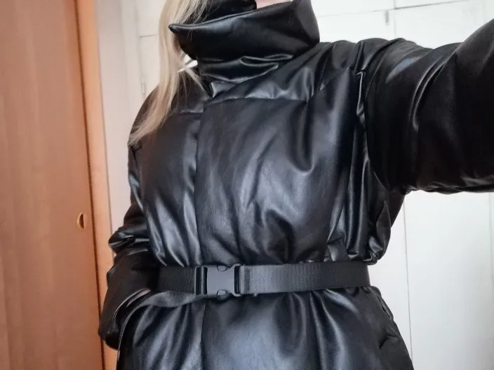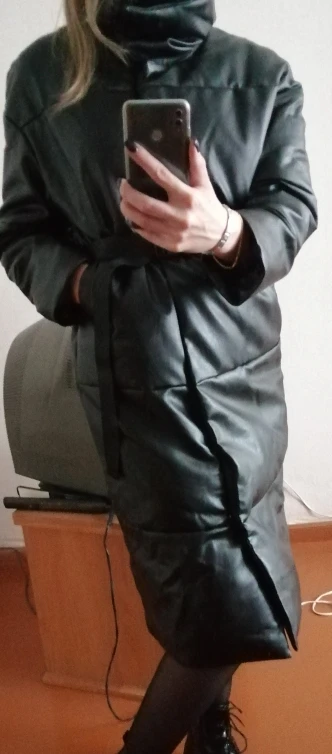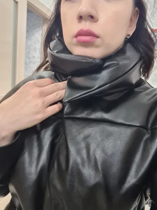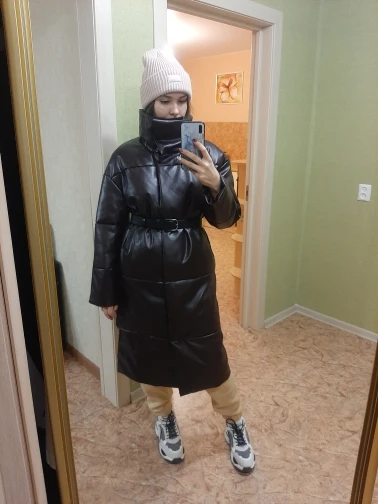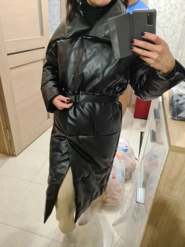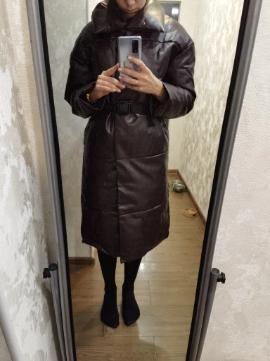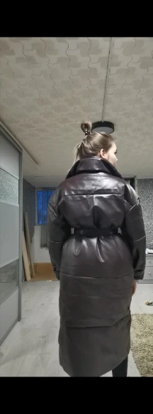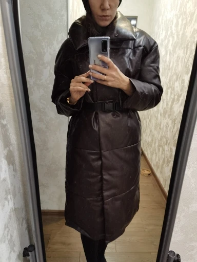Доставка быстрая, 2 недели. Упакована в индивидуальную упаковку на застежке. Качество куртки отличное, экокожа. Наполнителя внутри очень мало и лежит не очень равномерно. Но за счет плотного материала непродуваема. Клепки надёжно пришиты и при ходьбе не расстегиваются, как писали в других отзывах. Воротник очень высокий, но можно и расстегнуть. Красиво и с ремнём, и без него. Единственное, тот ремень что в комплекте, не подходит. Буду носить со своим. По размеру: взяла М на русский S-M (90-67-98). Везде свободно, в бёдрах тоже. В размер S тоже бы влезла, но смотрелось бы совершенно по-другому, а я хотела как раз немного оверсайз. На рост 172 длина рукава хорошая (на фото видно), длина до середины голени. В целом очень довольна покупкой. Ультрамодная модель и качественная.