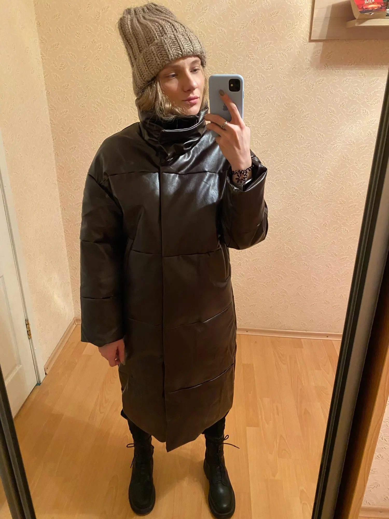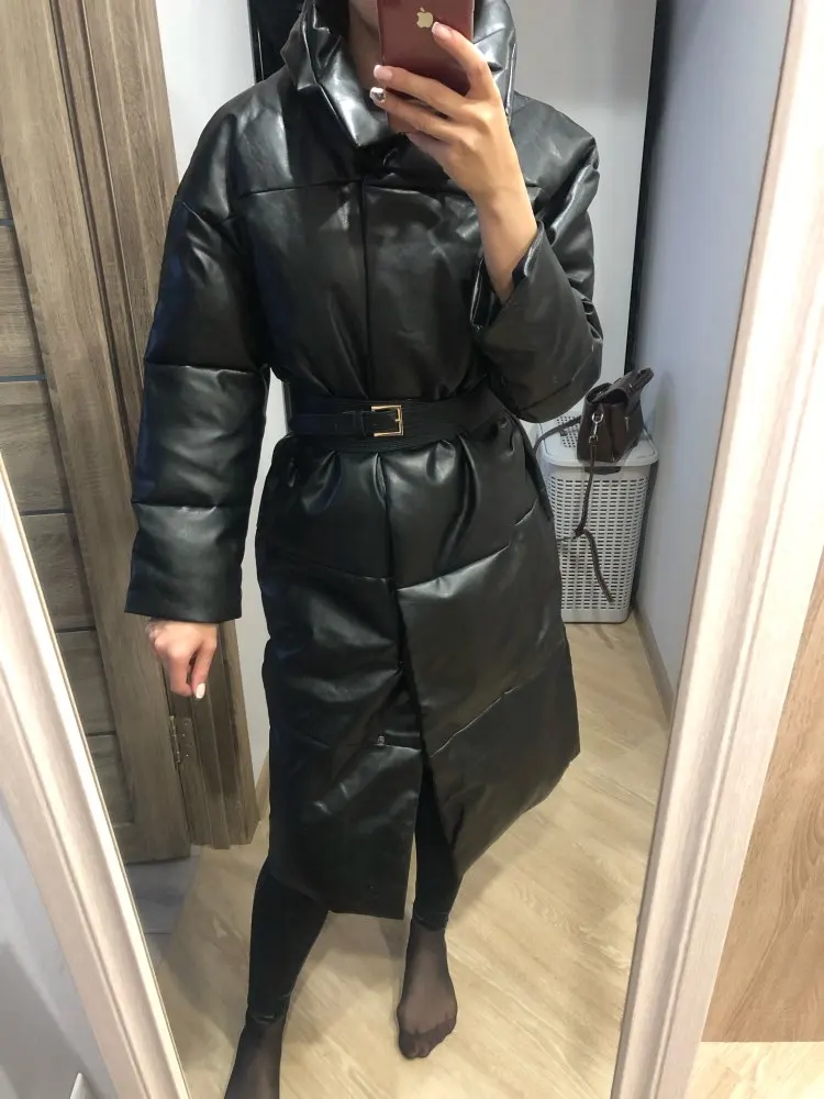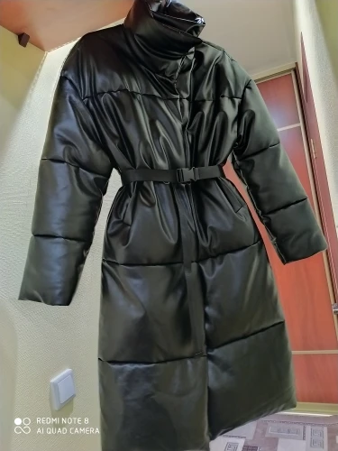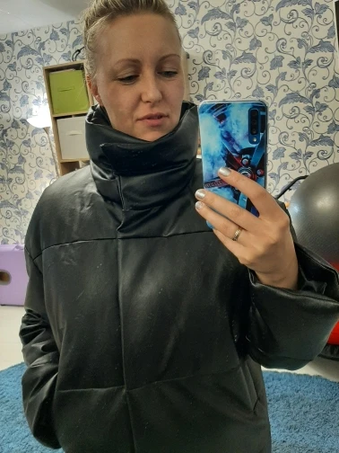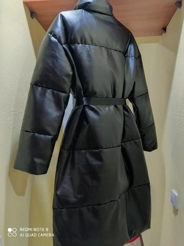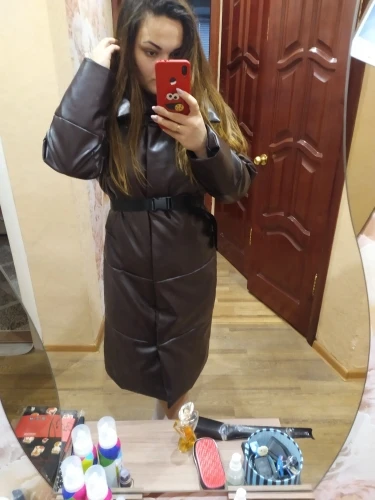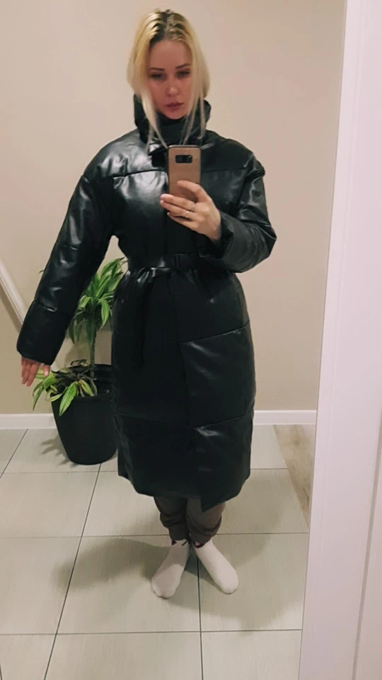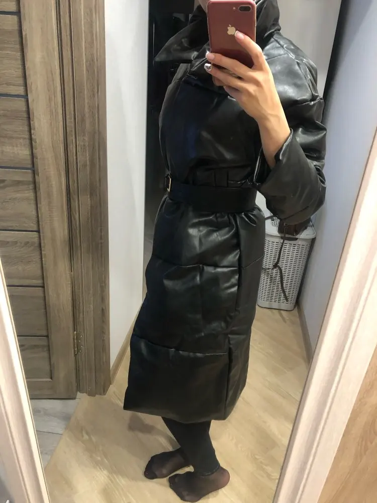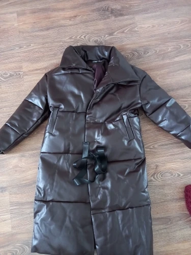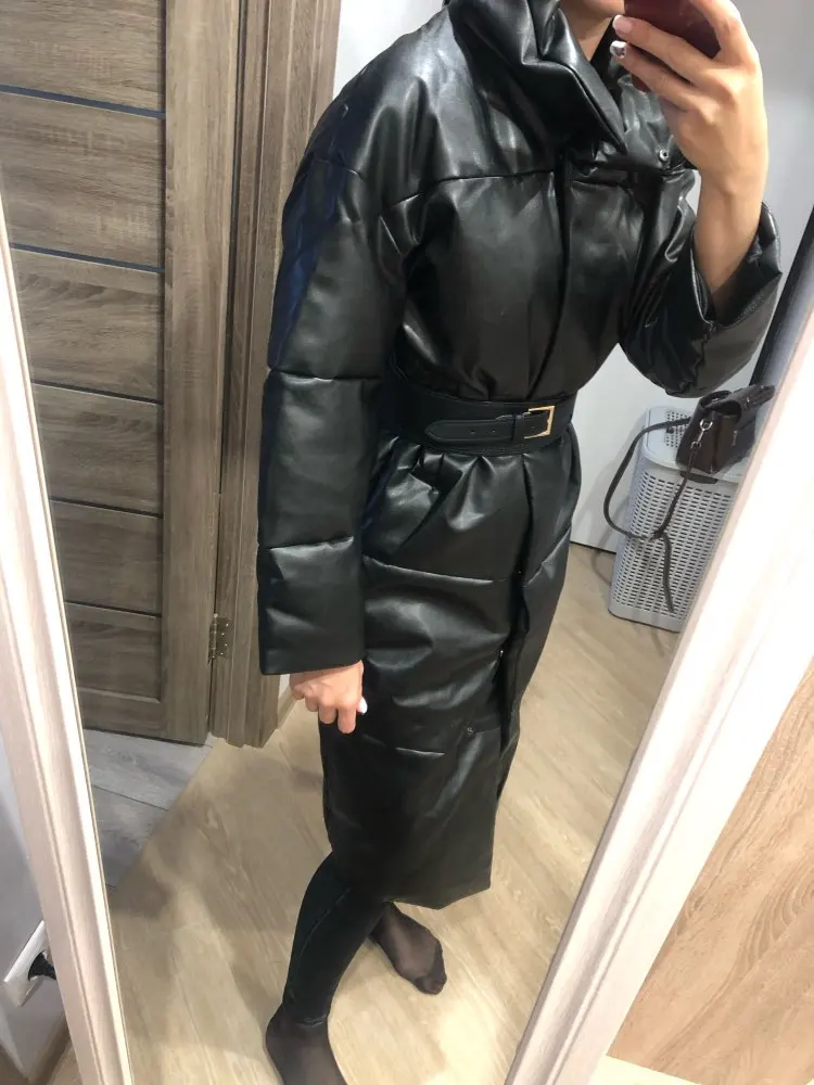 Доставка быстрая, 2 недели. Упакована в индивидуальную упаковку на застежке. Качество куртки отличное, экокожа. Наполнителя внутри очень мало и лежит не очень равномерно. Но за счет плотного материала непродуваема. Клепки надёжно пришиты и при ходьбе не расстегиваются, как писали в других отзывах. Воротник очень высокий, но можно и расстегнуть. Красиво и с ремнём, и без него. Единственное, тот ремень что в комплекте, не подходит. Буду носить со своим. По размеру: взяла М на русский S-M (90-67-98). Везде свободно, в бёдрах тоже. В размер S тоже бы влезла, но смотрелось бы совершенно по-другому, а я хотела как раз немного оверсайз. На рост 172 длина рукава хорошая (на фото видно), длина до середины голени. В целом очень довольна покупкой. Ультрамодная модель и качественная.