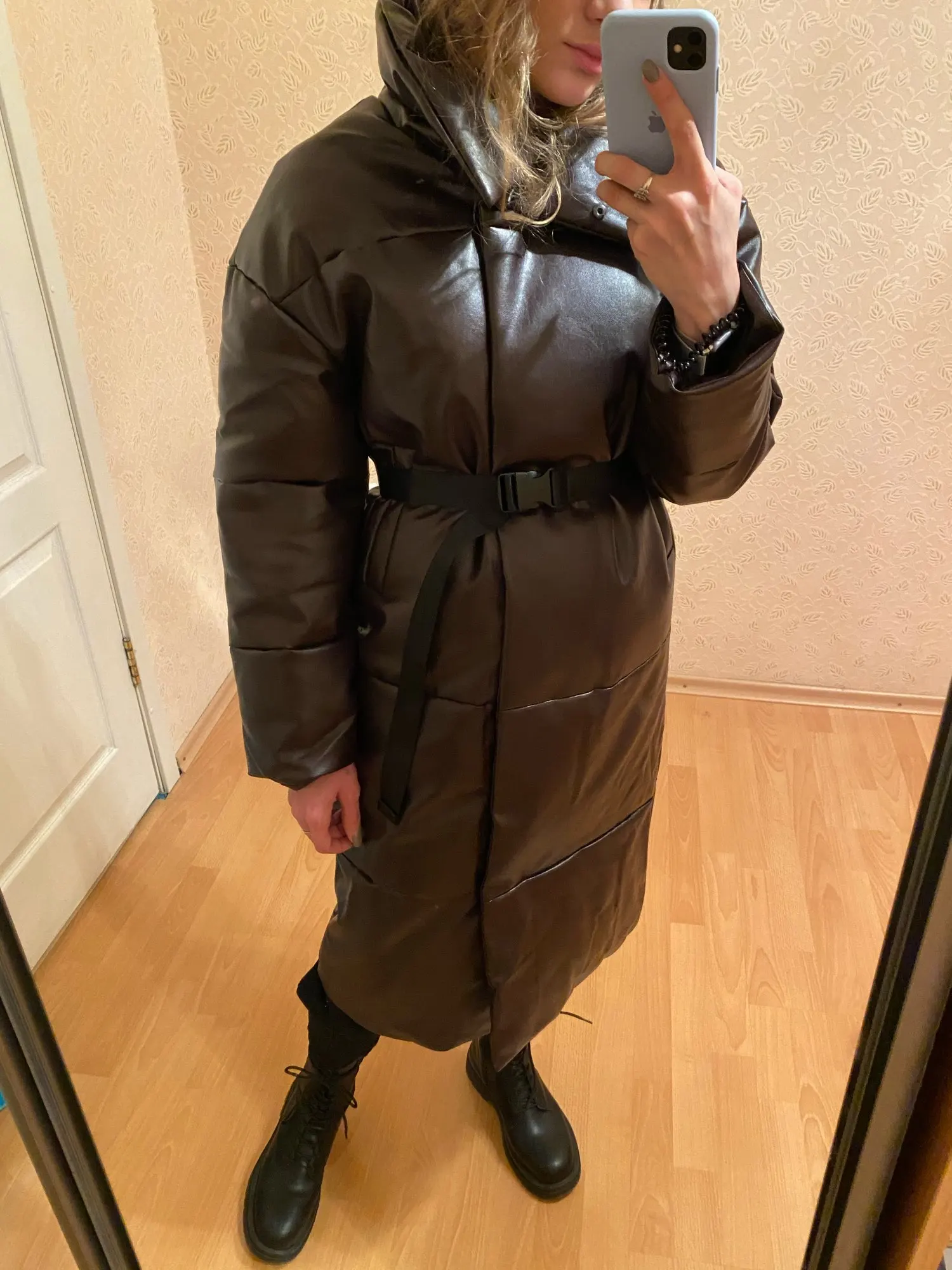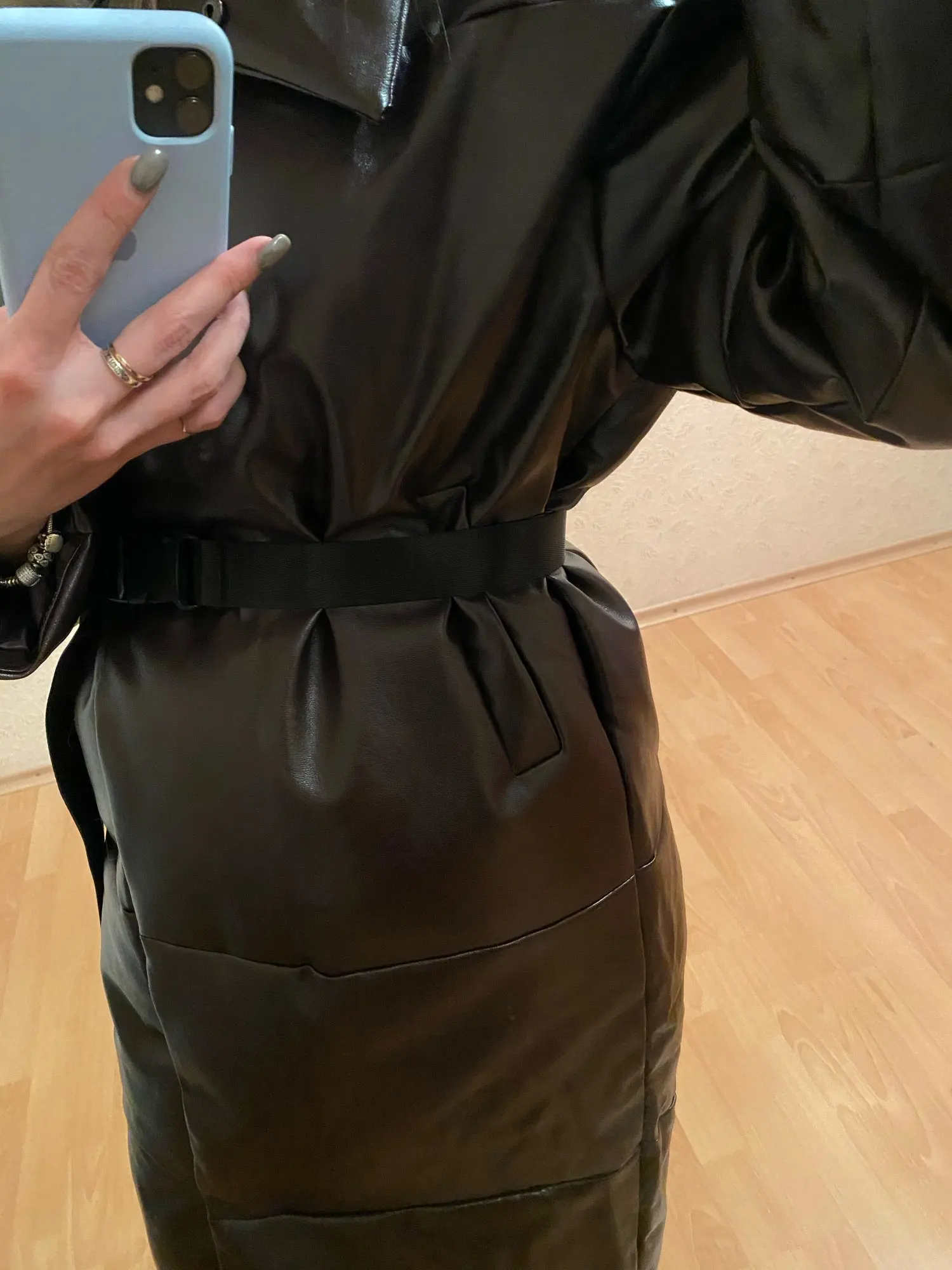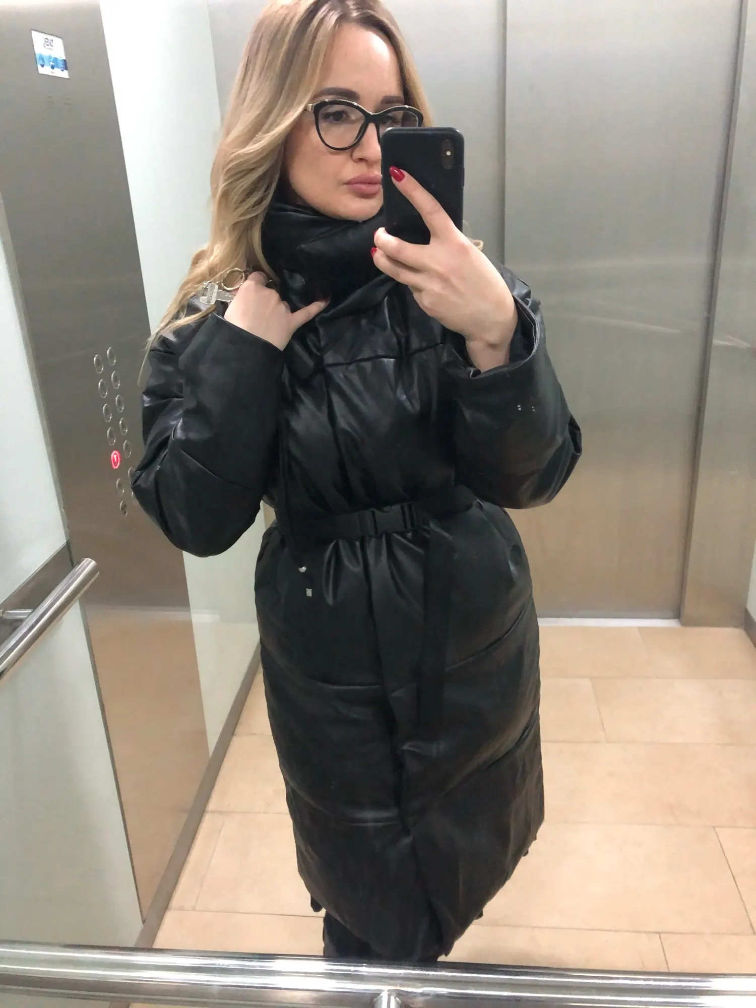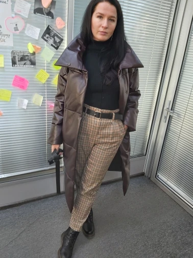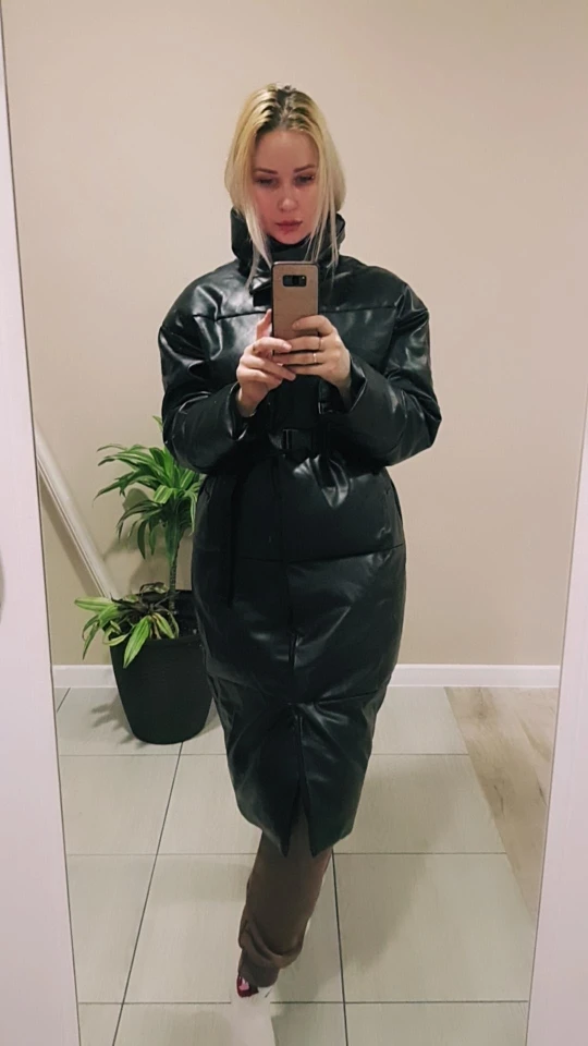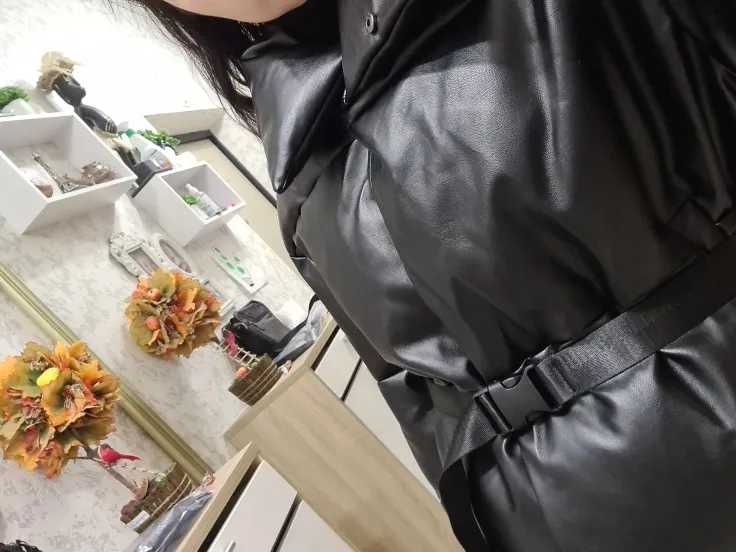 Доставка быстрая, 2 недели. Упакована в индивидуальную упаковку на застежке. Качество куртки отличное, экокожа. Наполнителя внутри очень мало и лежит не очень равномерно. Но за счет плотного материала непродуваема. Клепки надёжно пришиты и при ходьбе не расстегиваются, как писали в других отзывах. Воротник очень высокий, но можно и расстегнуть. Красиво и с ремнём, и без него. Единственное, тот ремень что в комплекте, не подходит. Буду носить со своим. По размеру: взяла М на русский S-M (90-67-98). Везде свободно, в бёдрах тоже. В размер S тоже бы влезла, но смотрелось бы совершенно по-другому, а я хотела как раз немного оверсайз. На рост 172 длина рукава хорошая (на фото видно), длина до середины голени. В целом очень довольна покупкой. Ультрамодная модель и качественная.