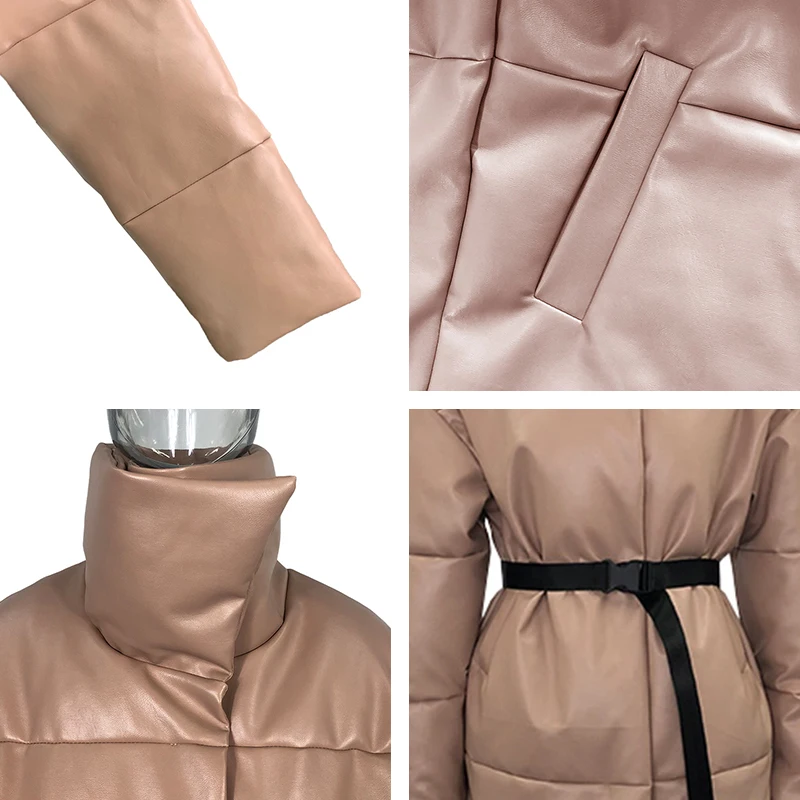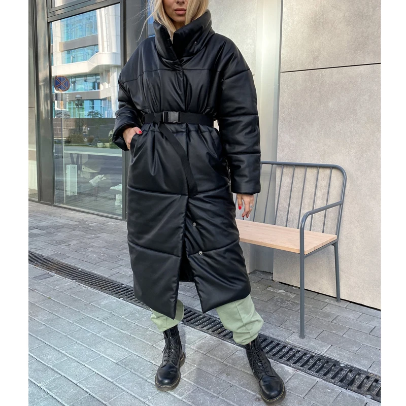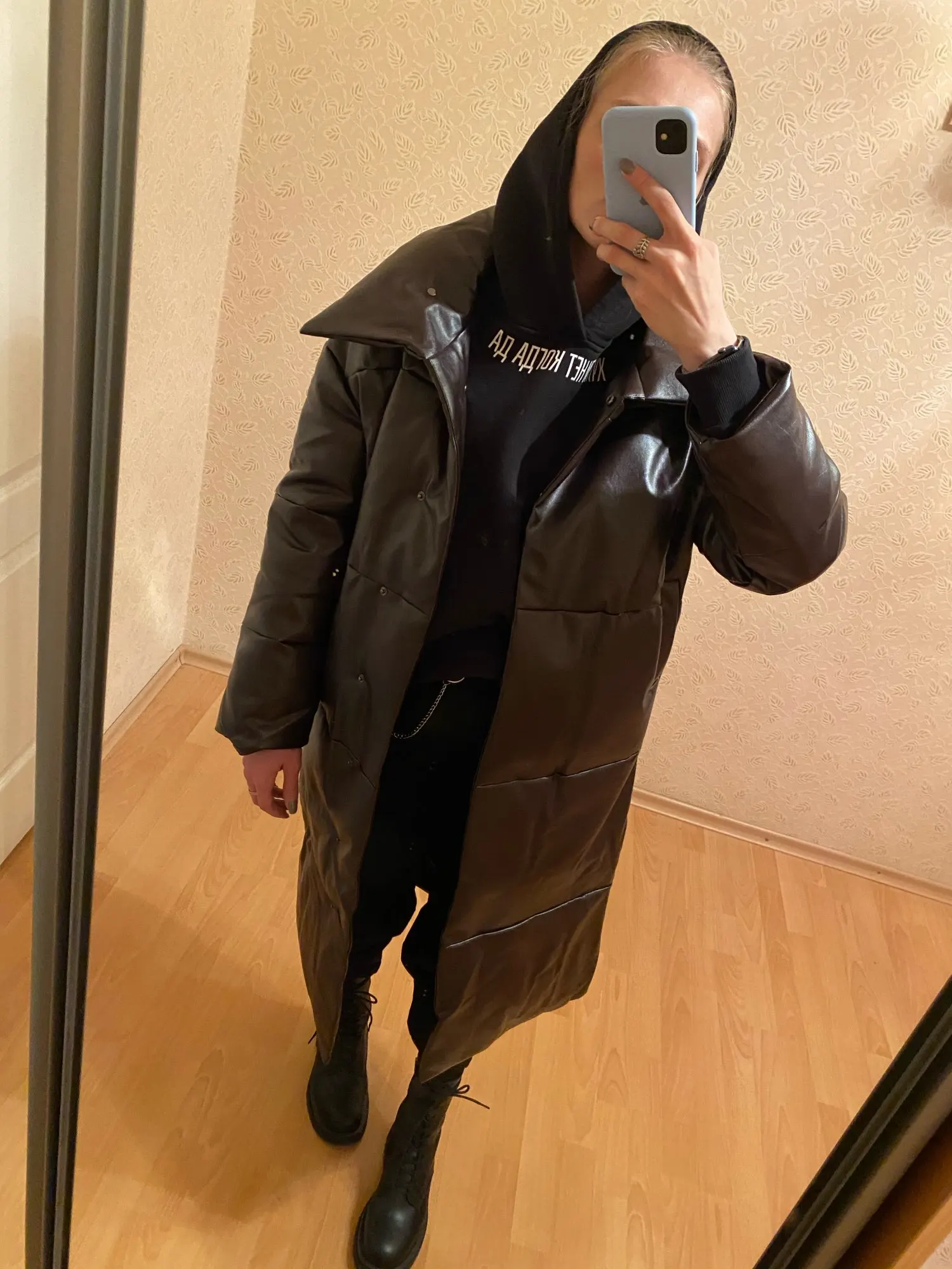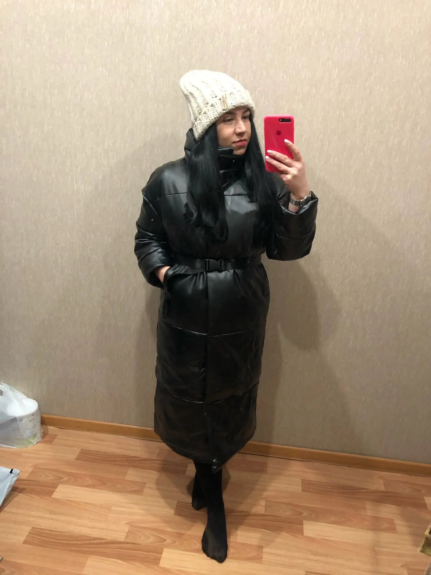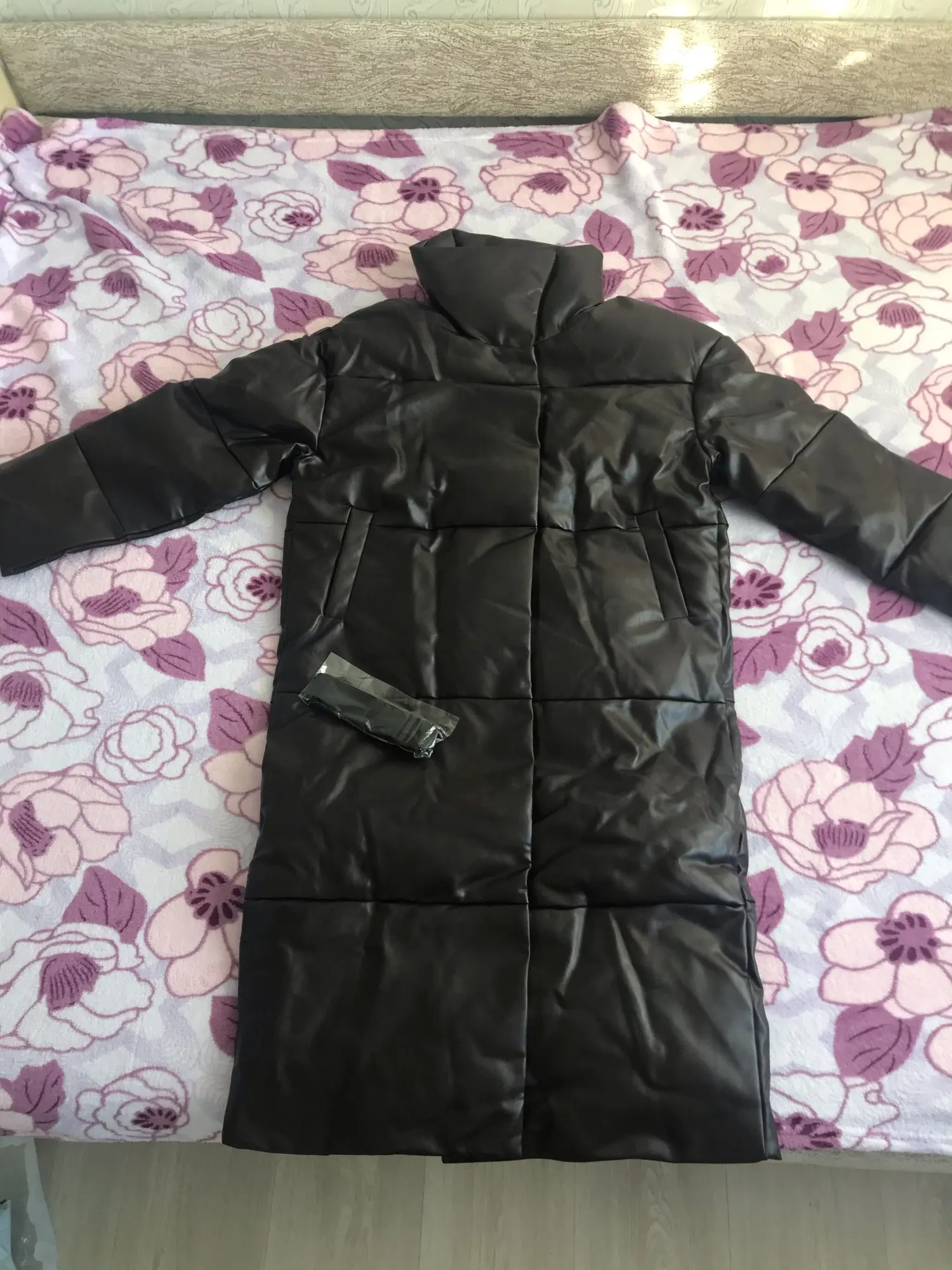 Доставка быстрая, 2 недели. Упакована в индивидуальную упаковку на застежке. Качество куртки отличное, экокожа. Наполнителя внутри очень мало и лежит не очень равномерно. Но за счет плотного материала непродуваема. Клепки надёжно пришиты и при ходьбе не расстегиваются, как писали в других отзывах. Воротник очень высокий, но можно и расстегнуть. Красиво и с ремнём, и без него. Единственное, тот ремень что в комплекте, не подходит. Буду носить со своим. По размеру: взяла М на русский S-M (90-67-98). Везде свободно, в бёдрах тоже. В размер S тоже бы влезла, но смотрелось бы совершенно по-другому, а я хотела как раз немного оверсайз. На рост 172 длина рукава хорошая (на фото видно), длина до середины голени. В целом очень довольна покупкой. Ультрамодная модель и качественная.