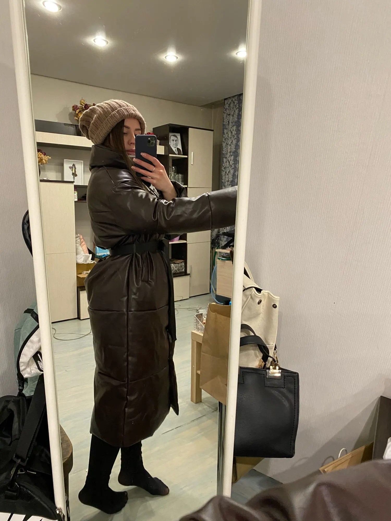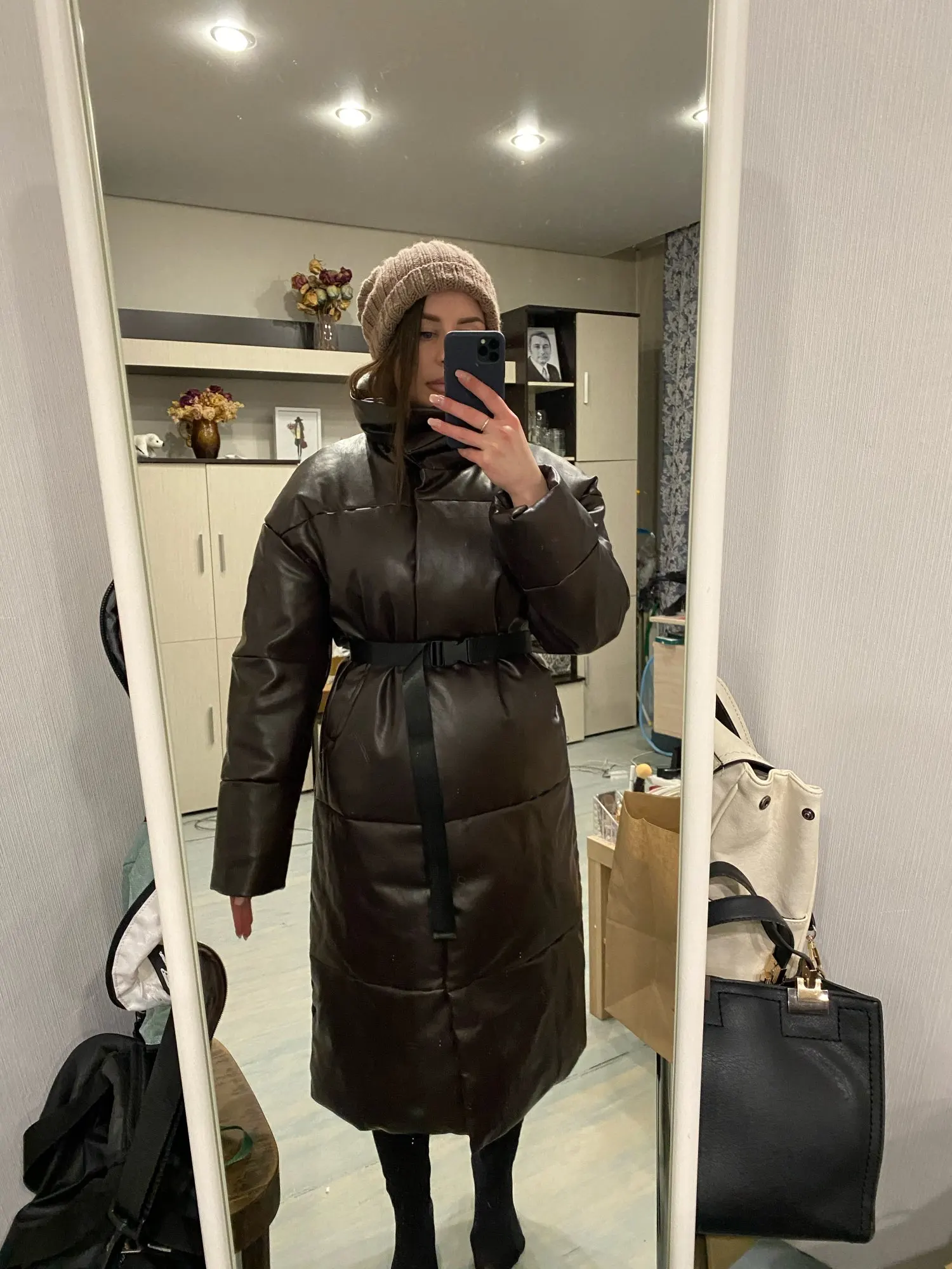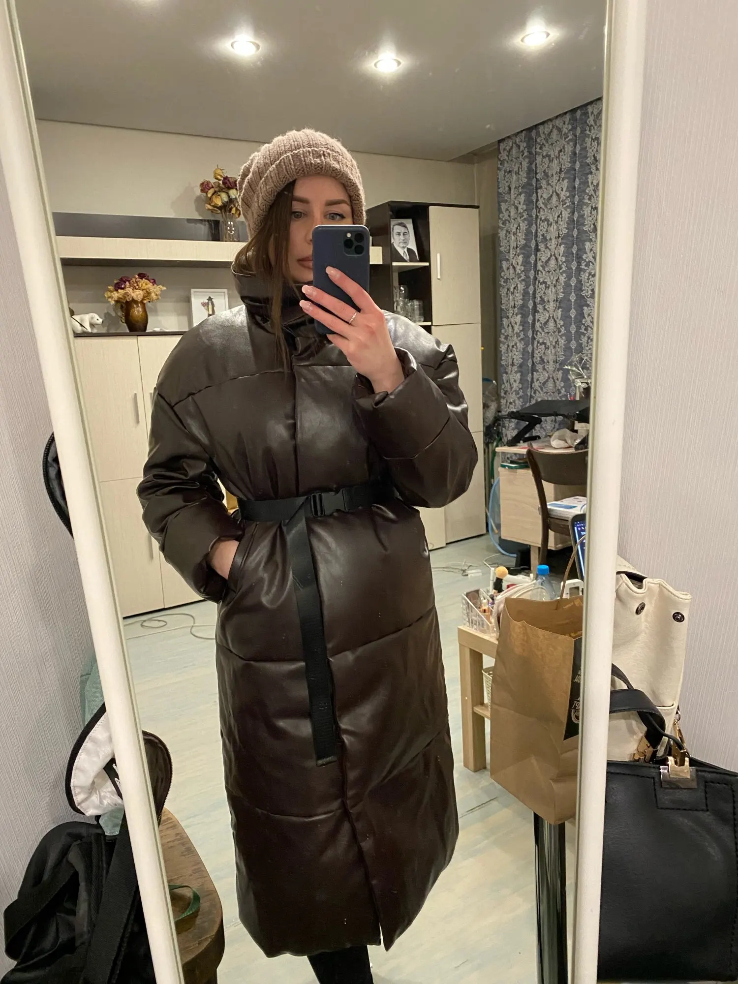 Этот пуховик моя новая любовь. Забрала сегодня с почты. Доставка быстрая. Мои параметры. Рост 165 см, вес 59кг, ог 84см, от 70см, об 98см размер М сел идеально. Думала в бедрах будет узко, но оказалось все в порядке. Рукава на мои длинные руки сели как надо. Кожа не блестит, смотрится дорого. Мне очень нравится. Добавила фото с ремнем и без, свет плохой и не передает всю красоту. Запаха кстати нет, висит уже пол дня в комнате и не пахнет ничем.