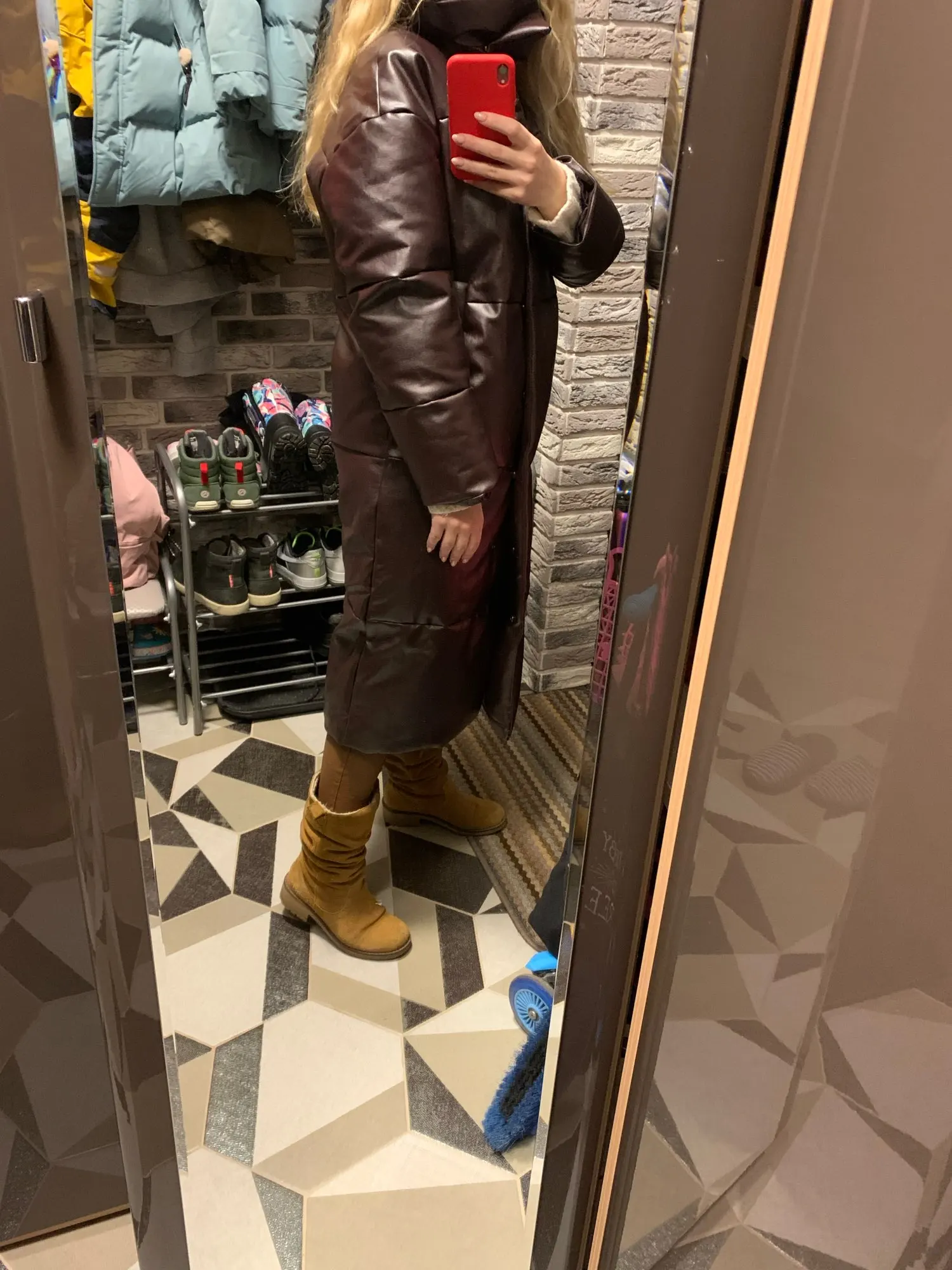 Цвет не коричневый, как чисто коричневый, он становится коричнево-бордовым. Однако пальто сшито очень хорошо. Неприятный запах замечен