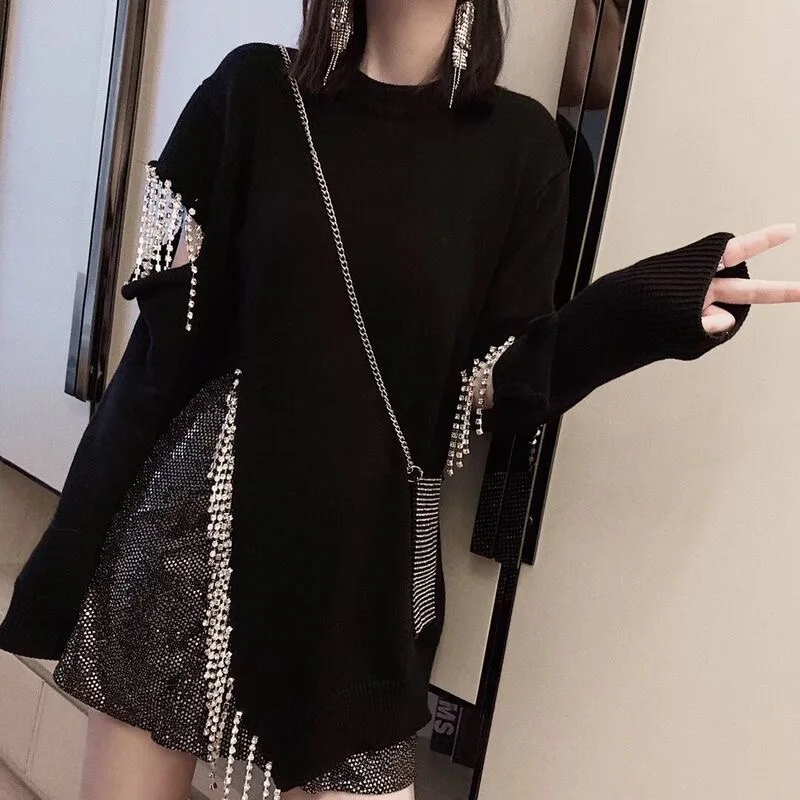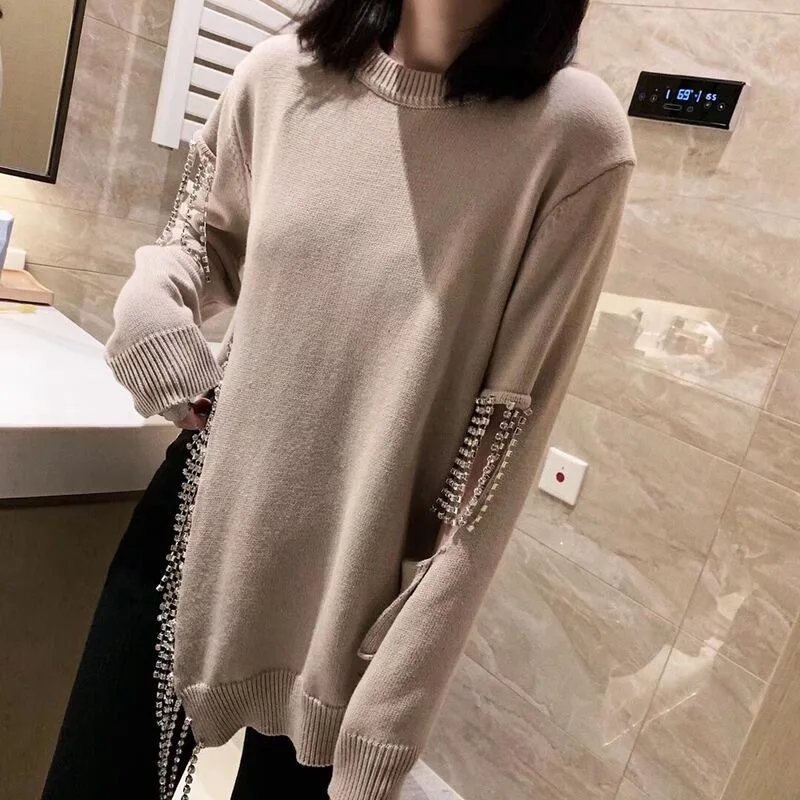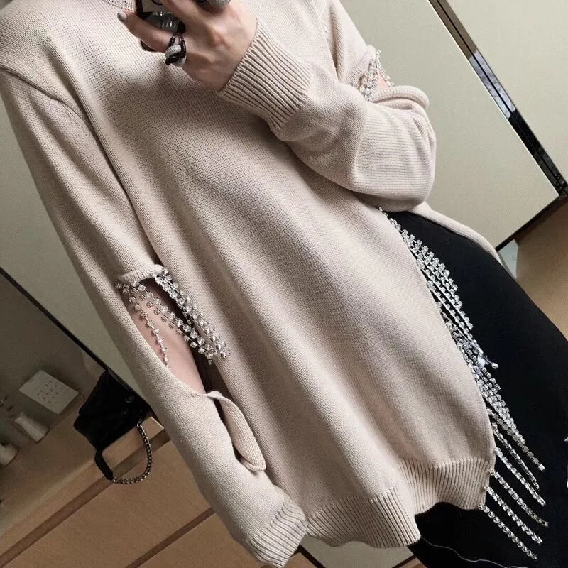 Вязаный свитер Rainstone с кисточками, женские свободные пуловеры с разрезами по бокам, новая модная юбка с длинным рукавом
