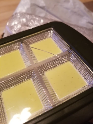 После получения продукта. Я обнаружил, что стандарт IP65 совсем не соблюдается. Вода и наклейки не держатся и позволяют инфильтрации воды в лампе