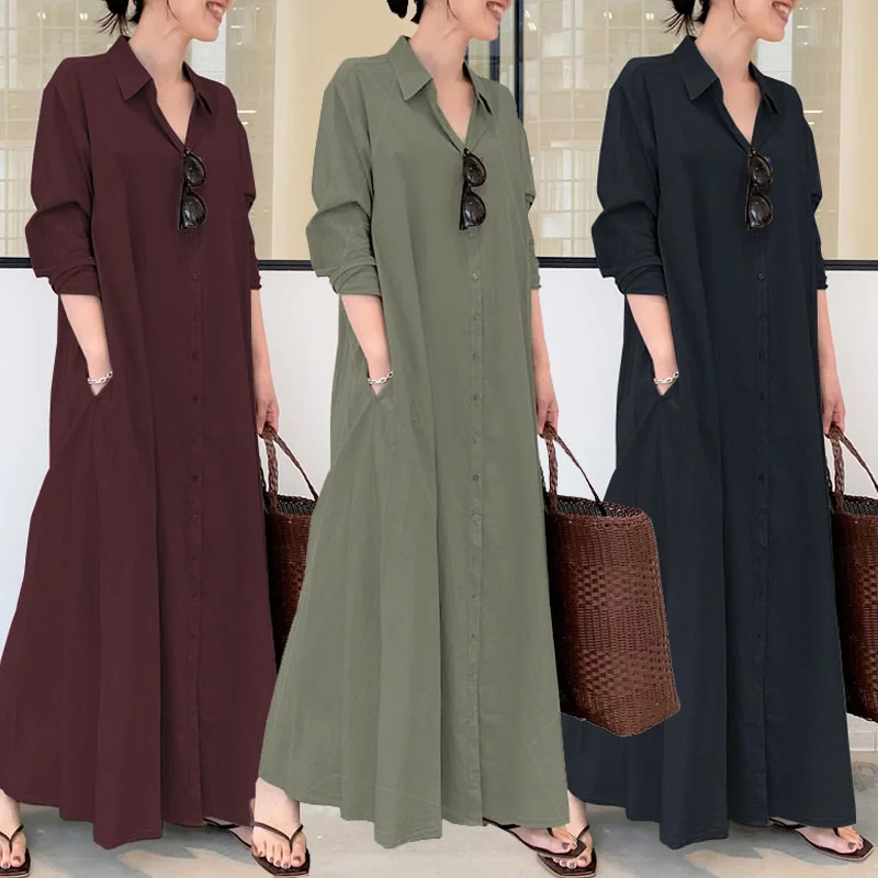 Платье-рубашка ZANZEA женское однотонное, стильный Повседневный длинный сарафан с длинным рукавом, платье с лацканами, на пуговицах, в стиле оверсайз, осень 2021