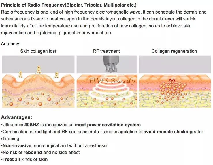 Лицевая ВЧ-головка а емкостный Соединительный электрод используется для передачи радиоволновой энергии и генерации электрического поля для входа в подкожную клеточку через поверхность кожи. При высокой частоте 450 кГц это электрическое поле меняет свою полярность в 450000 раз в секунду. Чтобы ответить на быстрое изменение электрода, направления электрических частиц кожи также изменяются. К этому времени естественное электрическое сопротивление в подкожной клетчатке движется и генерирует тепловую энергию. Так как коллаген папиллярной дермы может немедленно усадиться, когда температура находится в диапазоне от 60 до 70 градусов Цельсия, после лечения морщин, клиент может сразу почувствовать эффект подтяжки кожи, так как она поднимается и укрепляется. Когда коллаген производится непрерывно, толщина и плотность кожи папиллярной дермы могут быть увеличены для удаления морщин, устранения рубцов, восстановления упругости кожи и блеска и сделать его светлым и гладким. В то время как коллаген увеличивается, свежая кожа генерируется в положении операции, и морщины удаляются большим количеством клеток. Кроме того, когда Кора без эластичности или с толстым роговым слоем в области с морщинами отделяется, кожа вокруг также будет обновлена.