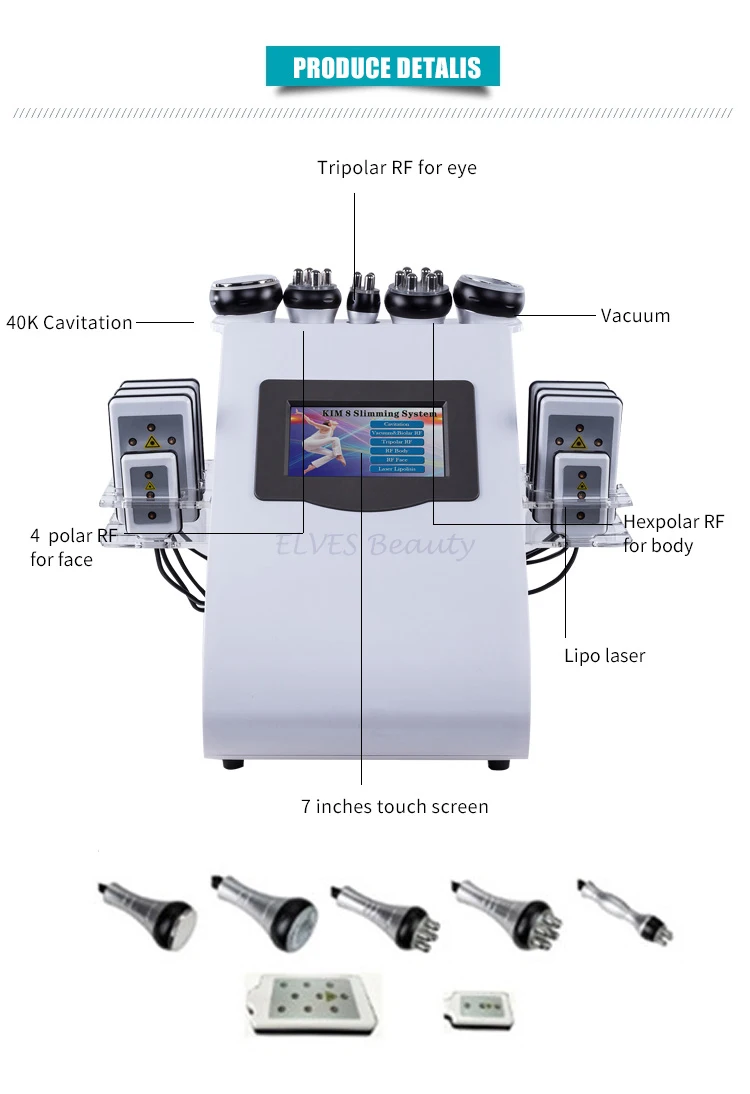 С общей сильной звуковой волновой головкой, сильная звуковая волна 40000 Гц может быть испускана для вибрации жировых клеток на максимальной скорости и производства многочисленных вакуумных воздушных карманов внутри и снаружи жировых клеток, устойчиво воздействует на жир cel s, чтобы генерировать интровертный взрыв и дезинтегрировать триглицерид в глицерин и свободные жирные кислоты. Затем волны с частотой 1 М Гц используются для выматывания интегрированного глицерина и свободных жирных кислот через гепатотермальную циркуляцию. Наконец, вакуумные и энергетические электроды используются для позиционирования и подтягивания жира. В физике он известен как «кавитация». Микропорный интровертный взрыв внутри и снаружи клеток может привести к усиленному молекулярному движению и более высокому уровню энергии, и это приведет к разрыву жировых клеток и тем самым достигнет эффекта бодибилдинга и потери веса.