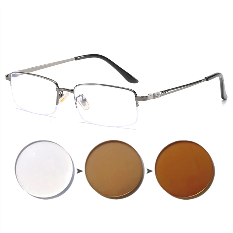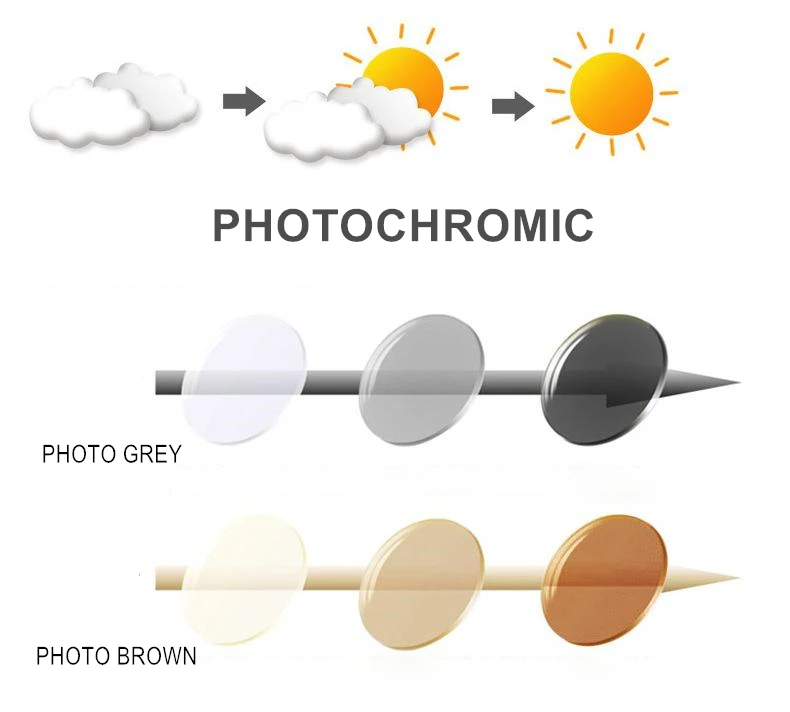 Это aФотохромныйОчки по рецепту дляБлизорукость, Линзы будут прозрачными и бесцветными в помещении или в темных местах, но они изменят цвет на улице или на солнце, чтобы защитить ваши глаза от сильного светильник.