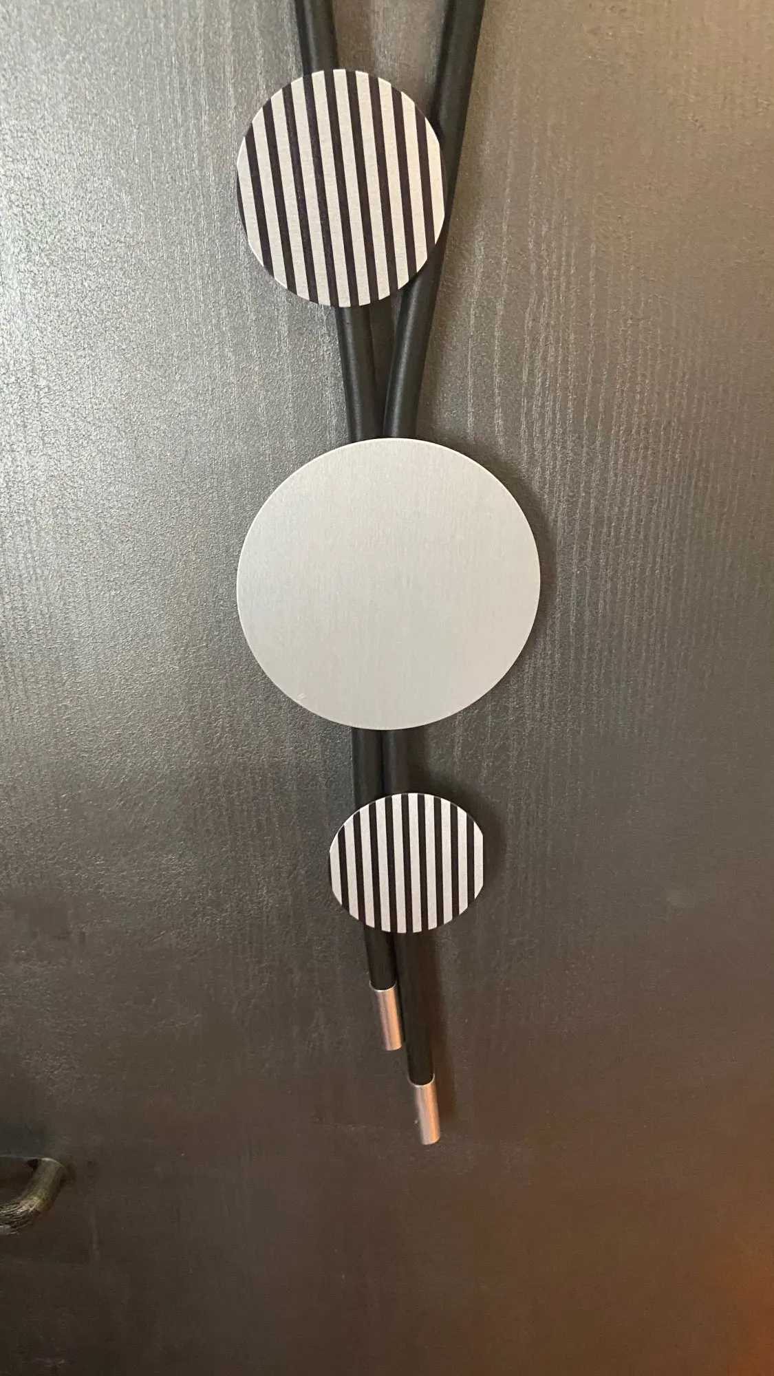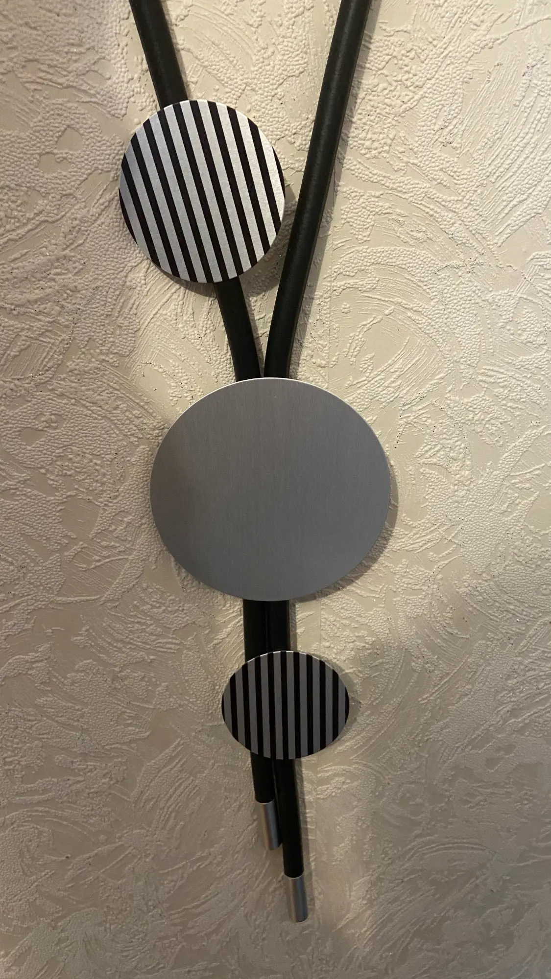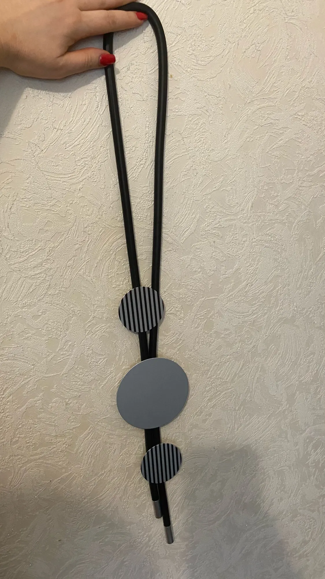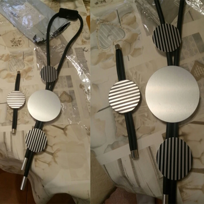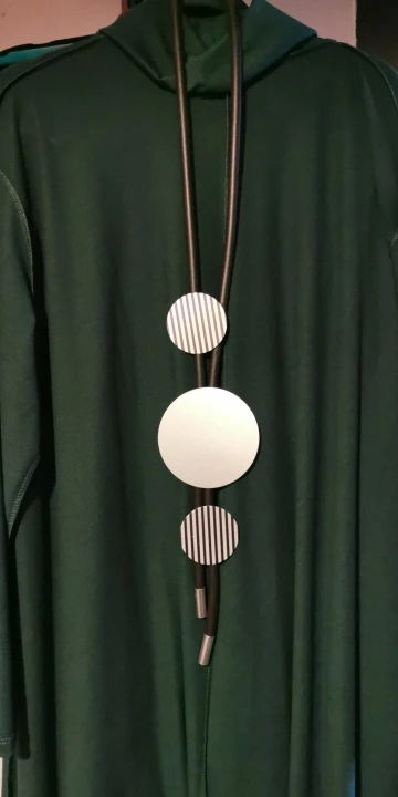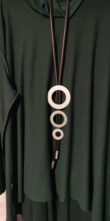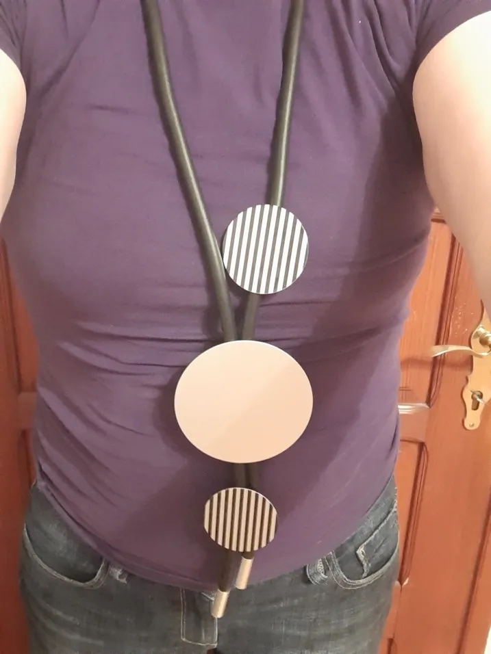 Ожерелье интересное. Основа- резиновый жгут и круги- похожие на тонкий металл с черными полосками. По весу- невесомое, хотя с виду очень массивное. Чистый бохостайл. Брала в комплекте с такимже браслетом Рекомендую. Доставка быстрая -3 недели.