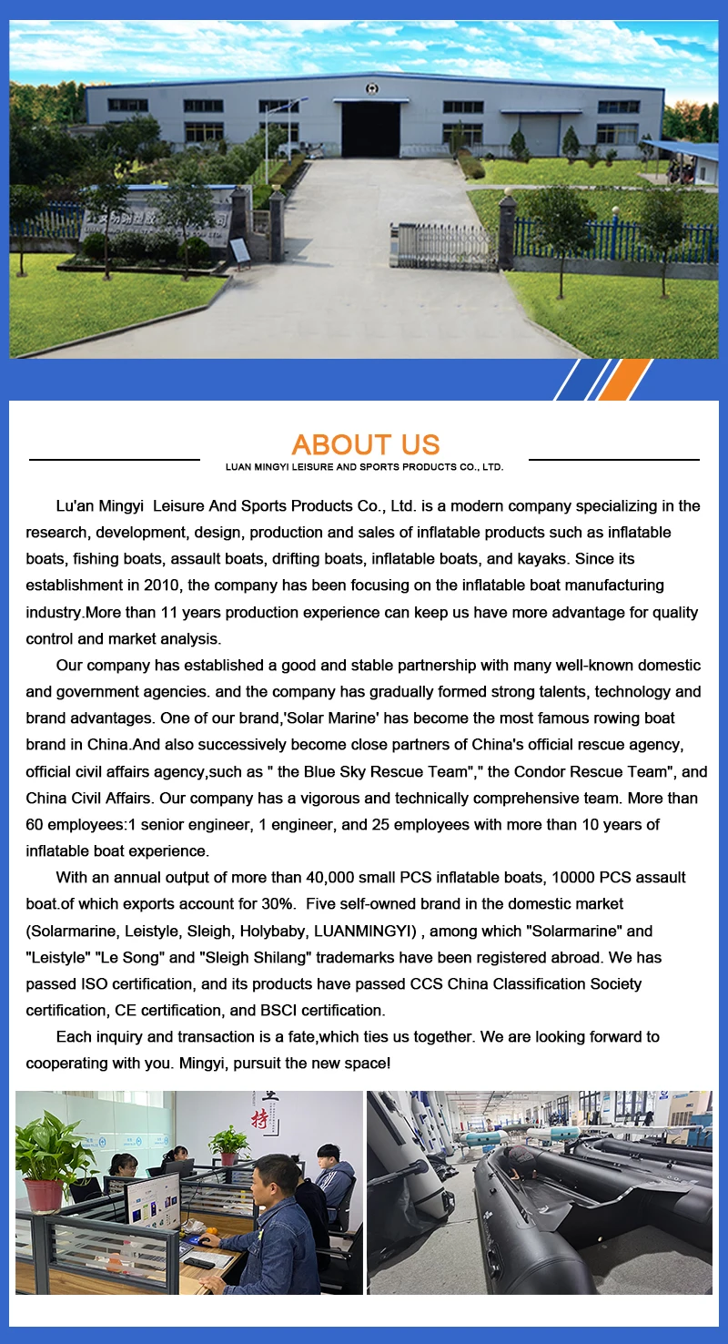 1. Кто мы?Мы находимся в Аньхой, Китай, начиная с 2010 года, Продаем на внутреннем рынке (50.00%), Восточной Европе (10.00%), Западной Европе (10.00%), Северной Америке (10.00%), юго-Восточная Азия (2.00%), Южная Азия (2.00%), Южная Европа (2.00%), Северная Европа (2.00%), Центральная Америка (2.00%), Южная Америка (2.00%), восточная Азия (2.00%), Средний Восток (2.00%), Океания (2.00%), Африка (2.00%). В нашем офисе работает в общей сложности 101-200 человек.2. Как мы можем гарантировать качество?Всегда предварительный образец перед массовым производством;Всегда окончательная проверка перед отправкой;3. Что вы можете купить у нас?Лодка, надувная лодка, ПВХ надувная лодка, скоростная лодка, надувные аксессуары для лодки4. Почему вы должны покупать у нас, а не у других поставщиков?♦Бренд Solar Marine-надежный партнер;♦Фабрика сразу обеспечивает конкурентоспособную цену♦Одобрено CE-высокое качество продукции;♦Быстрая доставка-сильная способность товара на складе;♦OEM дизайн принимается-индивидуальный дизайн, ваш собственный бренд принимается;♦Комплексное обслуживание-для вашего эффективного опыта покупки.5. Какие услуги мы можем предоставить?Принятые Условия поставки: FOB,CFR,CIF,EXW,FCA,DDP,DDU, экспресс-доставка;Принимаемая валюта оплаты: USD,EUR,JPY,CAD,AUD,HKD,CNY;Тип оплаты: T/T,L/C,D/P D/A,MoneyGram, кредитная карта, PayPal,Western Union, наличные, Escrow;Язык: английский, китайский
