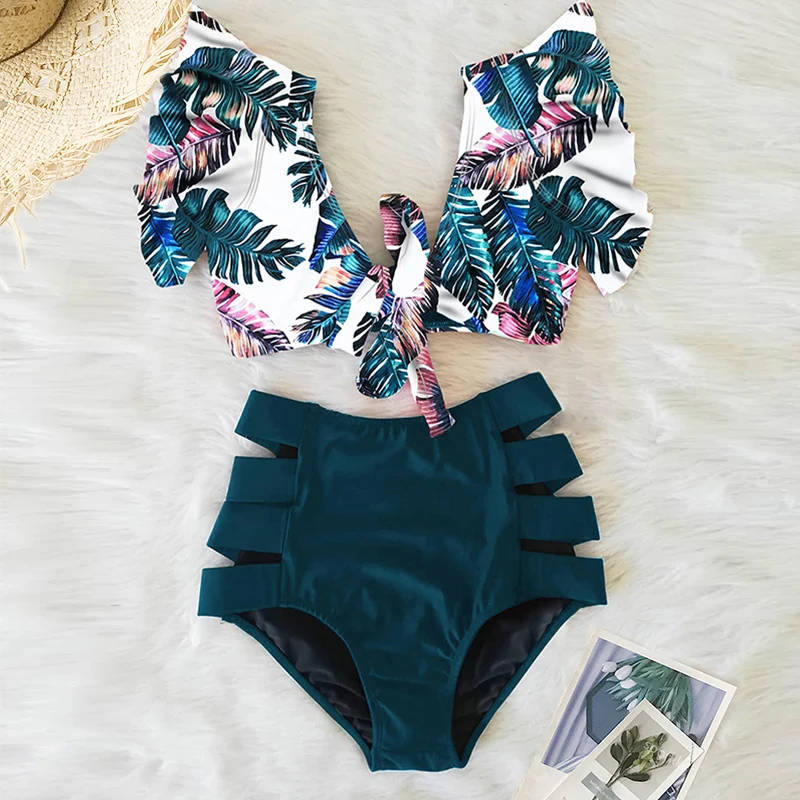 Соблазнительные бикини, новинка 2021, комплект бикини с двойными плечами и оборками, купальник с завышенной талией, женский купальный костюм с V-образным вырезом, купальный костюм, пляжная одежда для плавания