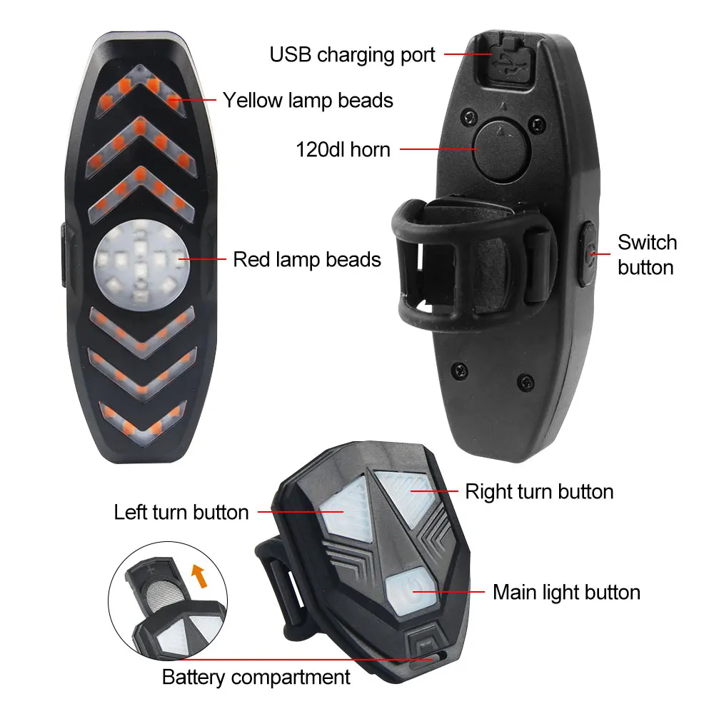Название: USB Перезаряжаемый велосипед с роговым пультом дистанционного управления поворотомЦвет: черныйСветильник Цвет: красный светильник к желтому цвету светильникСветильник источник: 12 * красный светодиодный + 28 * желтый светодиодныйНапряжение: 3,7 VСпособ зарядки: зарядка через USBИспользование батареи: Встроенный литиевый аккумуляторЕмкость аккумулятора: 700 мАчВремя зарядки: 2,5 чВремя работы: 5,5 h (разными режимами освещения, разных рабочих часов)Светильник режим: 6 уровней регулируемые (красный светильник always on/красный светильник мигающий/красные и желтые полный мигающий/красный светильник медленно мигает/левый сигнал поворота/Правый Сигнал поворота)Громкоговоритель децибел: 120dlРасстояние дистанционного управления: 5 мУровень водонепроницаемости: водонепроницаемый (убедитесь, что интерфейс USB закрыт)Пульт дистанционного управления Размер: 5,5*4,5 смРазмер задней фары: 10*3 смВес нетто: 50 г