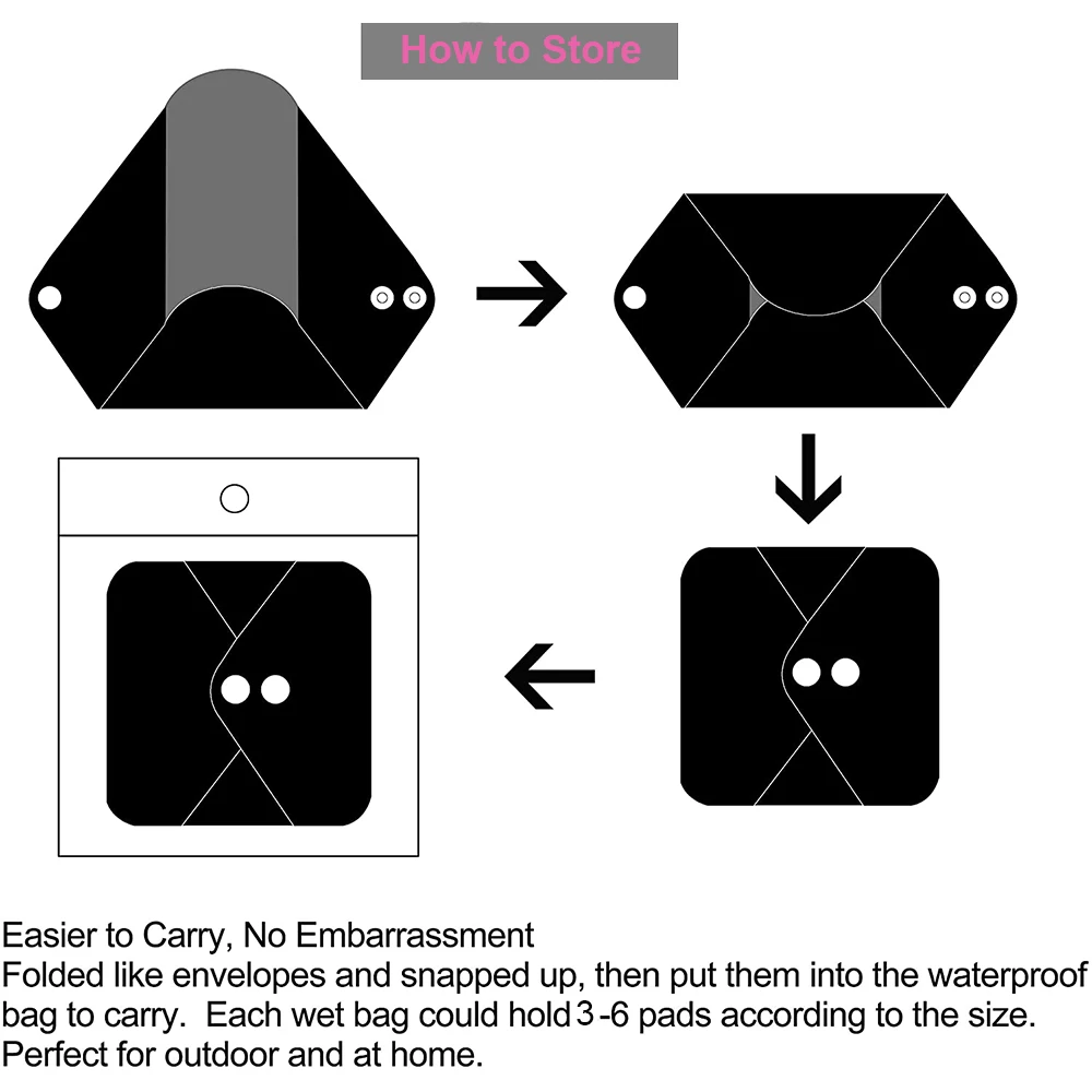 Перед первым использованием Вымойте тканевые подкладки. Защелкивающиеся подушечки вокруг нижнего белья. Меняйте подушечку каждые 2-6 часов или по мере необходимости. Когда вы находитесь вдали от дома, поместите использованные прокладки в мини-сумку, пока не вернетесь домой. Затем мойте согласно инструкциям по уходу. Избегайте стирки прокладок в общественных местах. Прокладки предназначены только для личного пользования и не должны использоваться совместно с другими.