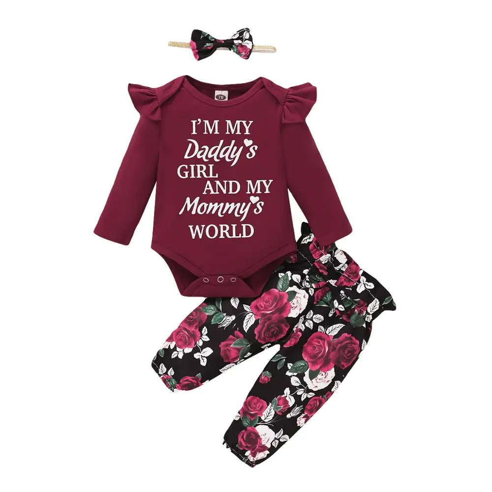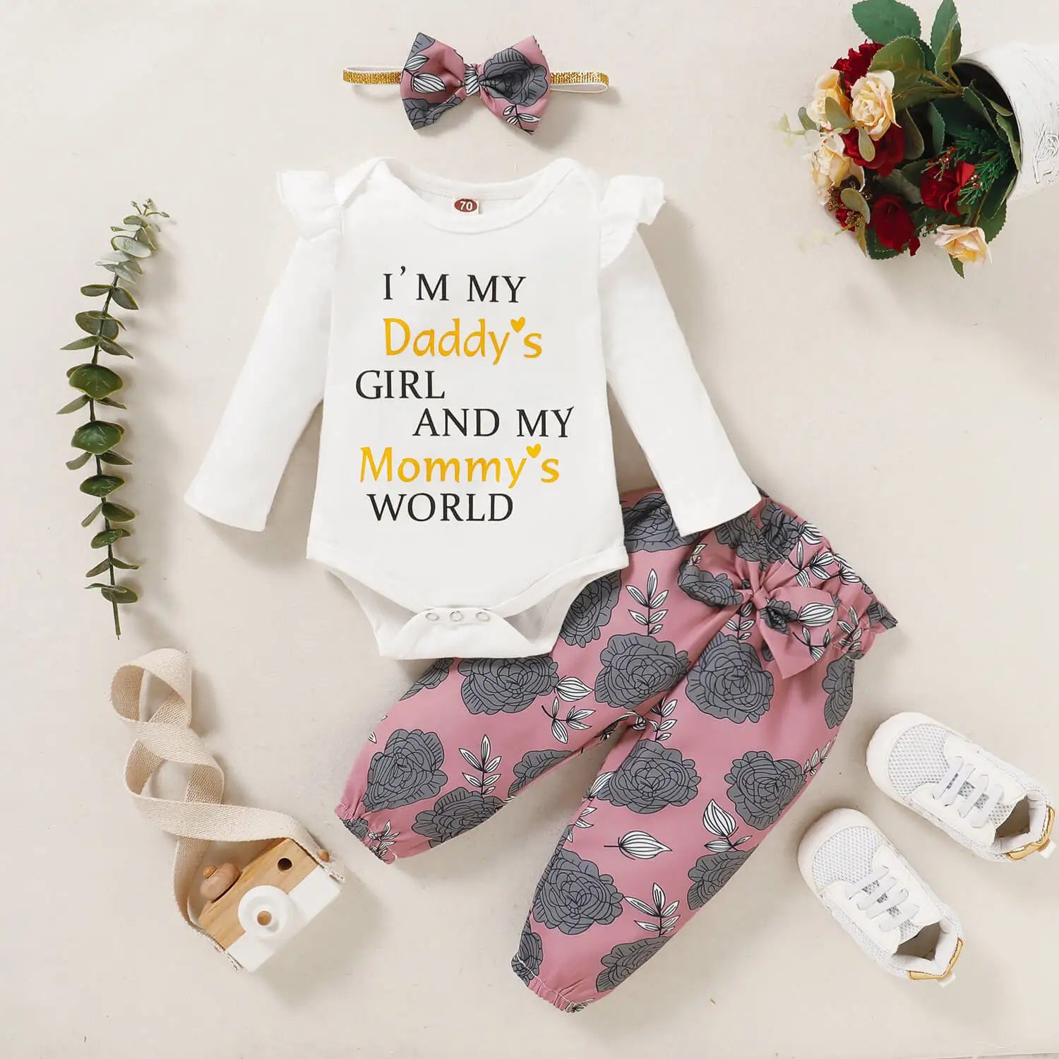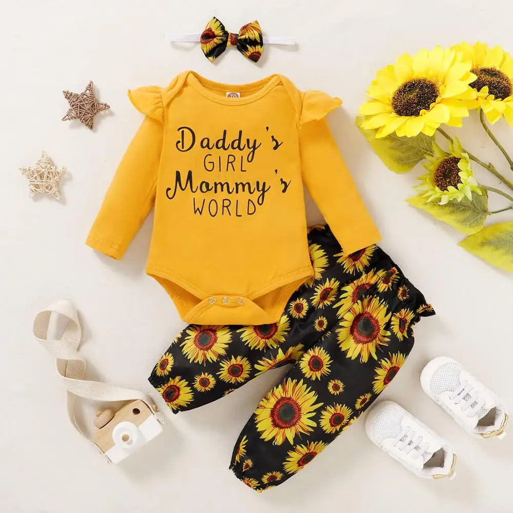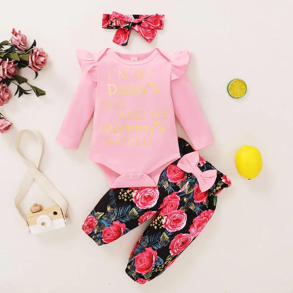 Осенняя одежда для маленьких девочек из 3 предметов одежда с длинными рукавами для маленьких девочек Комбинезон с цветочным принтом Mommy's World для папы и девочки, наборы повязок на голову
