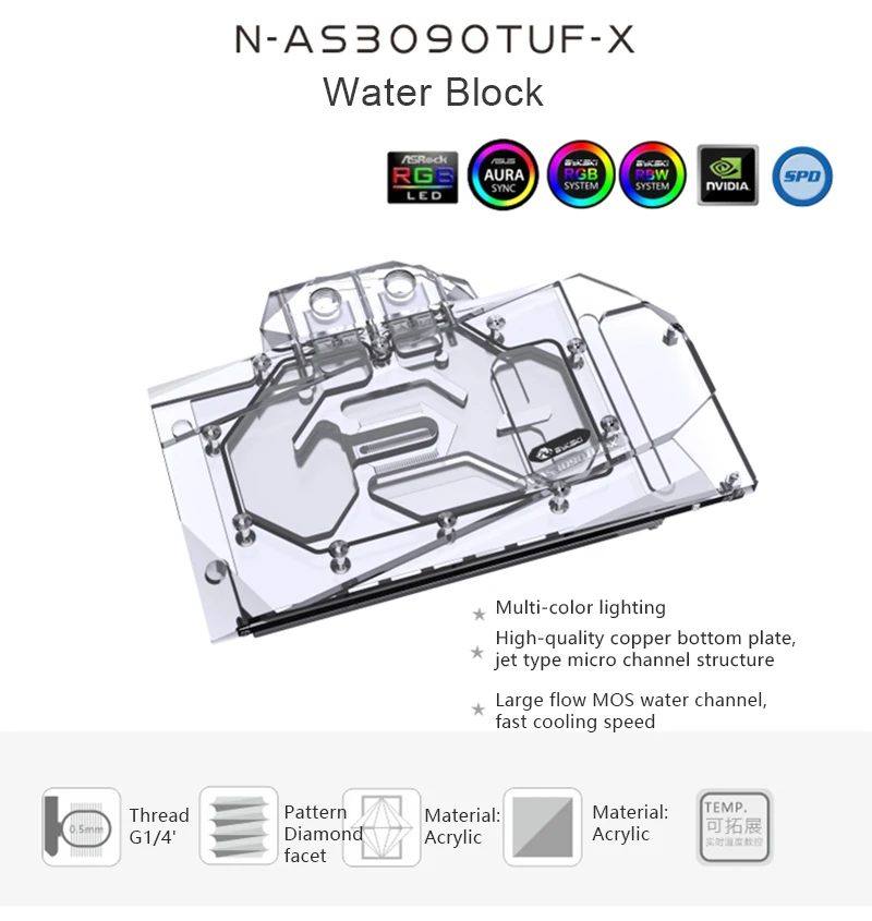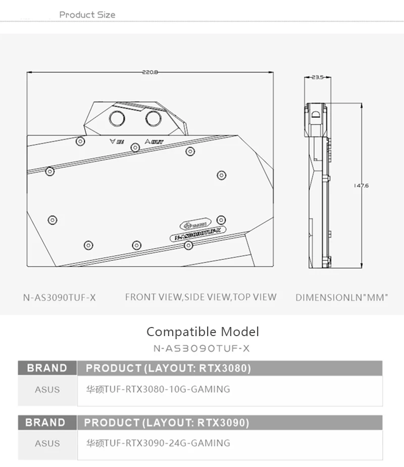 Петля: неалюминиевая(Включая, но не ограничиваясь следующими моделями)ASUS RTX 3090 TUF GAMINGASUS RTX 3080 TUF GAMINGСовместимость основана только на справочном дизайне, блок может не соответствовать измененным/супер-разгонным и другим вариантам третьей стороны, которые отличаются от эталонного дизайна.Фитинги: Резьба G 1/4Стоковые бэкплейты: из-за разницы в монтаже между картами, стоковые бэкплейты не гарантированно подходят.