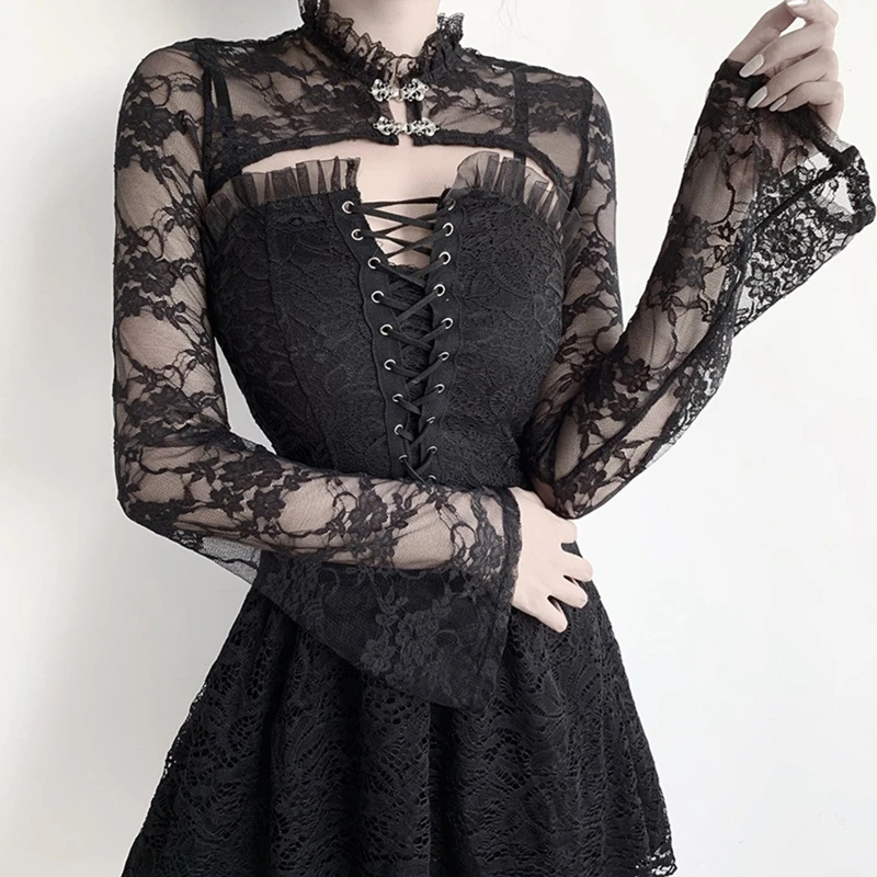 Воротник-стойка с рюшами, длинные рукава, сексуальное открытое Прозрачное цветочное кружево, однотонный черный цвет, две пряжки спереди.