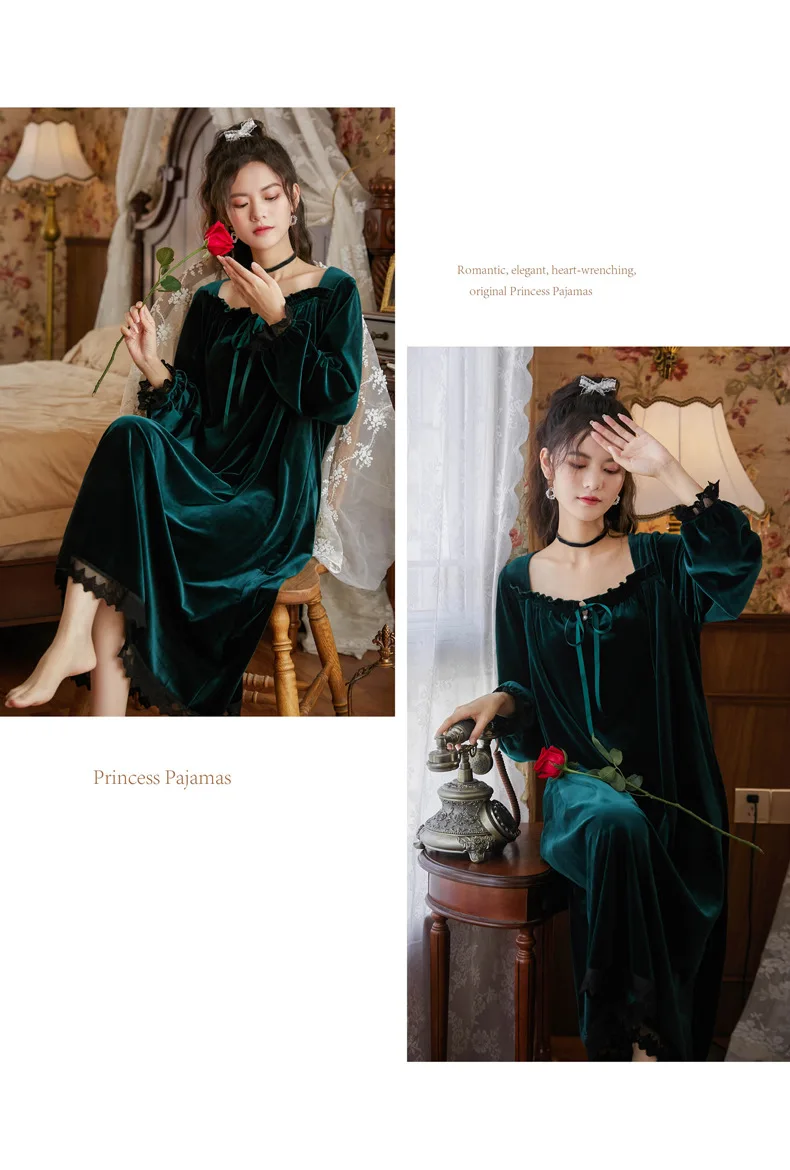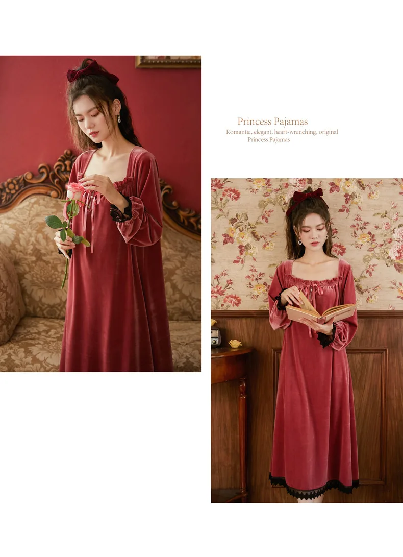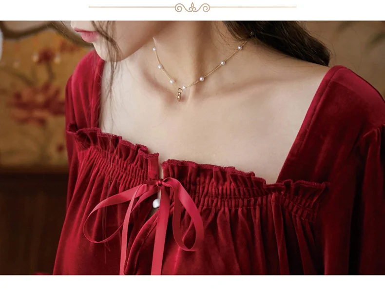Женская зимняя теплая бархатная ночная рубашка с длинными рукавами и квадратным воротником