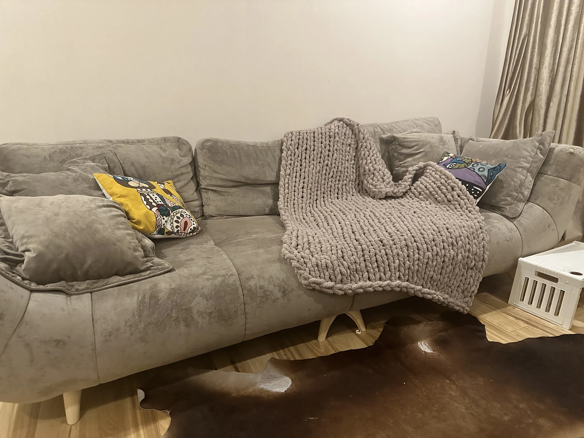 Очень порадовало качество нити пледа, не рахлое “мериносное” волокно, как во многих других пиедьобениях алиэкспресс Очень приятный на ощупь! Спасибо продавцу! Пришел на две недели раньше заявленного срока.