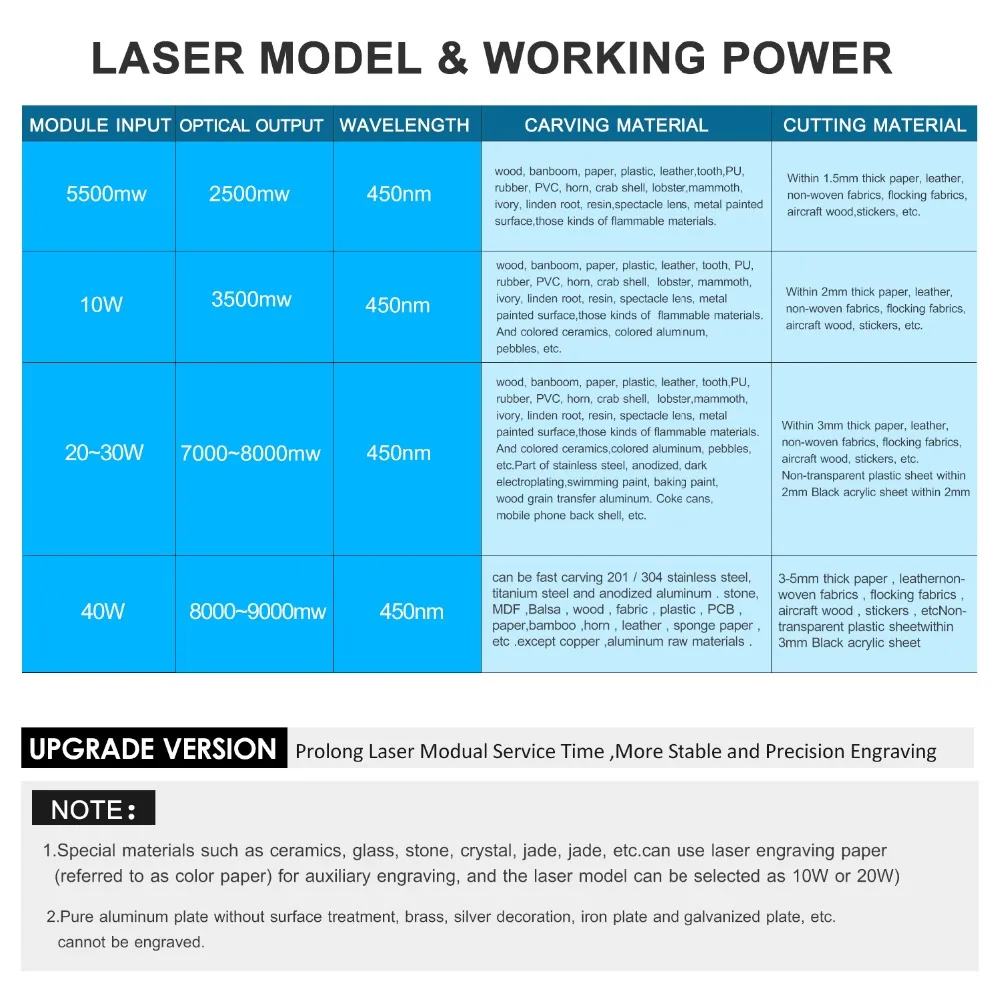 40 Вт усовершенствованный синий лазерный модуль с более низкой потерей и высокой точностью, который предназначен как для 3D-принтера, так и для станка с ЧПУ. С 448-462нм длиной волны, это в 6-7 раз быстрее и в 3-4 раза точность, чем традиционный лазерный модуль. Есть 5 мощных лазерных modual на выбор, они могут гравировать и резать различные материалы.
