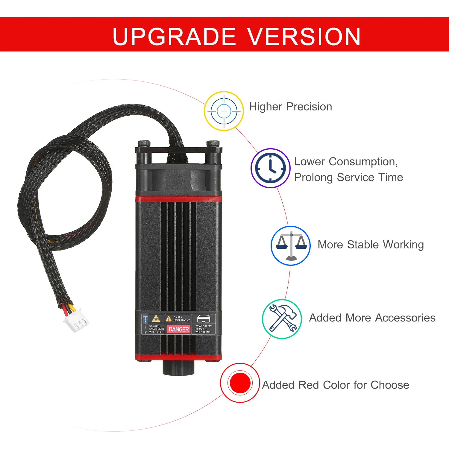 Усовершенствованный синий лазерный модуль с более низкой потерей и высокой точностью предназначен как для 3D-принтера, так и для станка с ЧПУ. С длиной волны 450нм, это эффективный инструмент для лазерной гравировки и лазерной резки. Есть 4 мощных лазера modual на выбор, они могут гравировать и резать различные материалы.Особенности:Усовершенствованный синий лазерный модуль --- профессиональная лазерная головка имеет обновление с более низкой потерей и высокой точностью и поддерживает высокую скорость и высокую стабильность, в то же время продлевает время обслуживания лазера modual. Ярко-сине-фиолетовый светильник, легко устанавливается при гравировке.Регулируемая фокусировка --- Регулируемая лазерная головка, легко настраивается, более гибкое использование и обеспечивает гравировку с хорошим качеством и высокой эффективностью.Легко собрать безопасное использование --- маленький и компактный, удобный и простой в установке. Поставляются с защитными очками, обеспечивают безопасную работу.5500mW резной материал --- деревянный Тип, некоторые пластмассы, бумага, бамбук, рог, тонкая кожа (кошелек), резиновый штамп, зуб, ПУ, печатная бумага, ПВХ, рог, раковина краба, омар, мамонт, слоновая кость, корень липы, смола, Линзы для очков, металлическая окрашенная поверхность, те виды легковоспламеняющегося материала s.5500 МВт устройство для лазерной резки Материал --- подача заявки в 1,5 мм толщиной, бумага, кожа, неткаными материалами, флокирования тканей, дерева самолета, наклейки и т. д.Характеристики:Цвет: черный/красный (на выбор)Мощность лазера: 5500 МВт/10 Вт/20 Вт/30 Вт (опционально)Материал: алюминиевый сплав + пластикСветильник Цвет: синий с защитой от УФДлина волны: 450нмФорма Facula: пунктиформа, регулируемый фокус (30 Вт не может регулировать фокусировку)Входное напряжение: 12 В 2 А