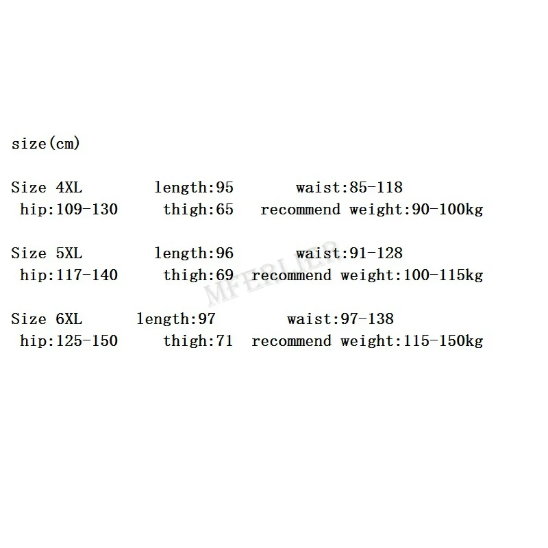 Размер 6XL Длина: 97 Талия: 97-138 бедра: 125-150 бедра: 71 рекомендуемый вес: 115-150 кг