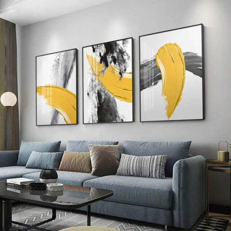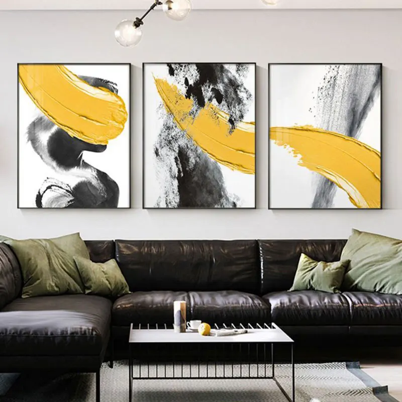Абстрактный плакат Золотой, оранжевый, желтый, серый настенный принт, современный стиль, холст, Черный всплеск, чернильная живопись, Скандинавское декоративное изображение для дома