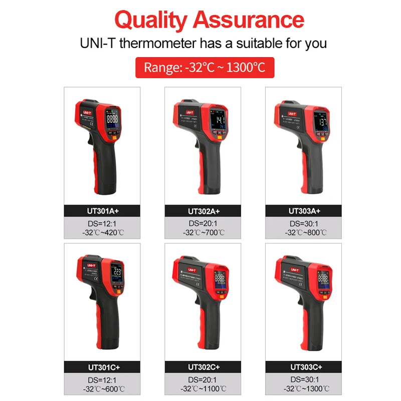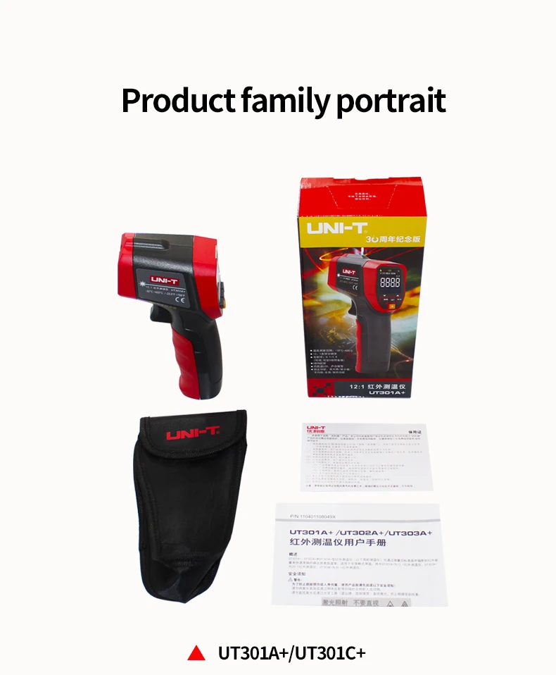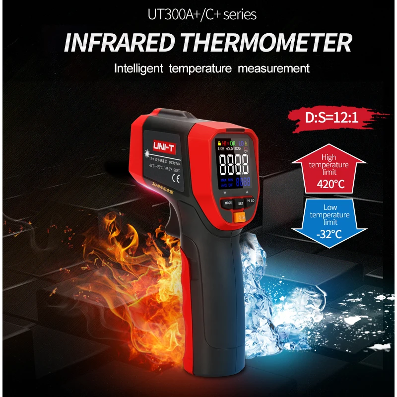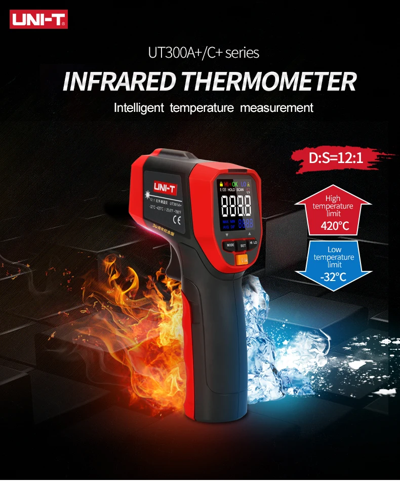 Новая серия UT301 +-это прочный и простой в использовании инфракрасный термометр с высокой точностью/энергией (95%)/повторяемостью. Он обладает регулируемой высокой и низкой температурой визуального/звукового сигнала, реагируя быстрее, чем 250 мс, что может помочь вам быстро найти аномалии. Вы можете задать и сохранить 5 наборов значений излучения и быстро Переключить излучение в соответствии с различными поверхностями, чтобы получить более точные результаты. С замером замка, макс./мин/AVG/DIFF hold, и штативом, UT301A + идеально подходит для процессов, требующих контроля температуры. UT301A + может быть применен к распределению электроэнергии/транспортировке оборудования инспекции, HVAC/оборудование обслуживания, устранения неисправностей транспортного средства и других областях.