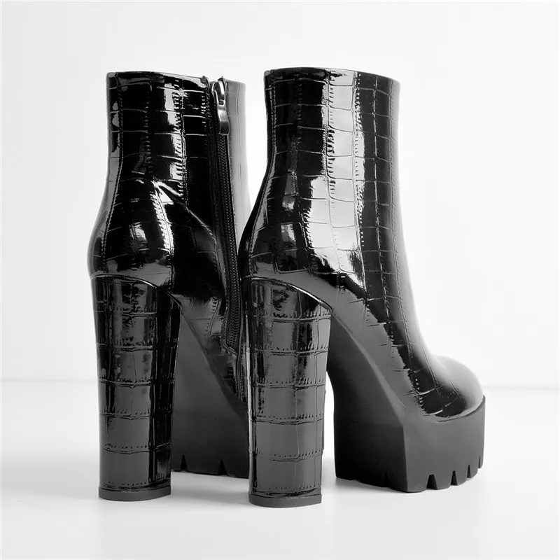 OnlymakerЧерные ботильоны из лакированной кожи на платформе, с боковой молнией, с круглым носком, на не сужающемся книзу массивном высоком каблуке; Женские полусапожки из флока; Большие размеры