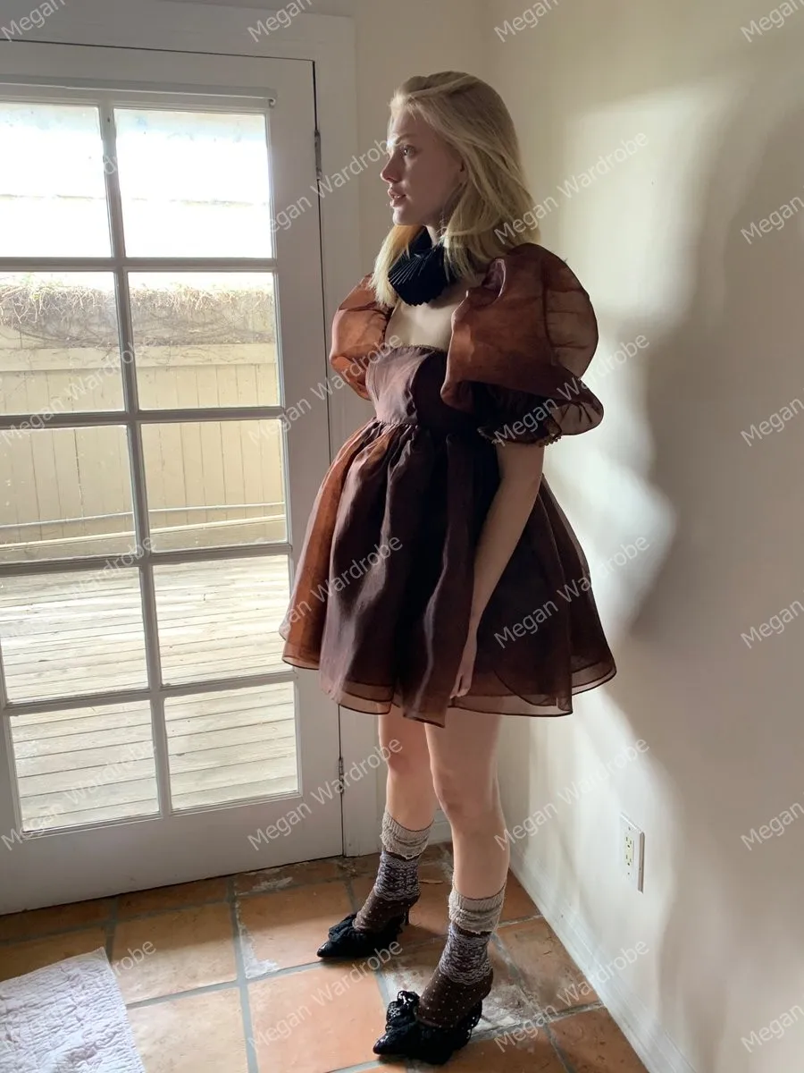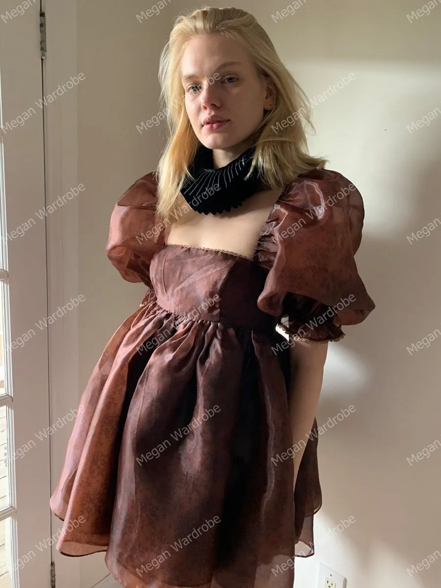 Платье-мини из органзы, ТРАПЕЦИЕВИДНОЕ, вечерние пышными рукавами
