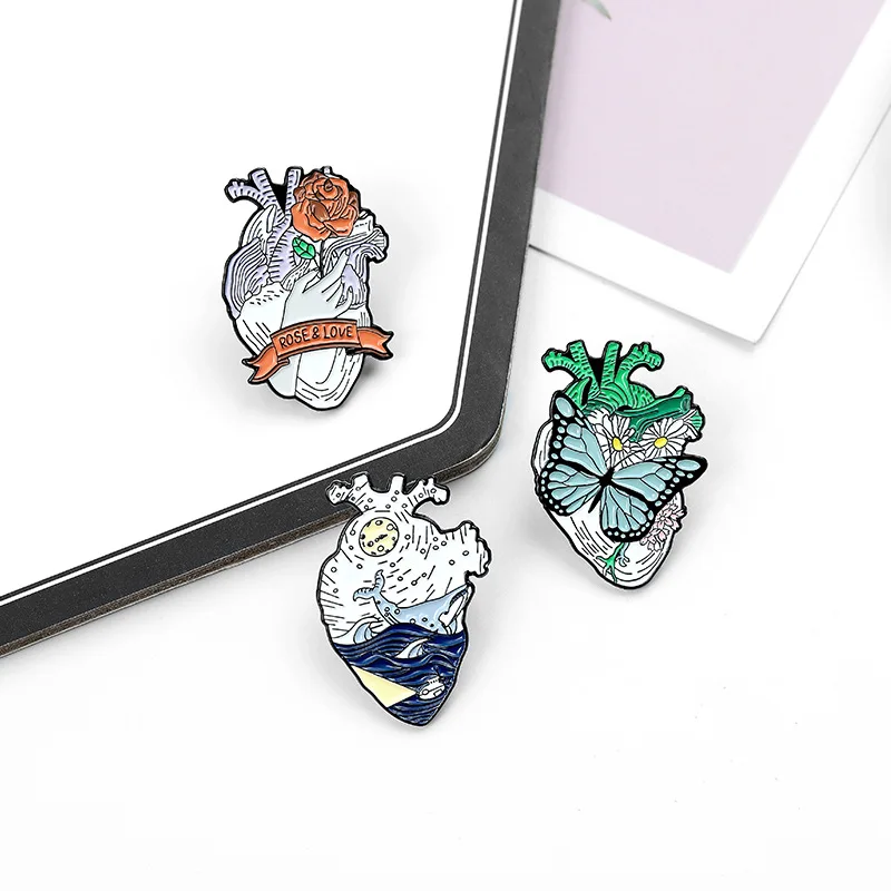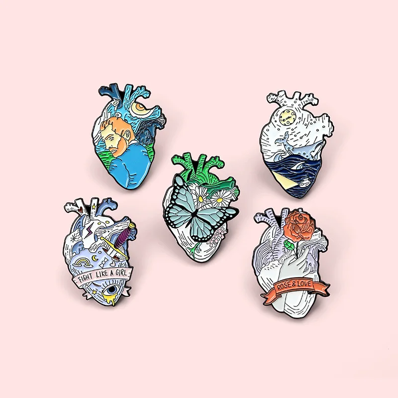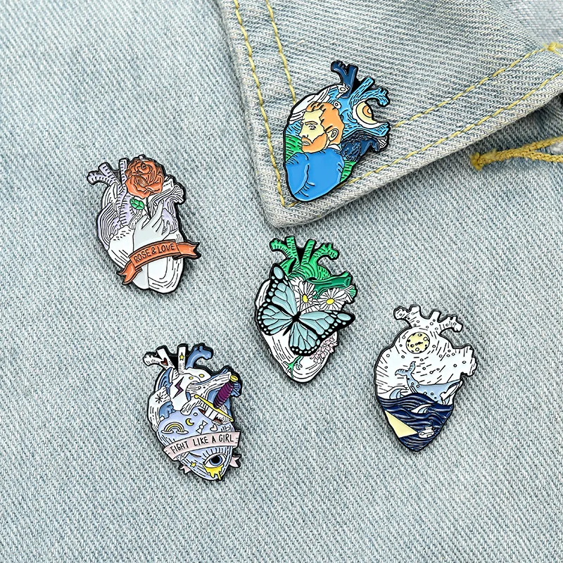 Сердце Форма эмаль значки на заказ океан "Ван Гог", "пространство Роза Бабочка Броши Булавки на лацкан рубашка сумка со значком, ювелирное изделие, подарок другу