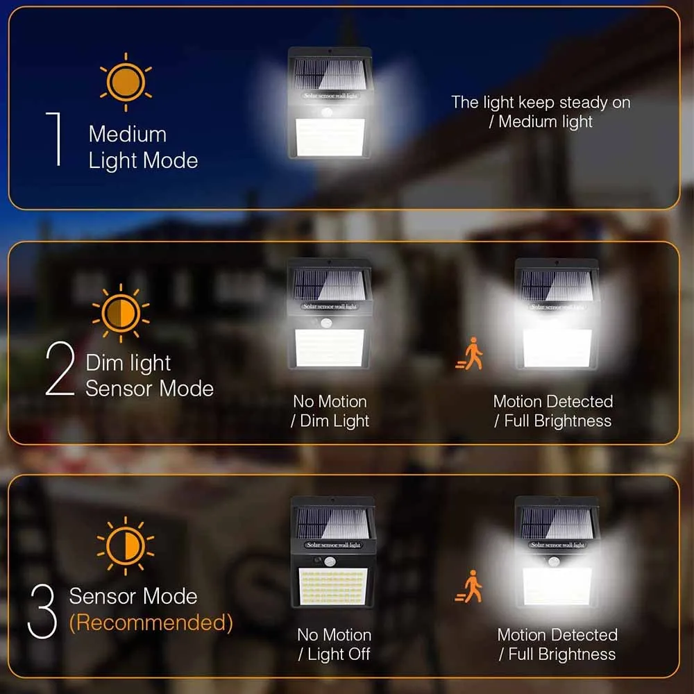 【 3 Интеллектуальное освещение 】мы рекомендуем использовать режим 3 (режим освещения датчика). Свет выключен, когда нет движения, полная яркость при обнаружении движения. Это будет более энергосберегающим и экологически чистым, срок службы ламп может быть увеличен примерно на 50%. Режим 1 (Режим постоянного света): автоматическое включение в ночное время, автоматическое отключение в течение дня. Режим 2 (режим датчика тусклого света): тусклый свет, когда нет движения, полная яркость при обнаружении движения. 【Солнечные лампы 】солнечная панель преобразует солнечную энергию в электричество через ежедневное воздействие солнечного света. Оснащенный перезаряжаемым аккумулятором большой емкости 1200 мАч, яркость до 800 лума, он может осветить ваш дом более 8 часов работы в темную ночь. 【 IP65 погодоустойчивость 】солнечные Настенные светильники изготовлены из высококачественных и прочных материалов ABS, которые могут эффективно изолировать воду и работать нормально даже в суровую погоду. Питание от солнечной энергии, лучше для окружающей среды и поможет вам сэкономить много денег на электроэнергии. 【Простая и быстрая установка 】простой дизайн, поставляется с винтами и пользовательским направляющим. Вы можете завершить установку этого маленького солнечного света за несколько минут.