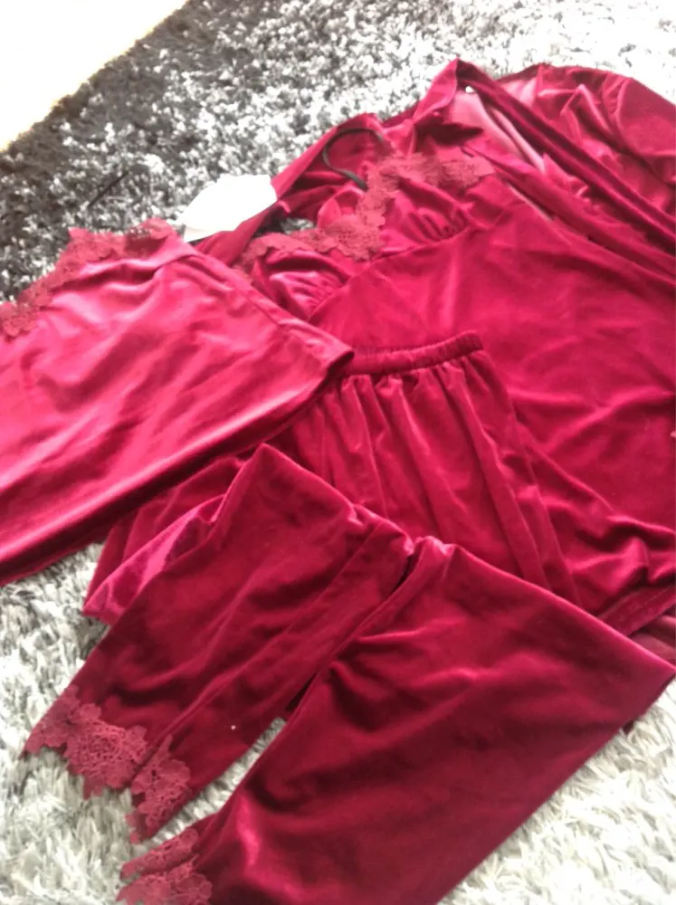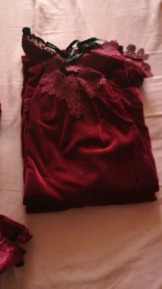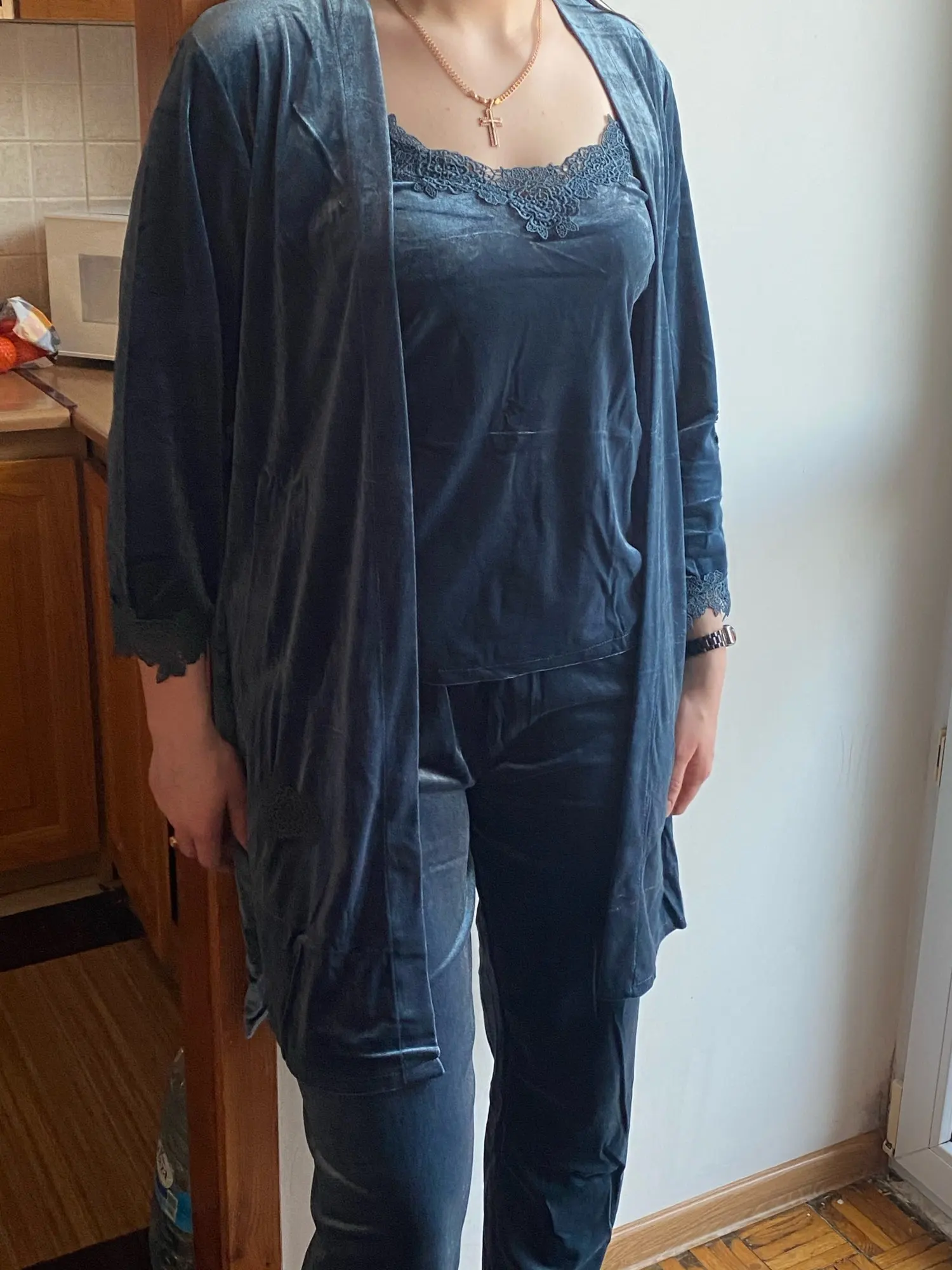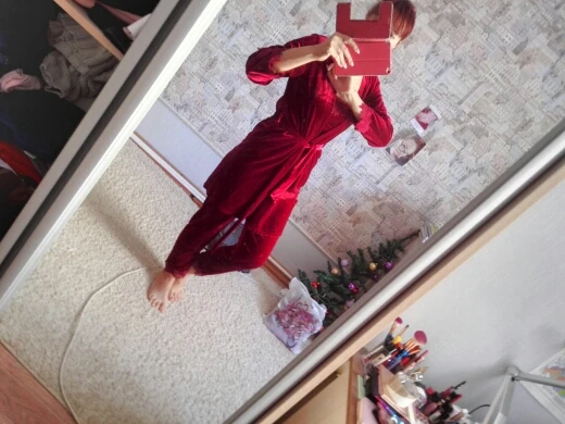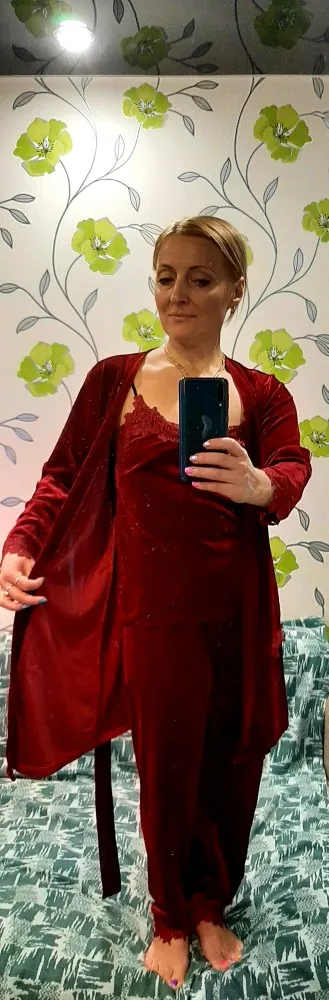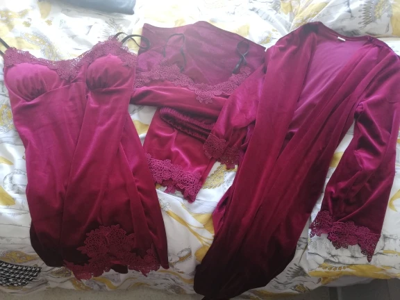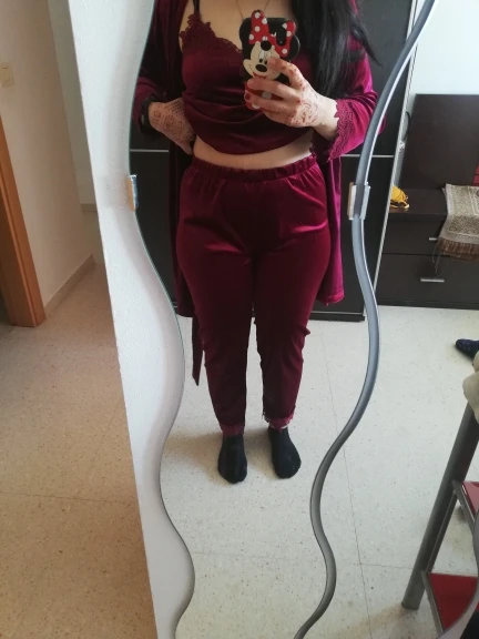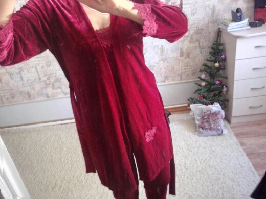 Пришло за 10 дней, на дом принёс курьер. Цвет оч красивый, бордо насыщенный. Сшит хорошо, ровные швы, без ниток и запаха сырого склада :) На этом хорошие новости кончились. Размер всех вещей отличается по факту. Взяла м на рос 42-44. Штаны оч широкие,прям вот на беременный живот 6 мес. :) халат оч маленький, не запахнуть даже, без сорочки не надеть. Топ и сорочка тоже маловаты, но ткань тянется, а так по размеру как s. Жутко электризует. Я брала, конечно, не спать, дома. ходить, может и ничего :)