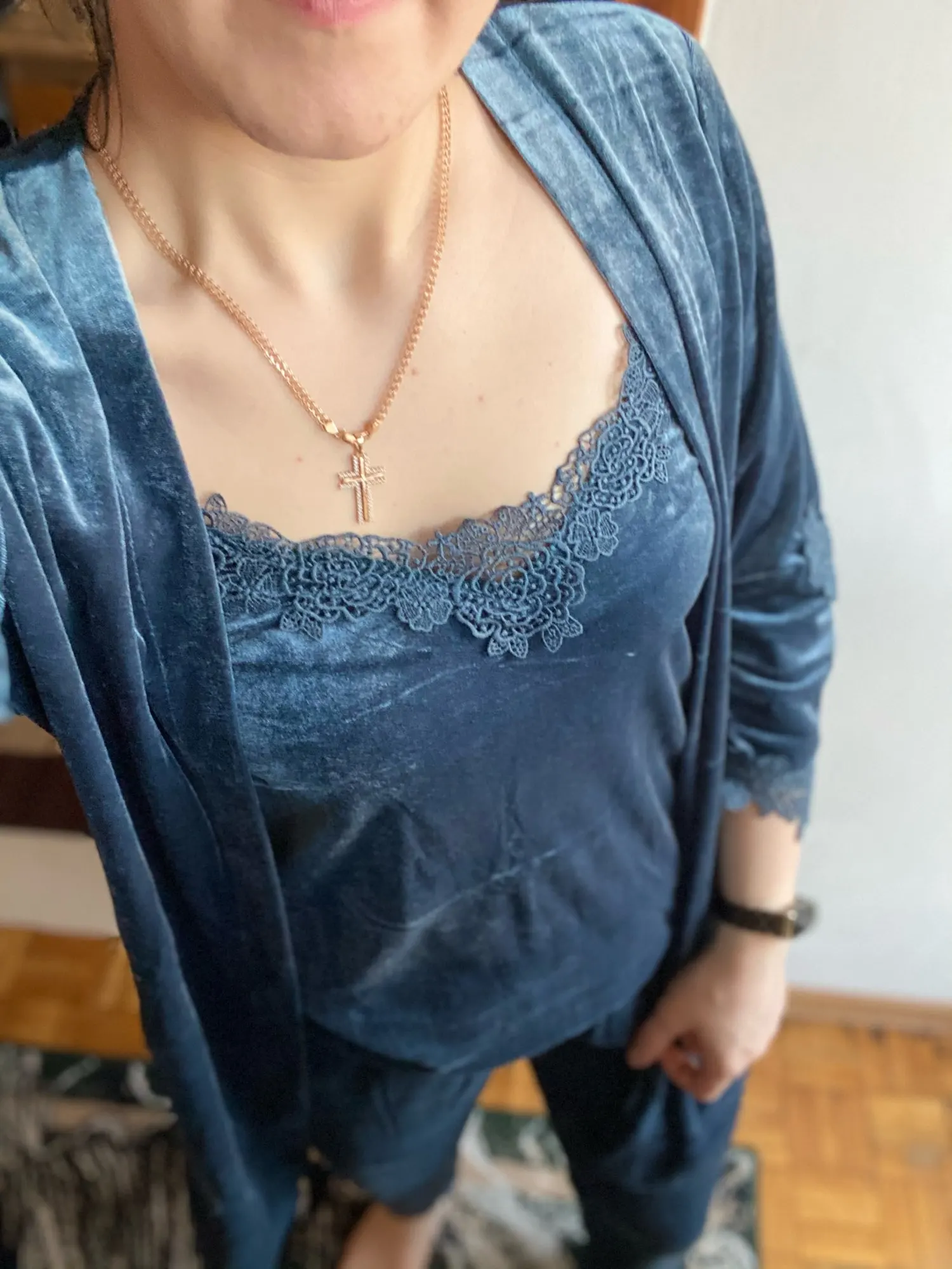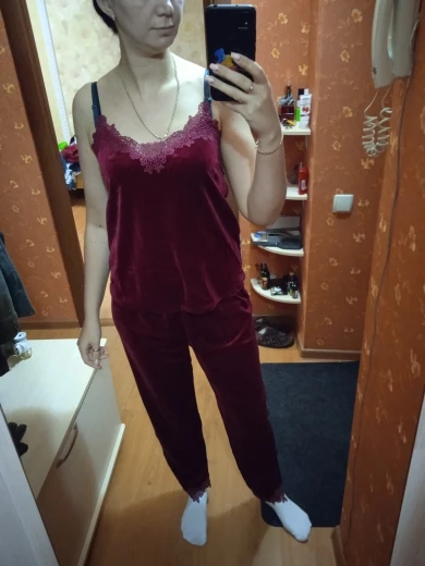Пижамка пришла за неделю. Заказывала со скидкой 08.03.21,а пришла 12.03.21 . Полностью соответствует описанию. Электризуется , но это легко устранимо. На мой размер села хорошо. заказала L на ОГ 86 И ОБ 94. Если для кого то важно- собирает мусор на себя(ниточки, пушинки, перышки)) Но мне комплект нравится))) Спасибо продавцу за оперативность!!!