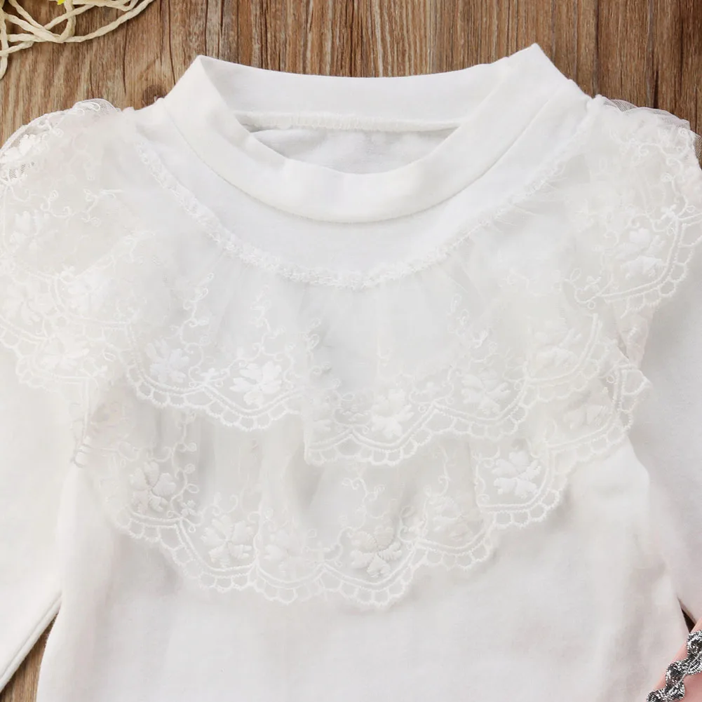От 1 до 6 лет одежда для малышей Кружевная футболка с оборками и длинными рукавами для маленьких девочек Топы + юбка-пачка с бантом на бретелях Детские костюмы принцессы, 2021
