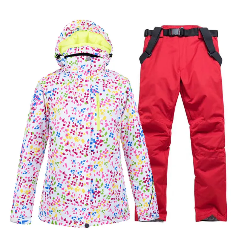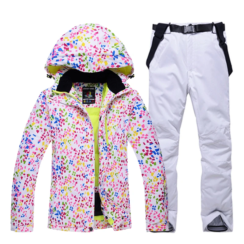Дешевый белый женский костюм для катания на лыжах, одежда для сноуборда, водонепроницаемые ветрозащитные зимние костюмы, куртка + брюки на бретелях, зимняя одежда
