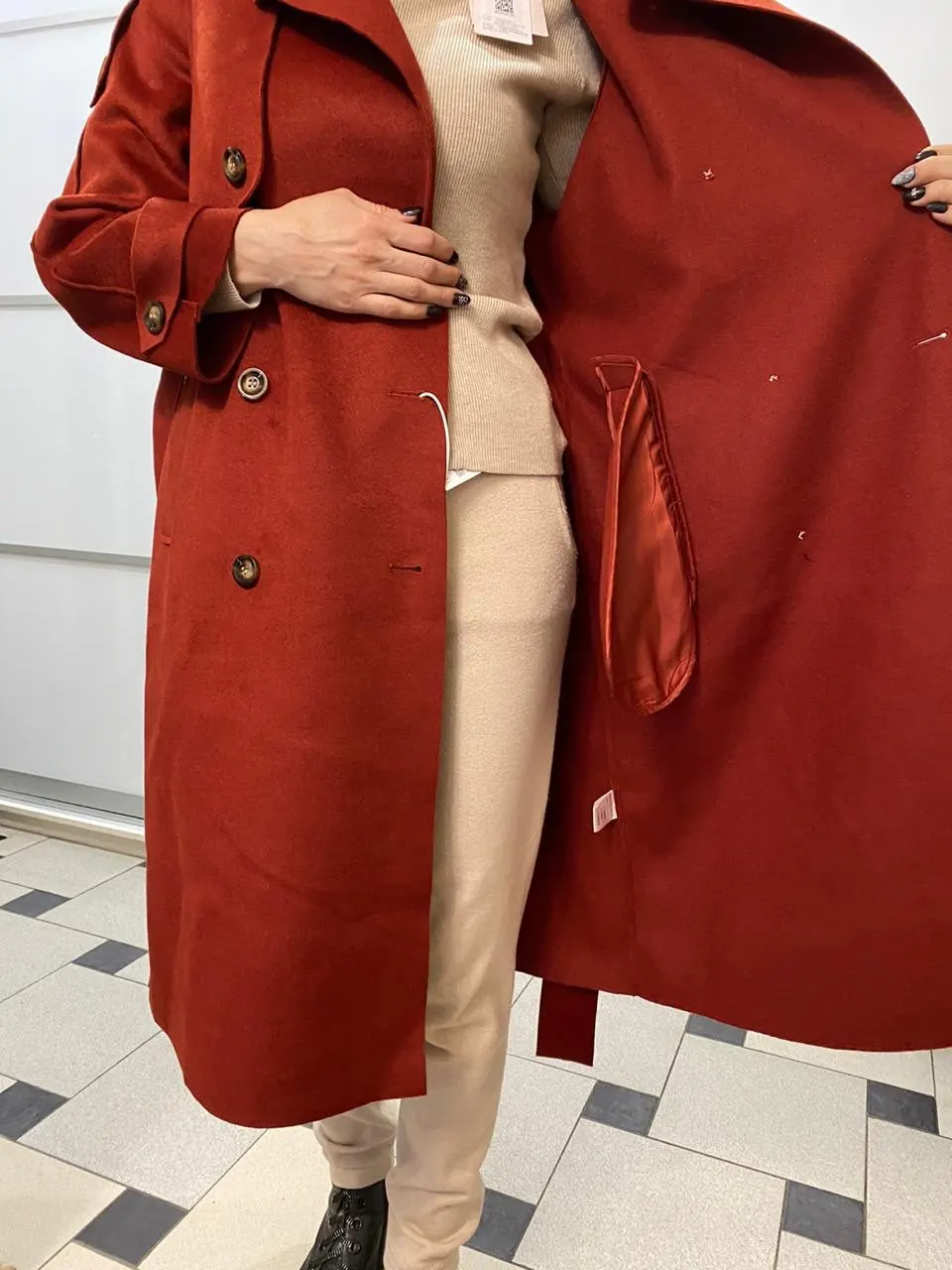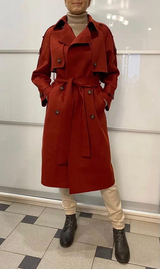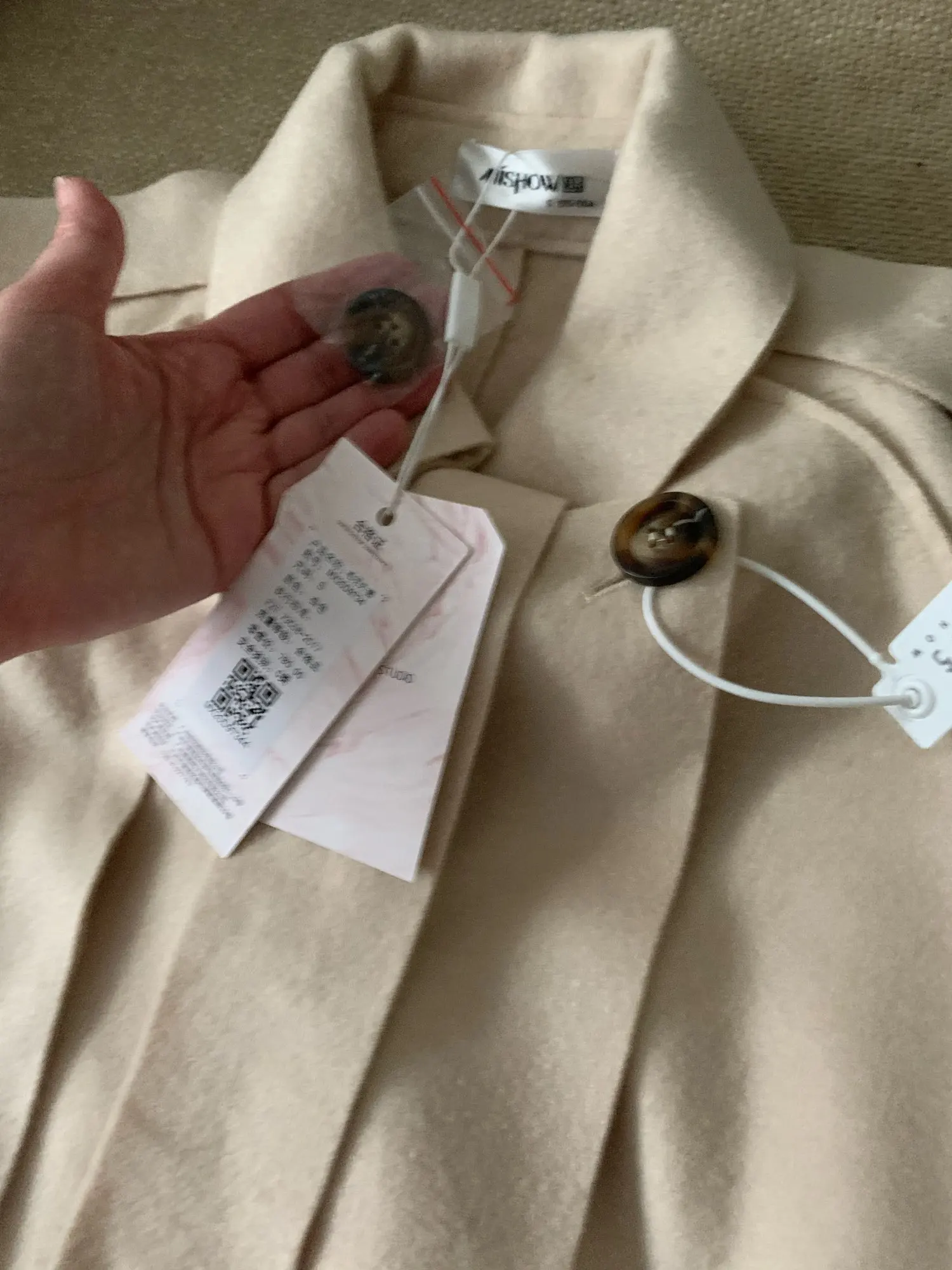 Не ожидала, что пальто будет с необработанными краями , даже пояс просто отрезной. Но ткань не вытягивается, не сыпится, решила все-таки его оставить, тем более цена была приятная. На 167, 89-64-94 село хорошо, можно даже под пальто надеть водолазку или не толстый свитер. Пуговицы придётся перешить, изнутри видны белые нитки. Без подклада.