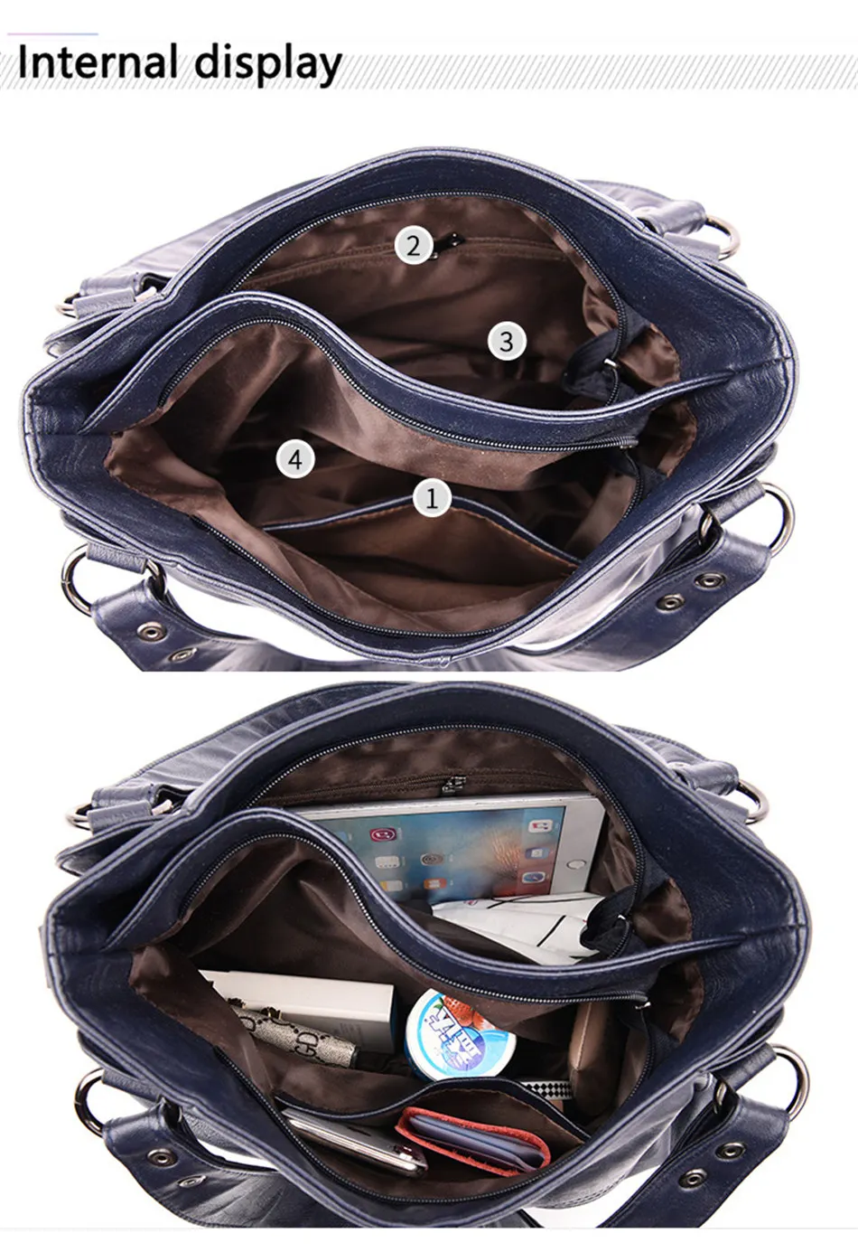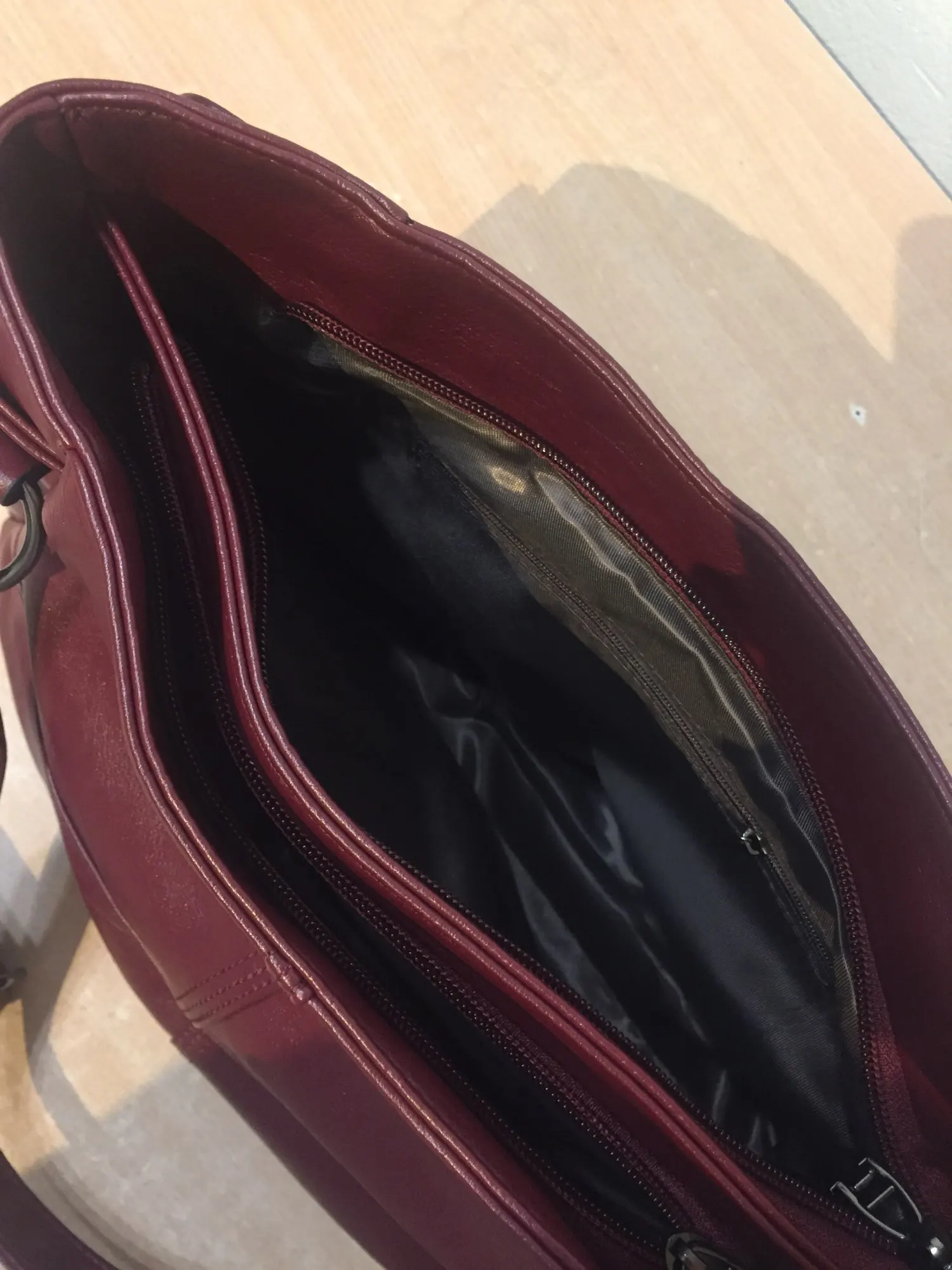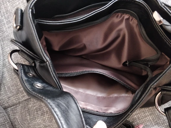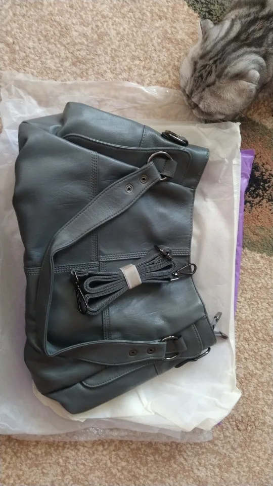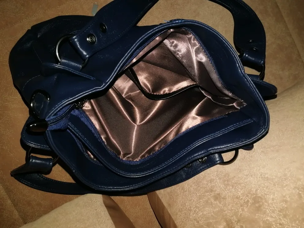 Отличная сумка! Цвет выглядит по-другому, чем на фото из Али. Но в реальности цвет лучше. На моих фото сумка через неделю использования. Два главных отделения на отдельных молниях. Фурнитура выглядит качественной. Внутри все прошито аккуратно. Покупкой довольна.