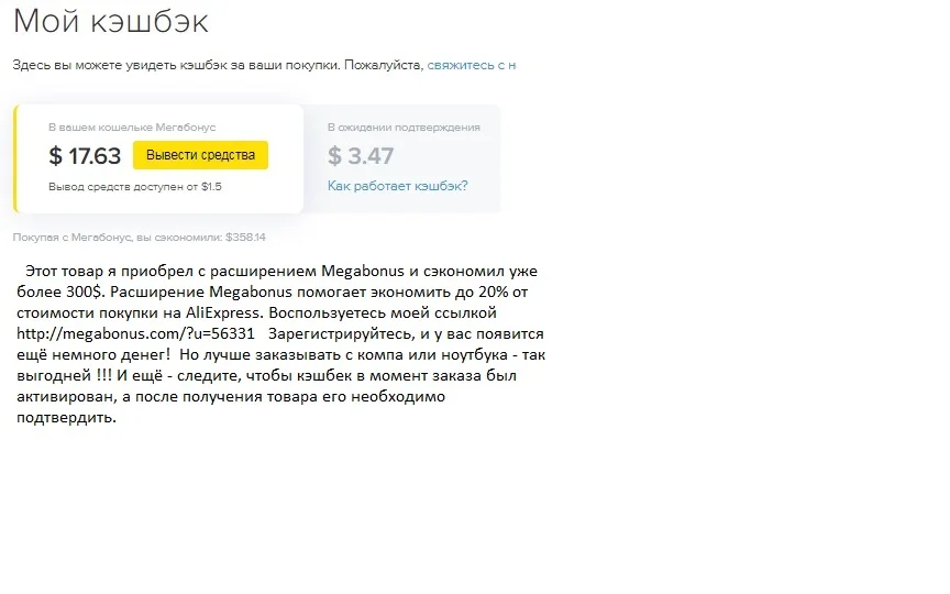 Заказ получен через 15 дней. Проверил - работает. Светит ярко! Всё отлично. У меня претензий нет! Продавца рекомендую. Кэшбек - это возврат части денег при покупке. Этот товар я приобрел с расширением Megabonus и сэкономил уже более 300$. Расширение Megabonus помогает экономить до 20% от стоимости покупки на AliExpress. Воспользуетесь моей ссылкой http://*megabonus*.com/?u=56331 (скопировать ссылку в браузер и убрать две звезды) Зарегистрируйтесь, и у вас появится ещё немного денег! Но лучше заказывать с компа или ноутбука - так выгодней !!! И ещё - следите, чтобы кэшбек в момент заказа был активирован, а после получения товара его необходимо подтвердить.