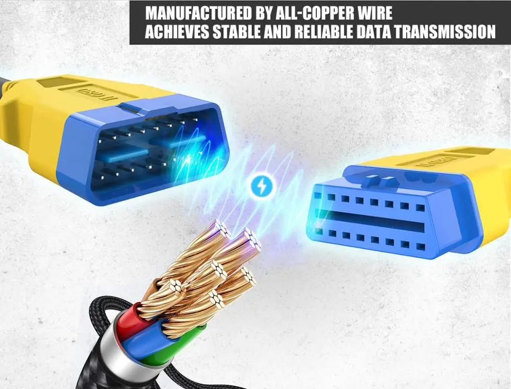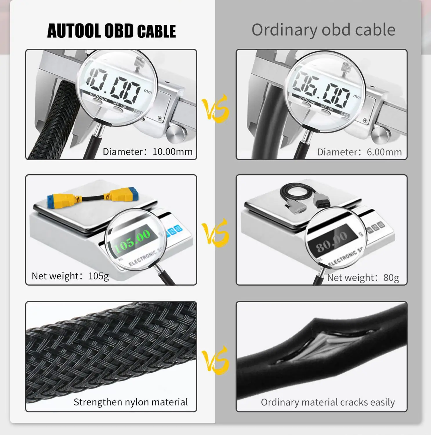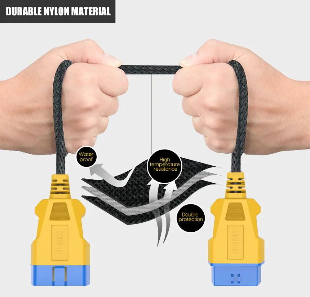 Для улучшенной серии кабелей AUTOOL OBD мы применяем Полностью Автоматическую технологию, используем высококачественный сердечник из чистой меди и пластик с материалами TPE, также покрытыми защитными нейлоновыми плетеными рукавами. Это занимает 8 контроля шагов от литья под давлением для обеспечения кабеля может быть подключен через 10000 раз.AUTOOL 20 см автомобильный OBD2 II 16pin Улучшенный гибкий удлинитель мужской и женский кабель с нейлоновым и противоскользящим материалом, водонепроницаемость, стабильное сопротивление без деформации, дают вам идеальный опыт покупок.