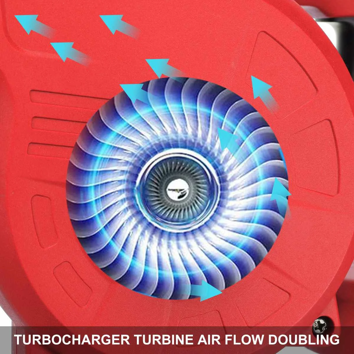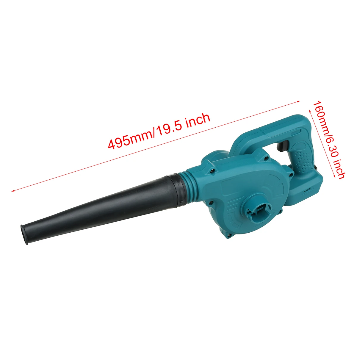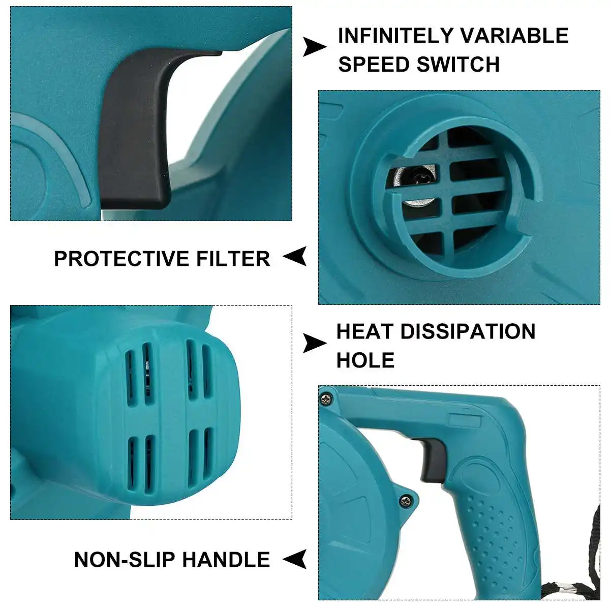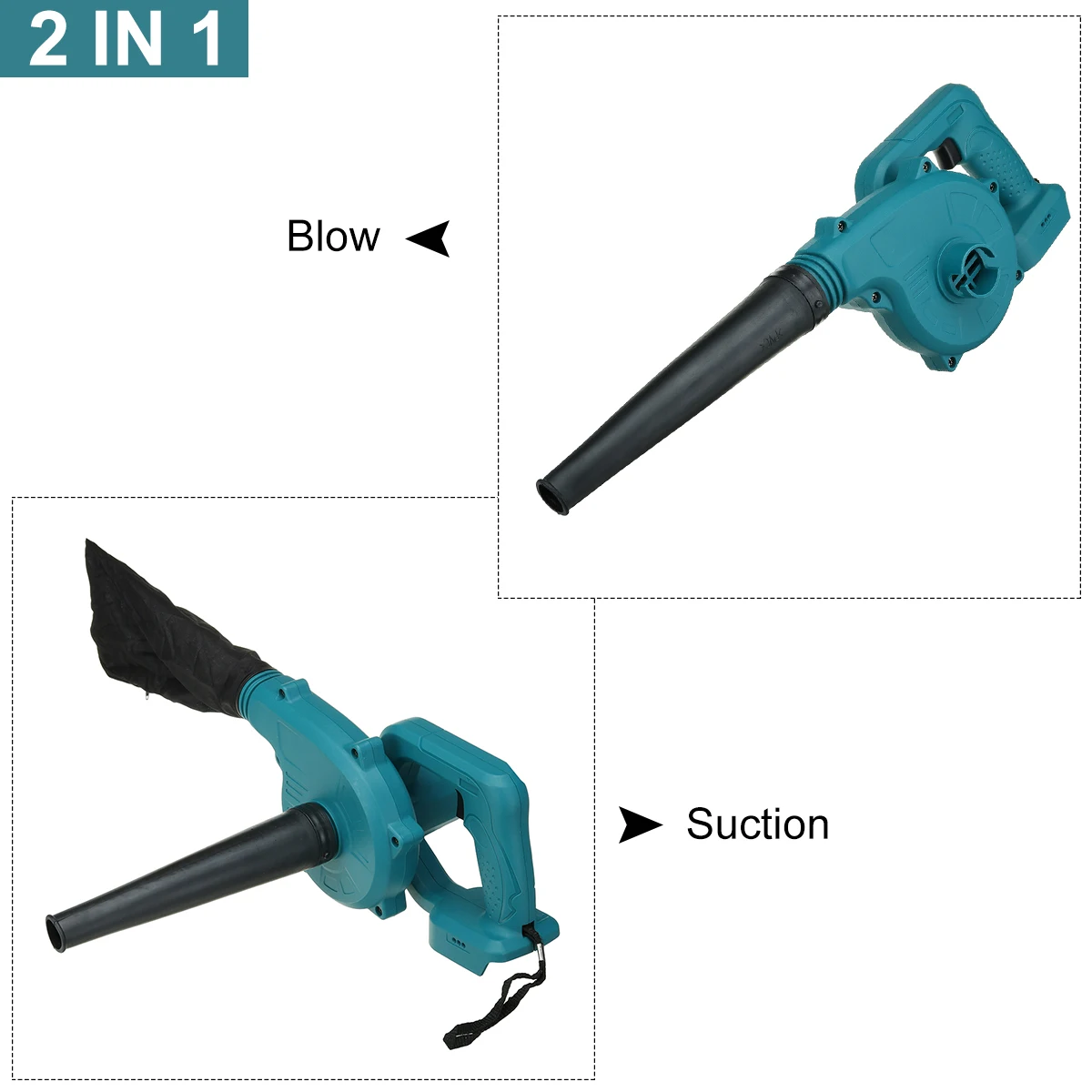 Особенности:-- 2 в 1, функция выдувания и всасывания.-Бесщеточный двигатель обеспечивает ваш инструмент более продолжительным временем работы, большим крутящим моментом и большей мощностью, чтобы уменьшить износ, продлевая срок службы инструмента.-- Ветровое лезвие изготовлено из хорошего АБС-пластика, более прочного и, таким образом, обеспечивает более сильную ветряную мощность.-Компактный, легкий и простой в использовании, вы можете легко использовать его одной рукой. Вентилятор быстро очищает листья и мусор.-Беспроводной дизайн, эргономичный дизайн и хорошее сцепление, наш вентилятор дает вам полную и удобную мобильность.-- Шланг Вентилятора съемный для удобного хранения.-Область применения: пылеулавливание автомобильного двигателя, удаление пыли в компьютерный чехол, выдувание остатков фильтра, выдувание металлических отходов из станков, выдувание опилок, бытовая очистка и удаление пыли, обрабатывайте влажные и сухие листья во дворе и т. д.