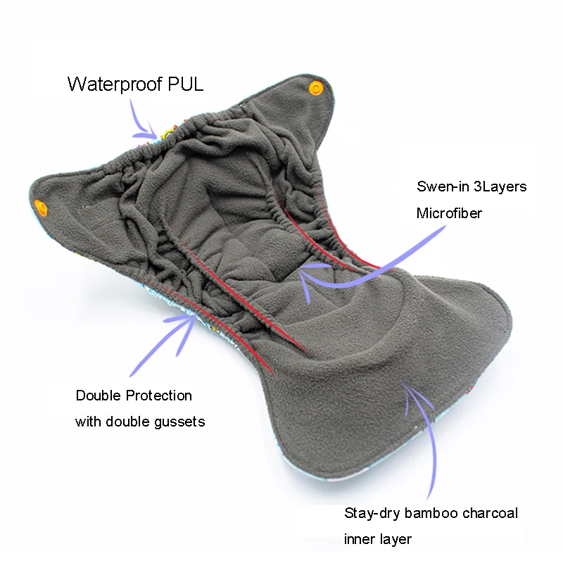 -Внешний слой: водонепроницаемый с принтом PUL/TPU -Внутренний слой:Внутренний бамбуковый угольШвейные 3 слоя микрофибры вставки внутри