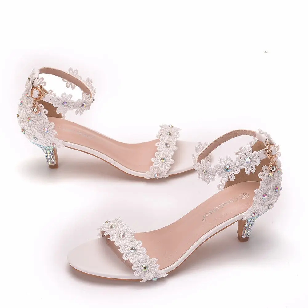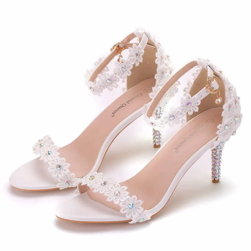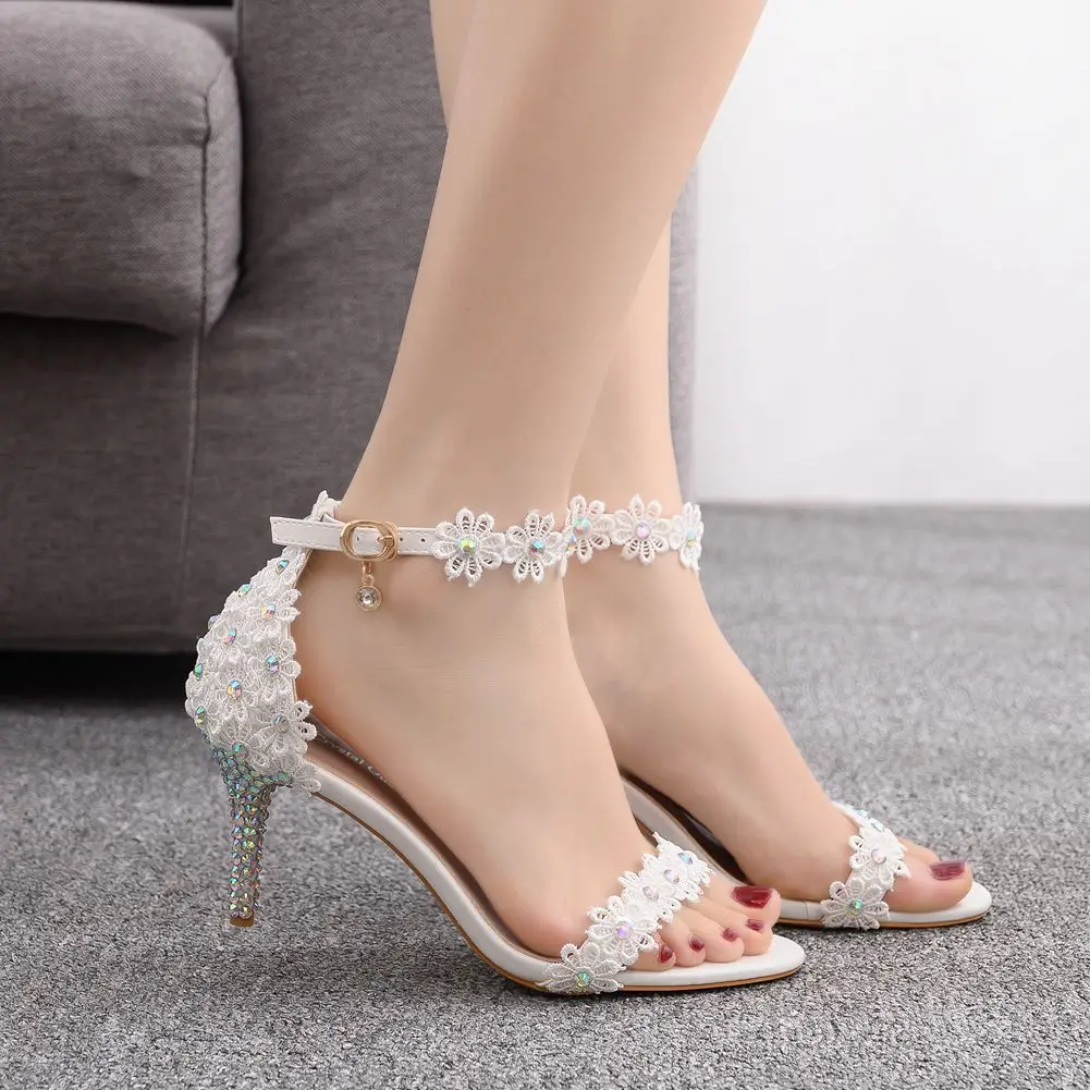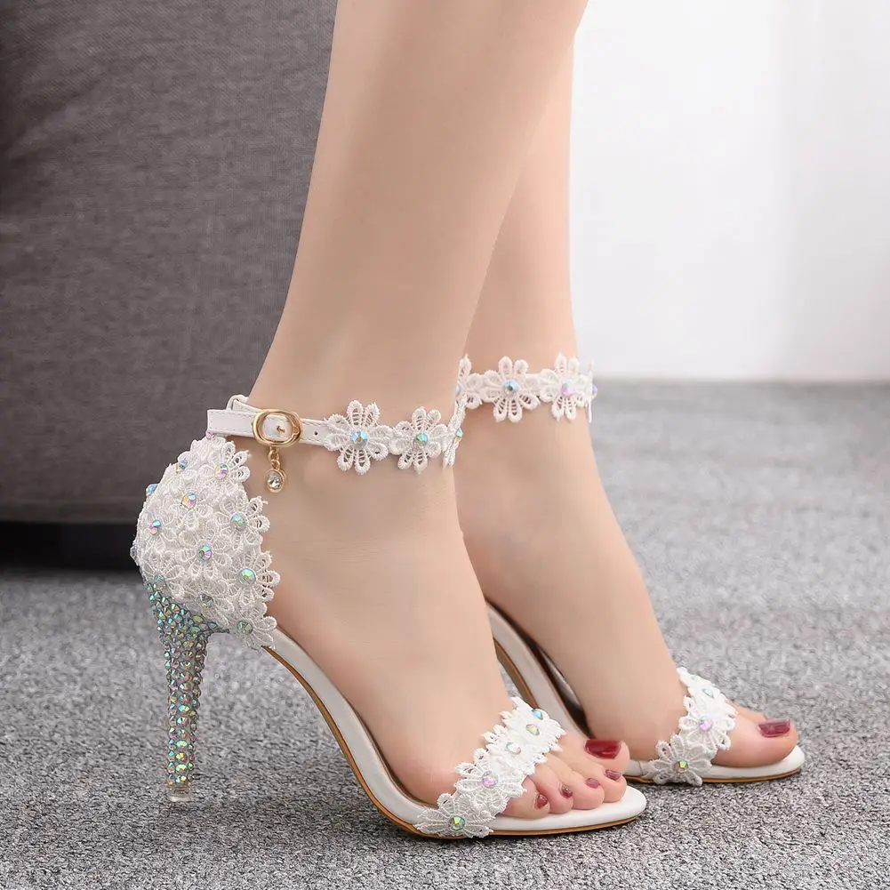 white women's shoesWhite Crystal High Heels Lace Bride Princess Wedding Party Shoes Women 5cm 7cm 9cm 11cm Sandals Ankle Strap Sandals Woman
