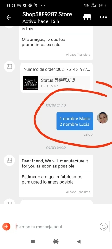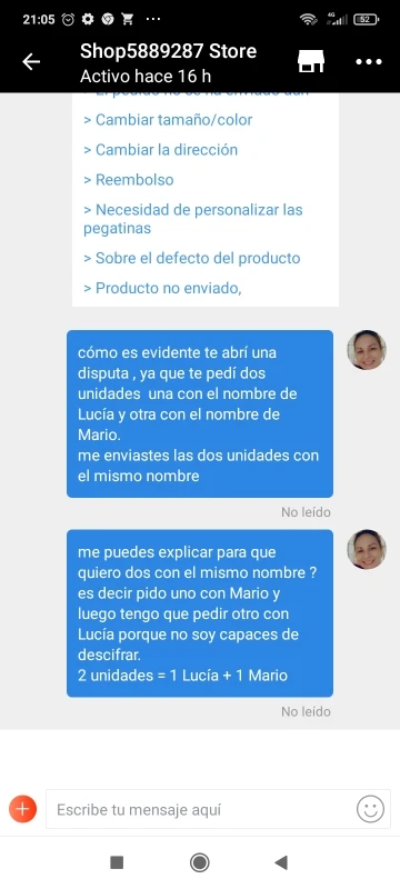 Я заказал 2 единицы, одна с именем Лючия, а другая с именем Марио. Я получил 2 одинаковых (с именем Марио). Я открыл спор и внезапно поговорил с продавцом, AliExpress, как всегда, не хотел принимать спор, и, очевидно, я продолжал открывать жалобы, пока AliExpress не вернул мои деньги. Продавец поставил больше решения, чем AliExpress, что делает невозможным общение с продавцом (он не читал то, что написано ему или не хотел его понимать), решение продавца было отменить спор и отправить мне правильный. Наконец-то AliExpress после нескольких споров и повреждения головы решили вернуть мои деньги. AliExpress каждый день страшнее