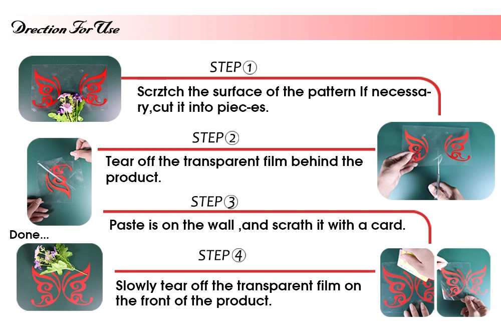 2.Наши наклейки не напечатаны, поэтому они не содержат фона, стены или поверхности, которые вы применяете, будут фоном.