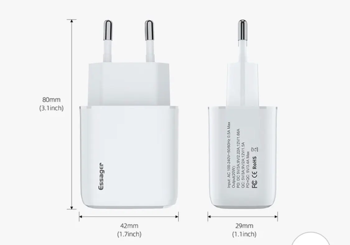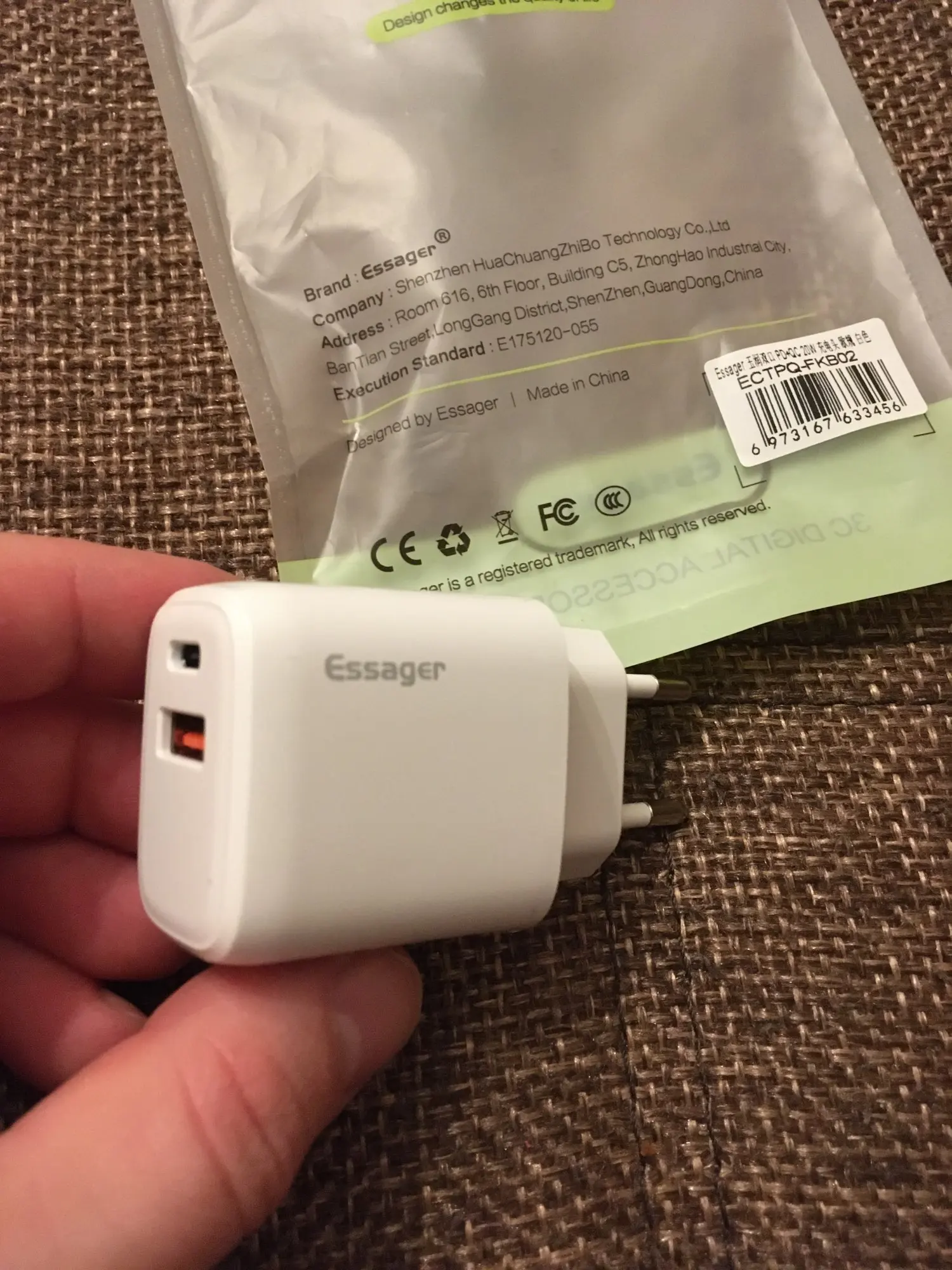 Заказал одновременно две 20 Вт зарядки, Essager и Baseus, спасибо продавцу: зарядные, каждые в отдельном пакете, были вложены в общий пакет и пришли одним отправлением. Доставка заняла две недели. Попробовал оба зарядных, рабочие. Ток и напряжение на выходе, правда, пока не могу померять.